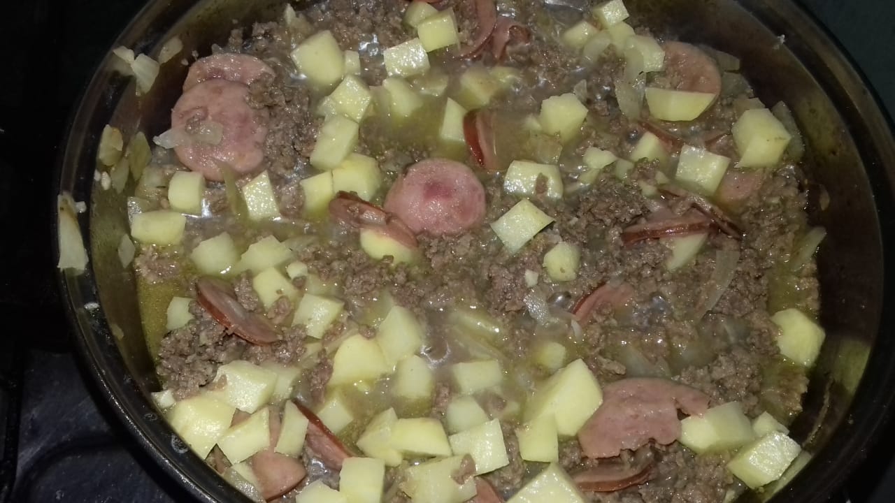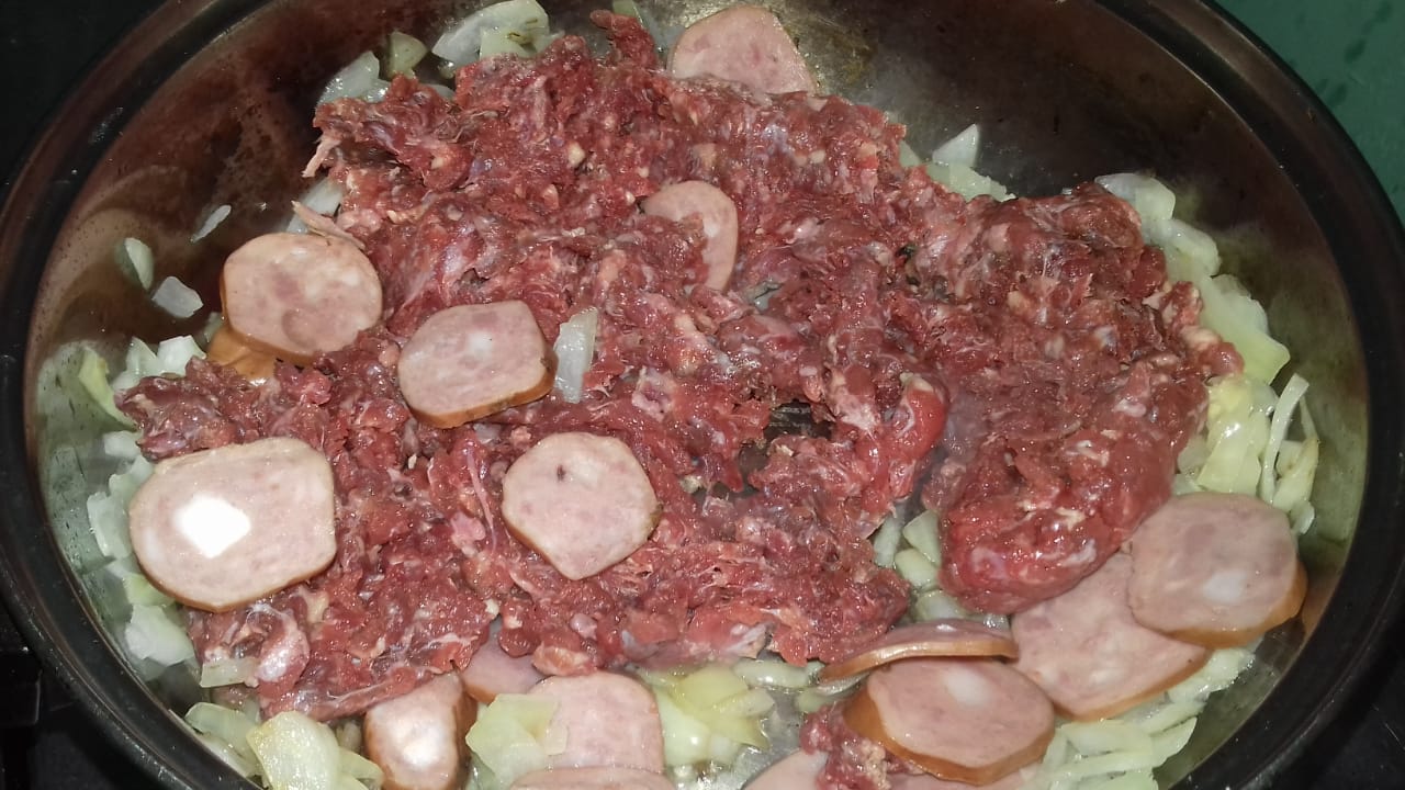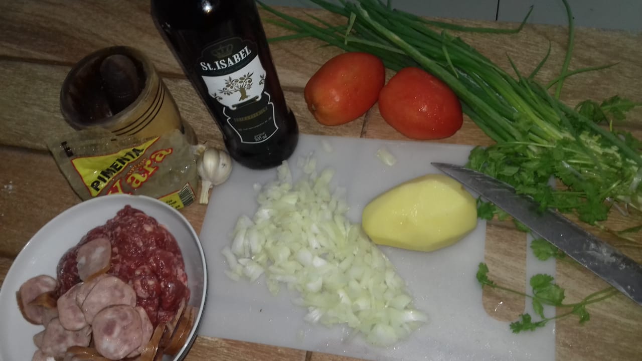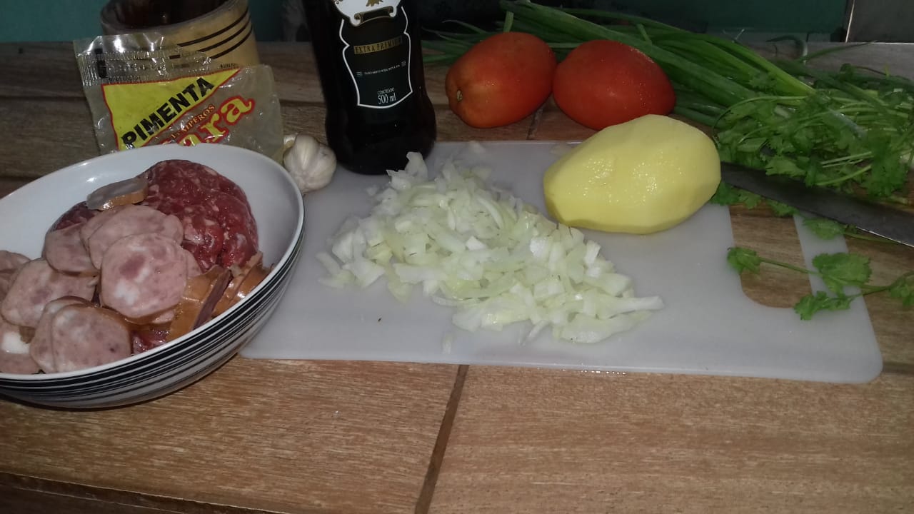 Pour a half cup of extra virgin olive oil into a bowl, then add the chopped onion in pieces with the garlic, let it cook a bit, then place the meat with the Calabresa or smoked sausage and mix everything. Then you proceed to place the potatoes in squares, when the potatoes finish softening you add the chives, parsley and pepper