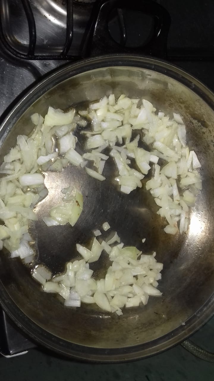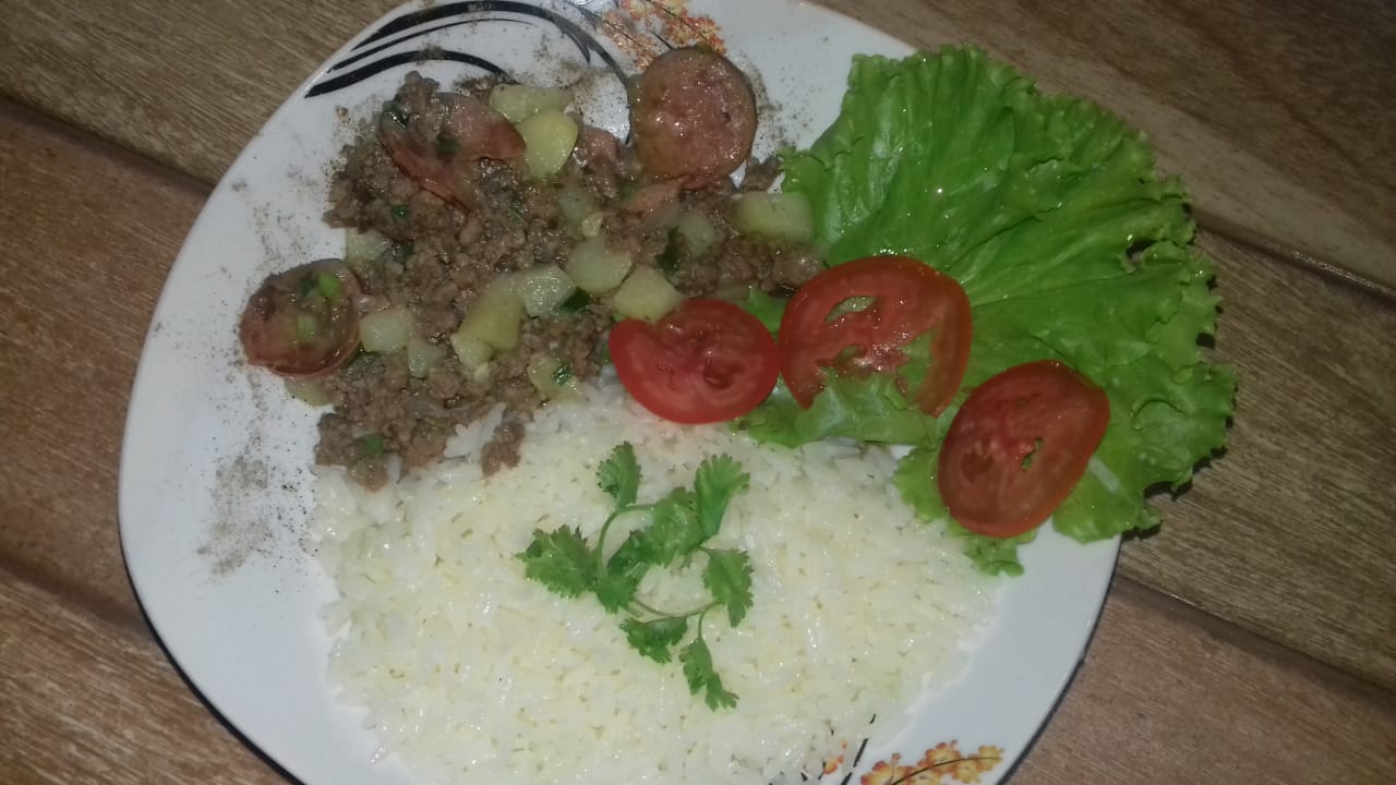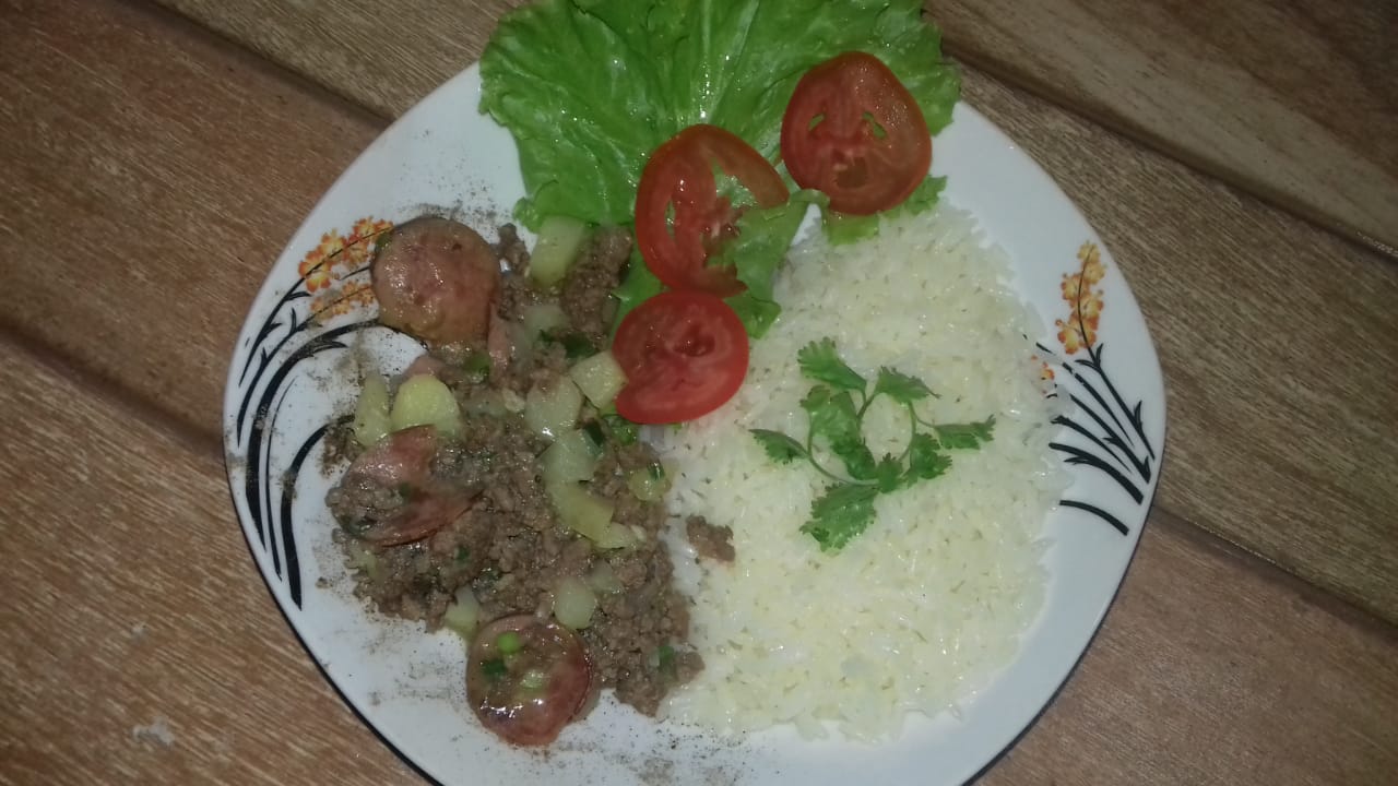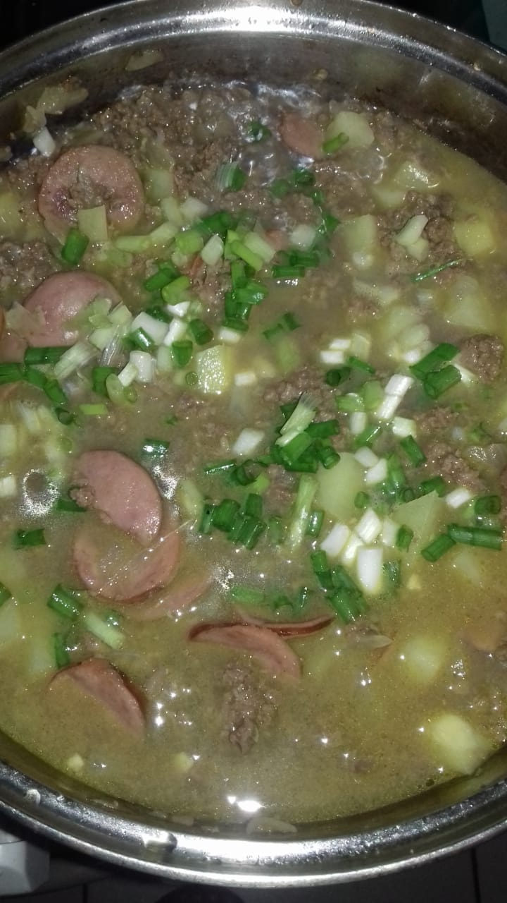 Pour a half cup of extra virgin olive oil into a bowl, then add the chopped onion in pieces with the garlic, let it cook a bit, then place the meat with the Calabresa or smoked sausage and mix everything. Then you proceed to place the potatoes in squares, when the potatoes finish softening you add the chives, parsley and pepper