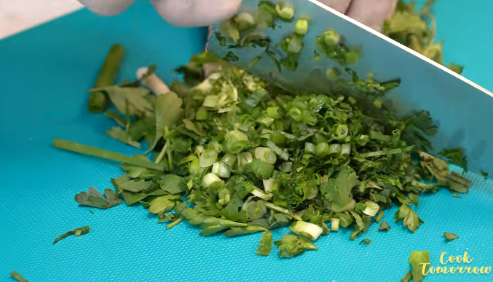 Then we chop the prepared vegetables, ie 30 grams of fresh mint, 30 grams of fresh parsley, 30 grams of fresh onions and 30 grams of fresh coriander, and mix them together as much as possible.