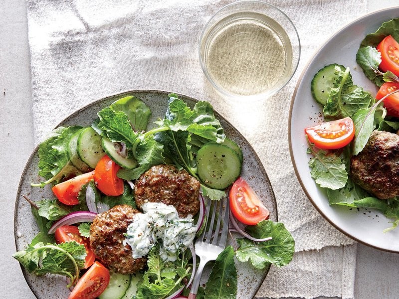 Combine cabbage leaves with lemon and lemon juice. Ring the cucumber and the remaining onion. Divide the cabbage mix between the four plates and place them on loaves, cucumbers and tomatoes. Place two burgers on each salad and then pour the sauce on each one.
