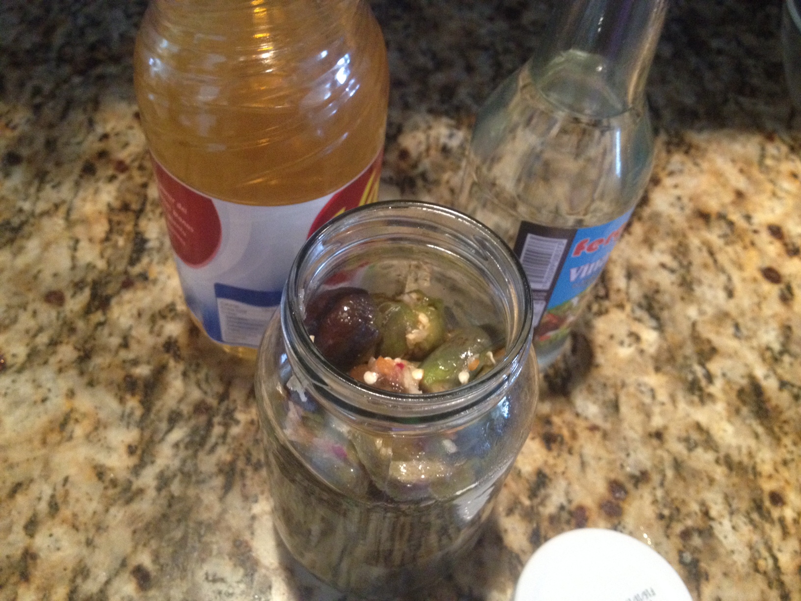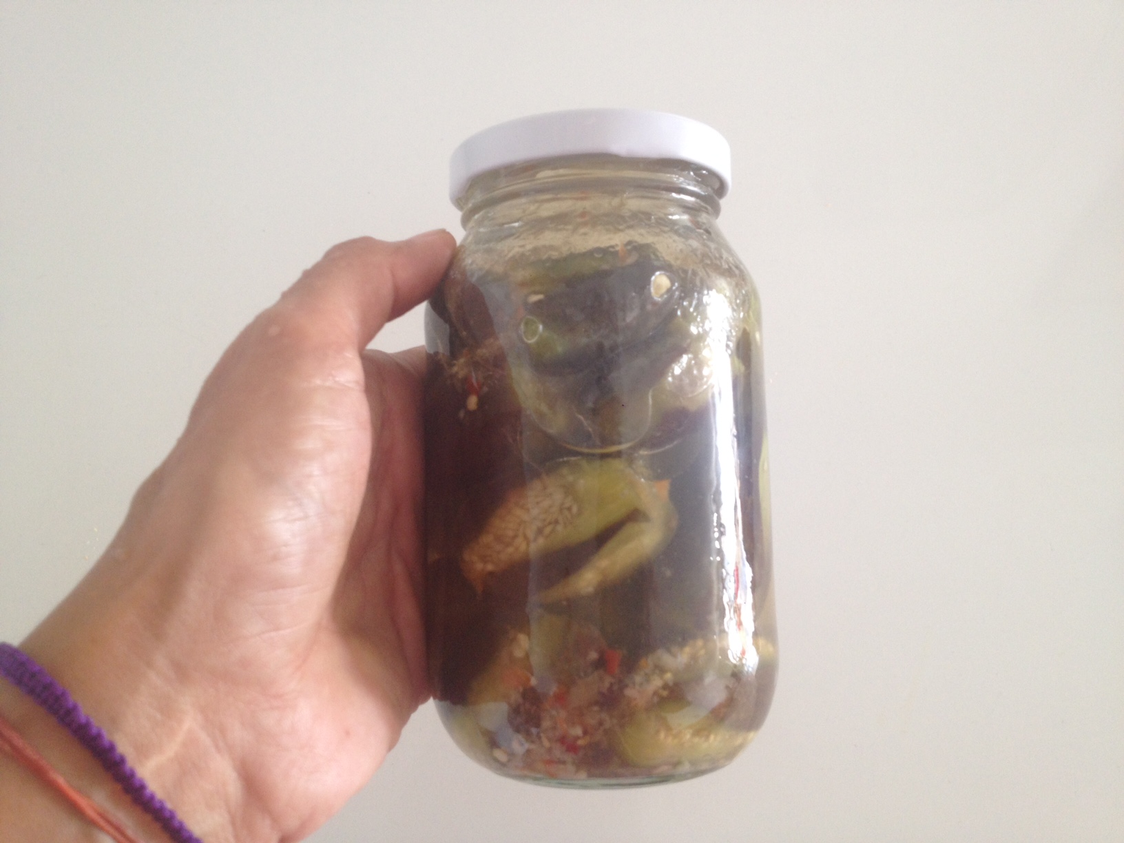Pique el ajo y el ají picante en laminas finas, con esto rellenan las berenjenas. Lugo introduzca las berenjenas, en un frasco de vidrio previamente esterilizado.