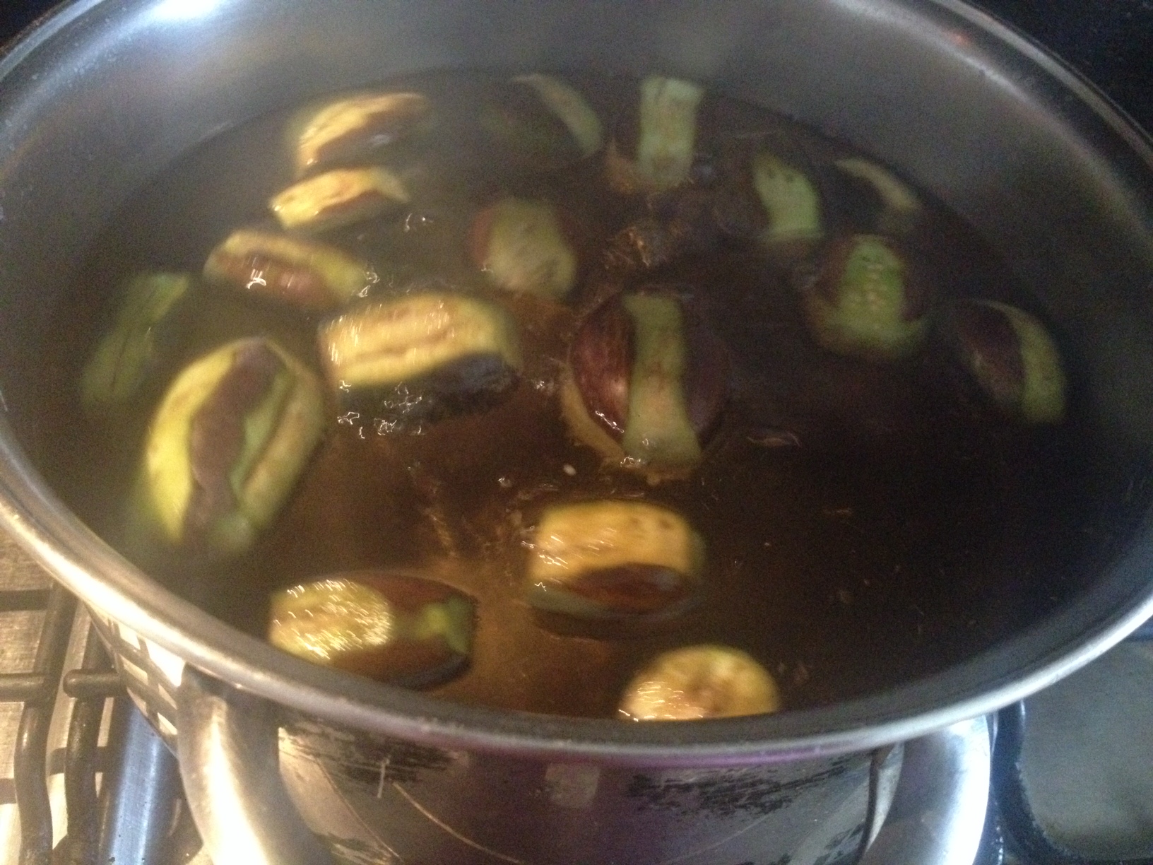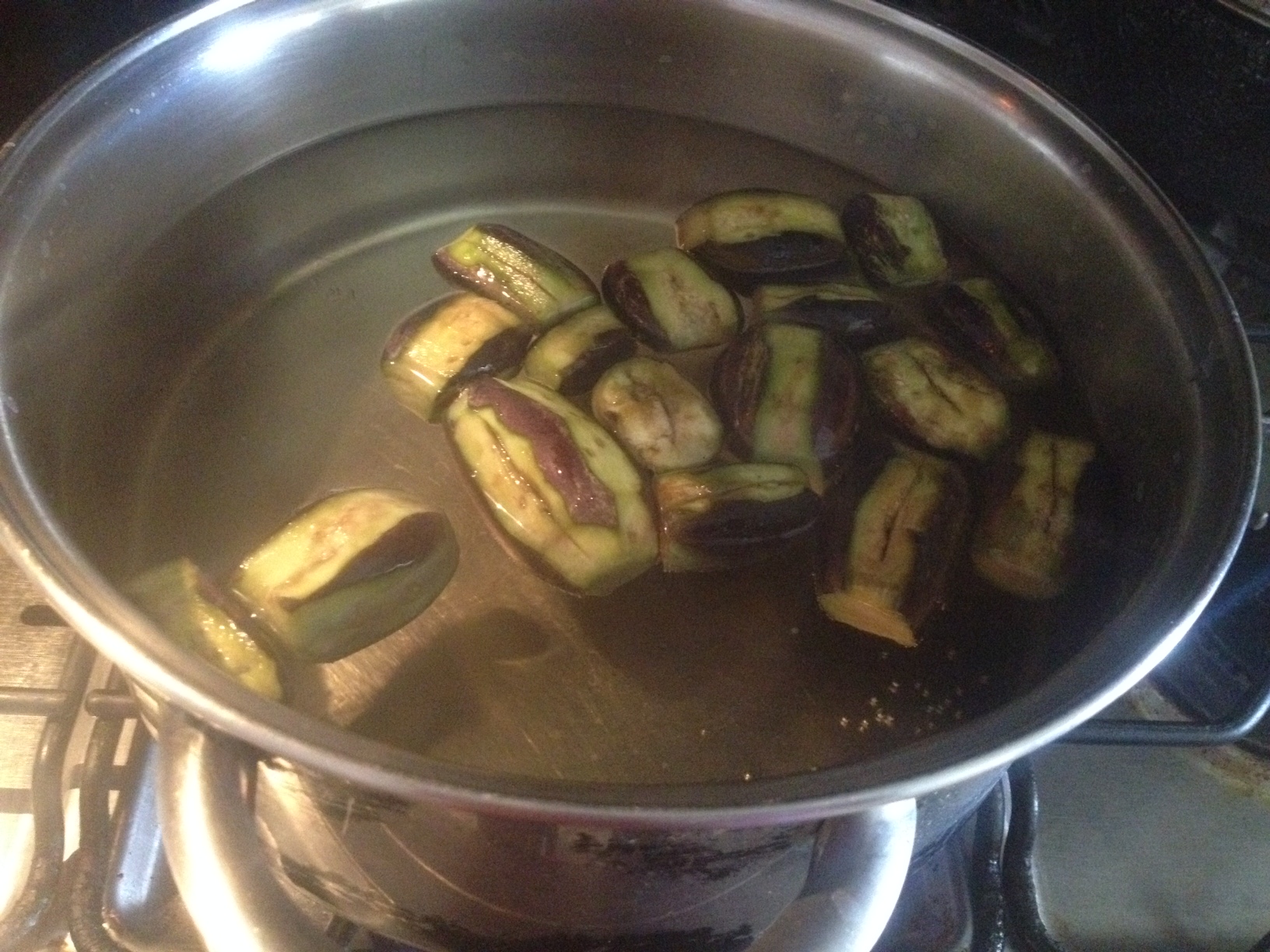 Lave muy bien las berenjenas, quítele parte de la piel, pínchelas con un palillo y hazle una ranura; colóquelas en una olla con agua y llévelo a fuego alto, por 10 minutos.