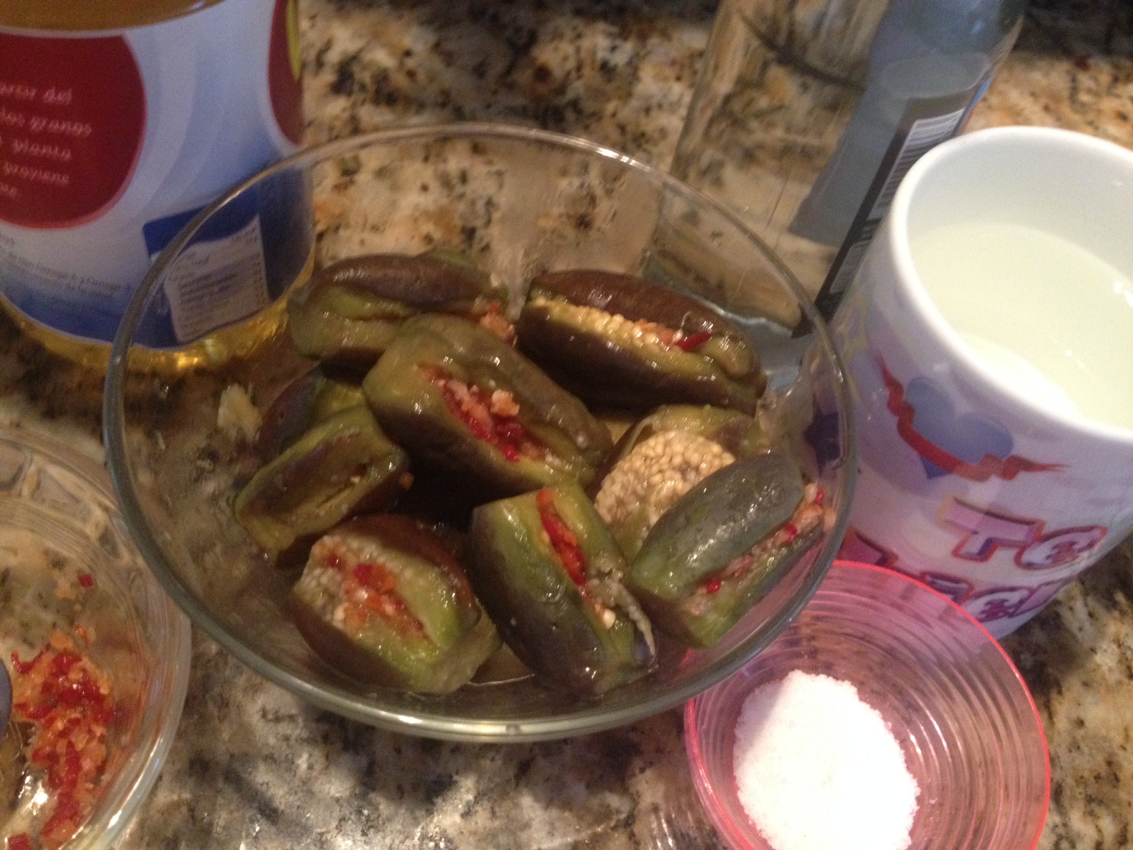 Diluye la sal en el agua y añade el vinagre, eche este liquido al frasco donde tenemos las berenjenas, y por último coloque el aceite
