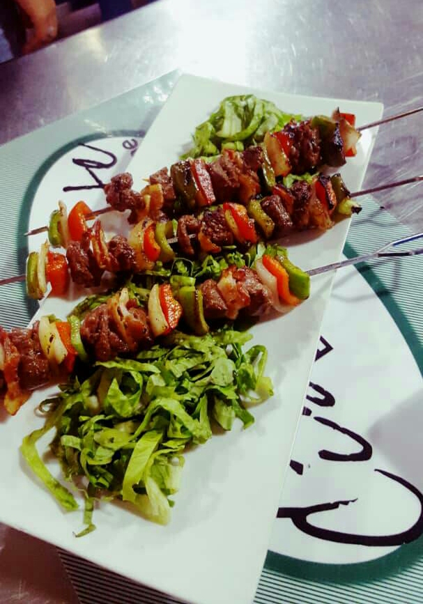 Trinchamos en pinchos metálicos y de forma alterna Lomito, Tocineta, Cebolla, Pimentón, salpimentamos en un toque de aceite, flambeamos en un toque de Brandy, las servimos en una cama de lechugas cortadas en chifonada, y las bañamos con una reducción de fondo de carne previamente salpimentado.