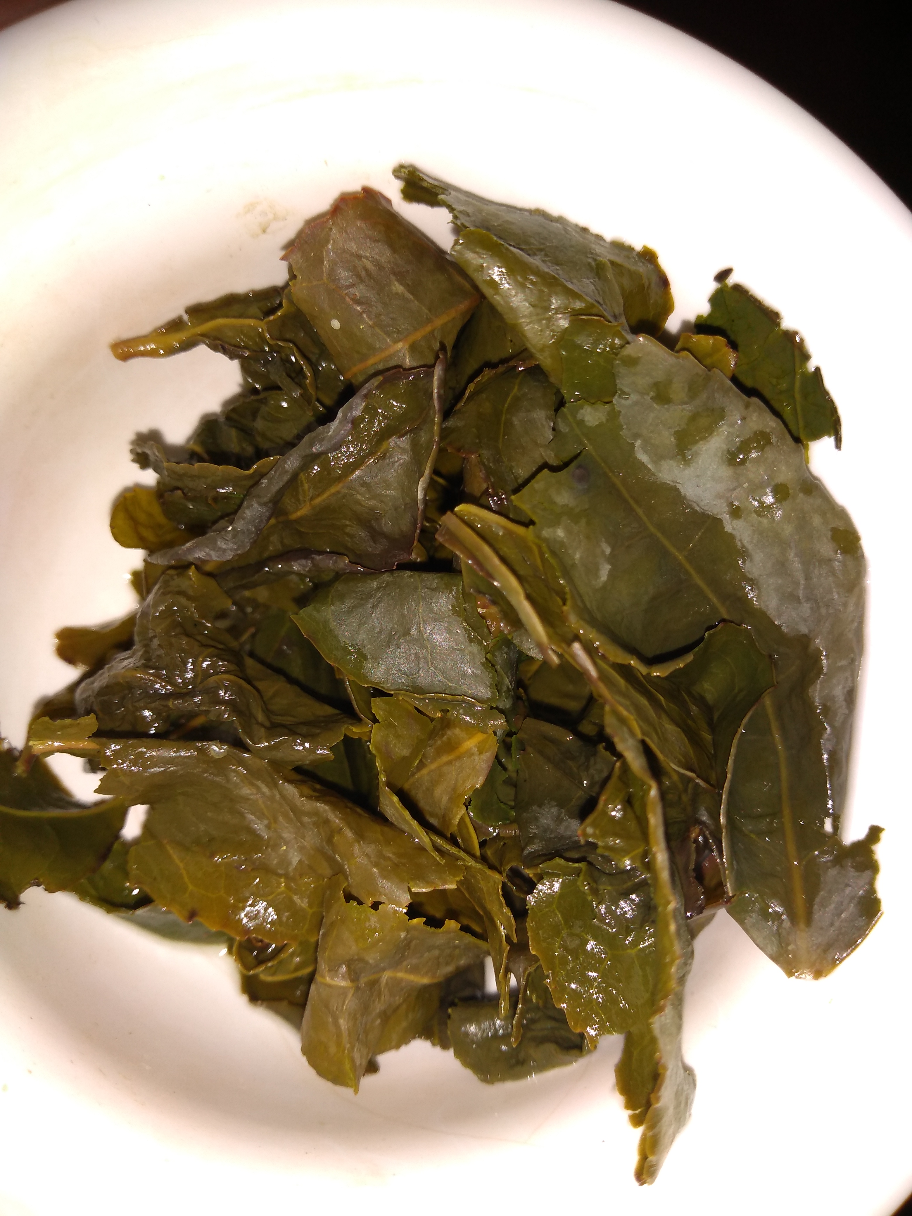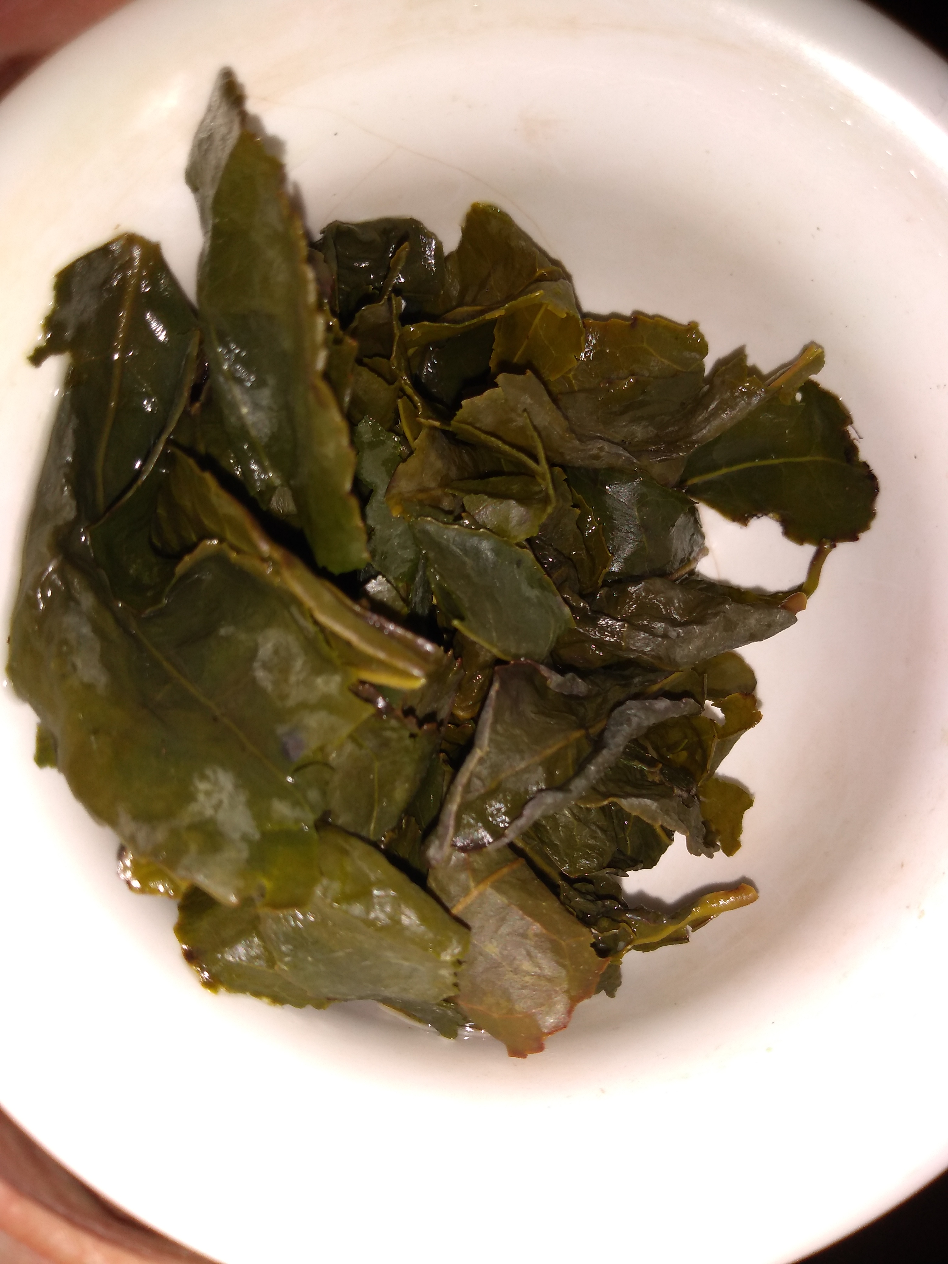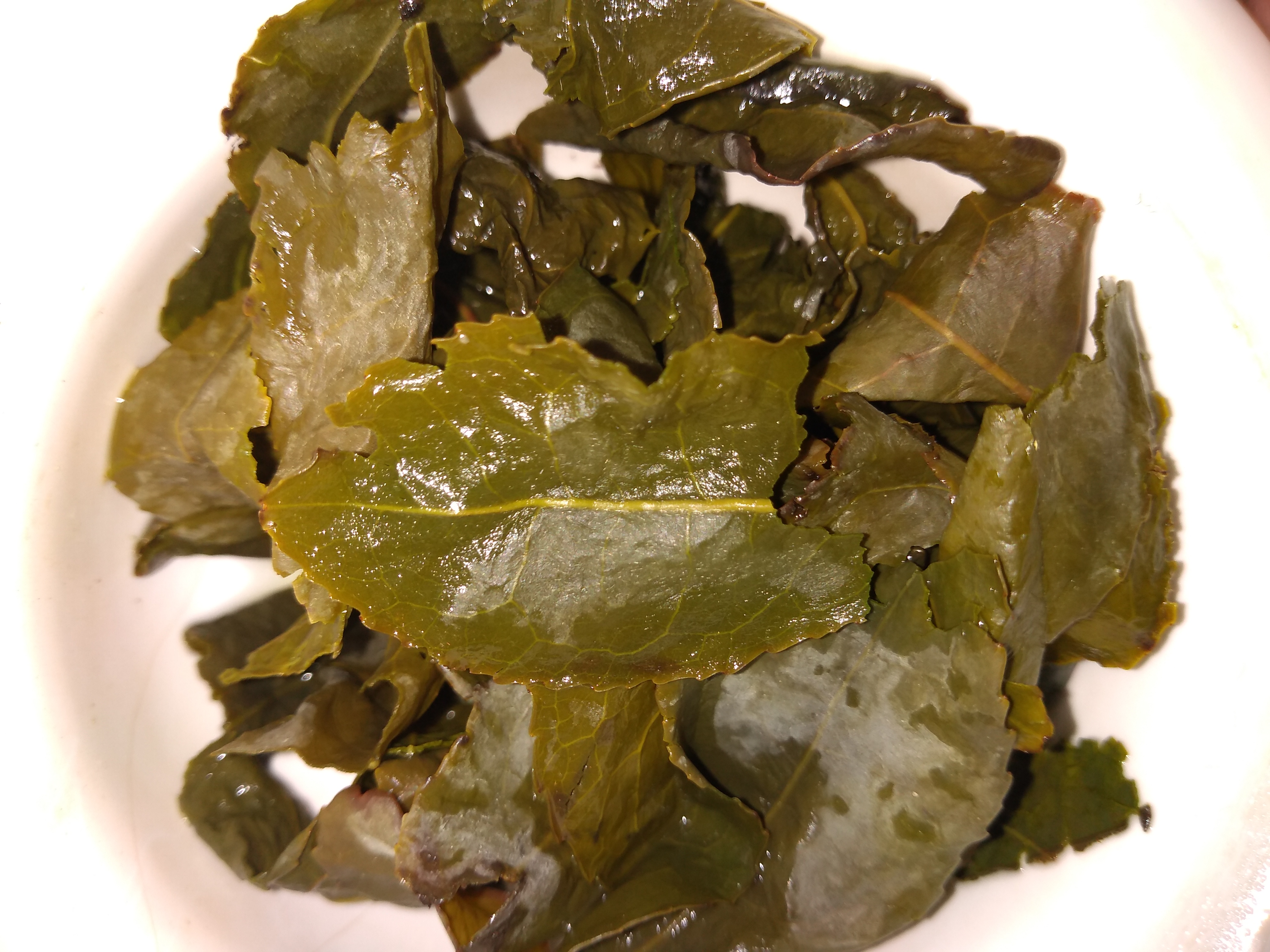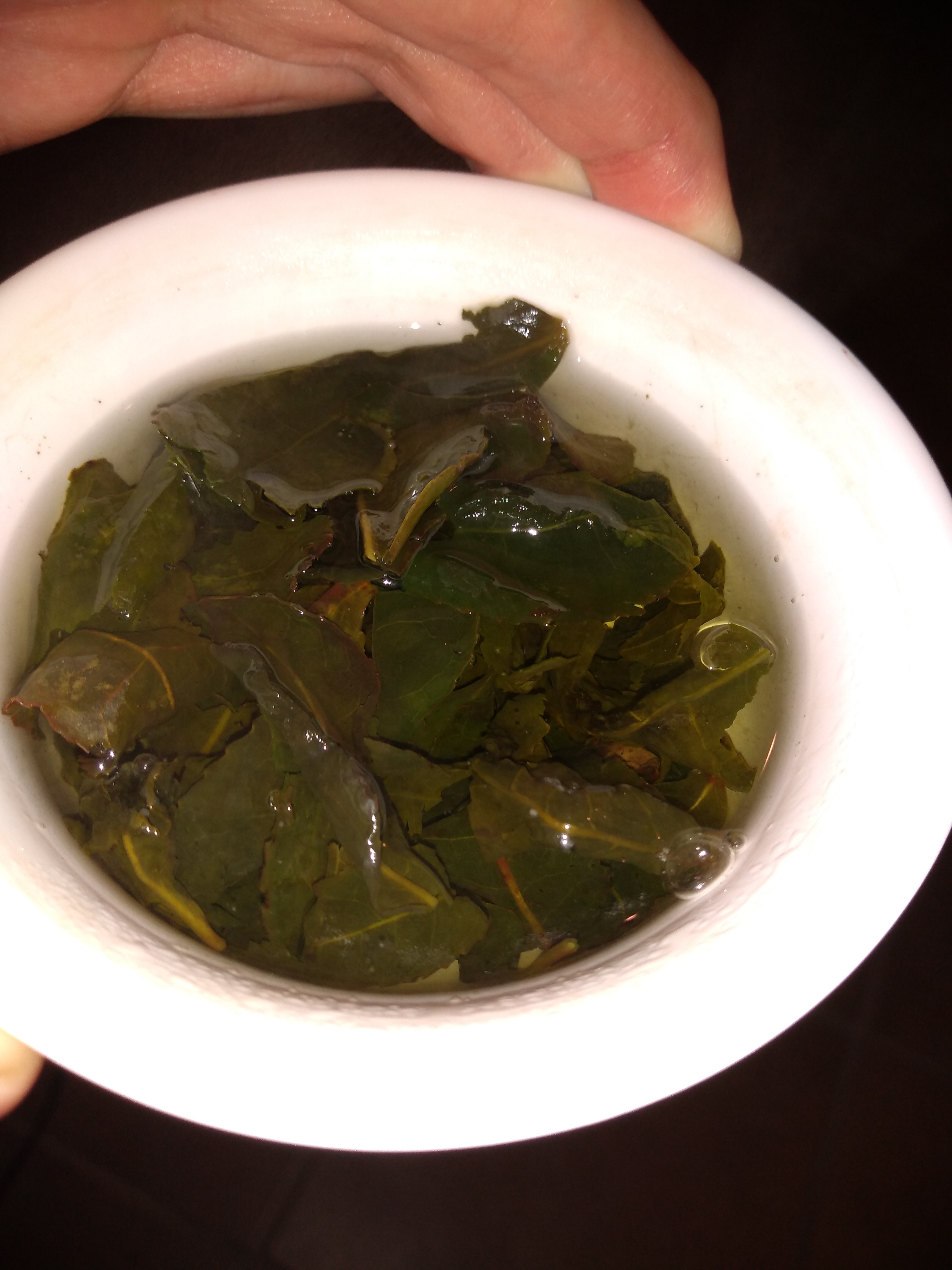 The fifth infusion is almost odorless, perhaps a bit vegetal. The flavor is vegetal and smooth, but there is still a hint of the floral notes that are present in abundance in the second infusion. The leaves themselves still have a strong vetetal, wet hay scent.