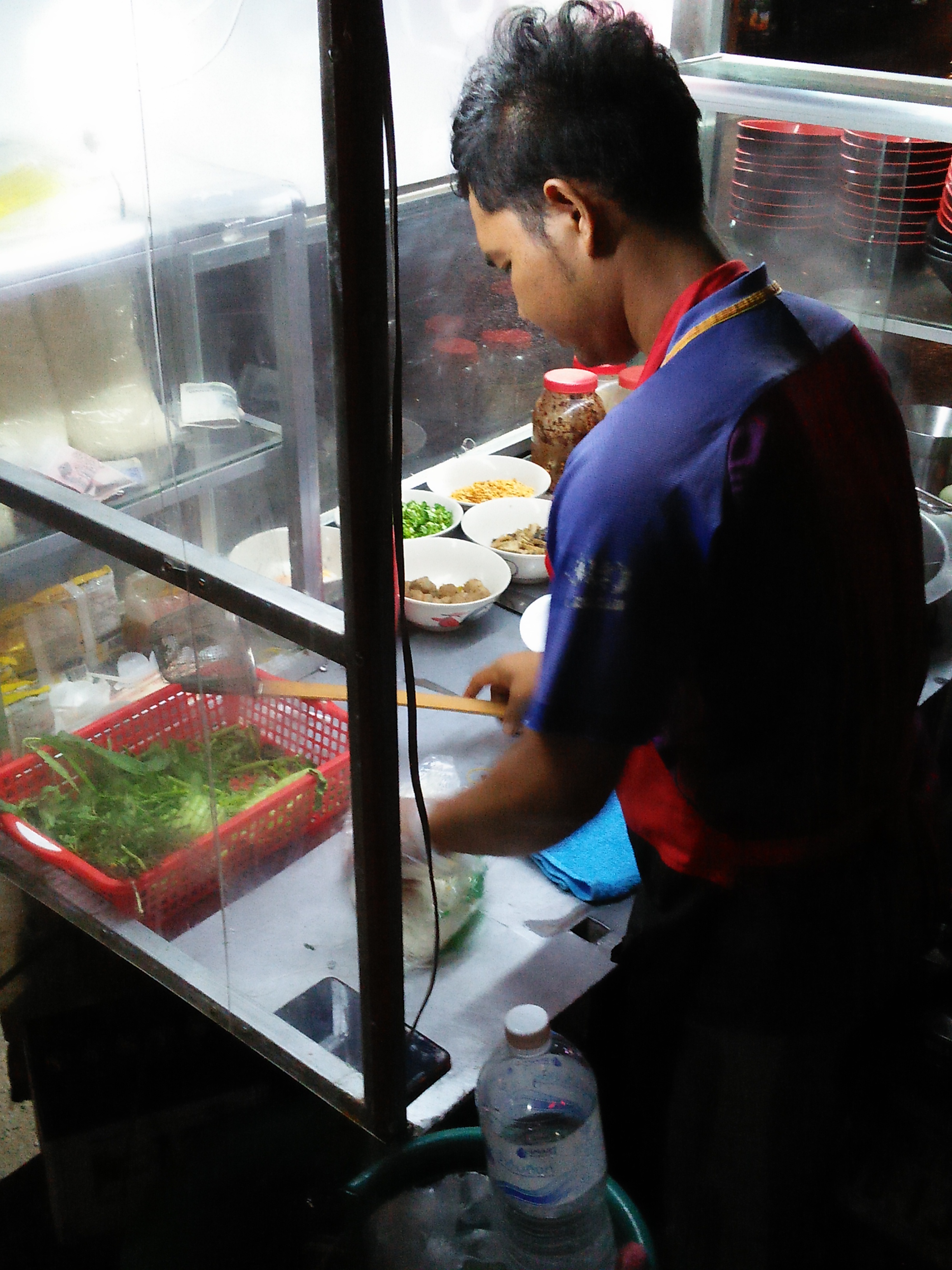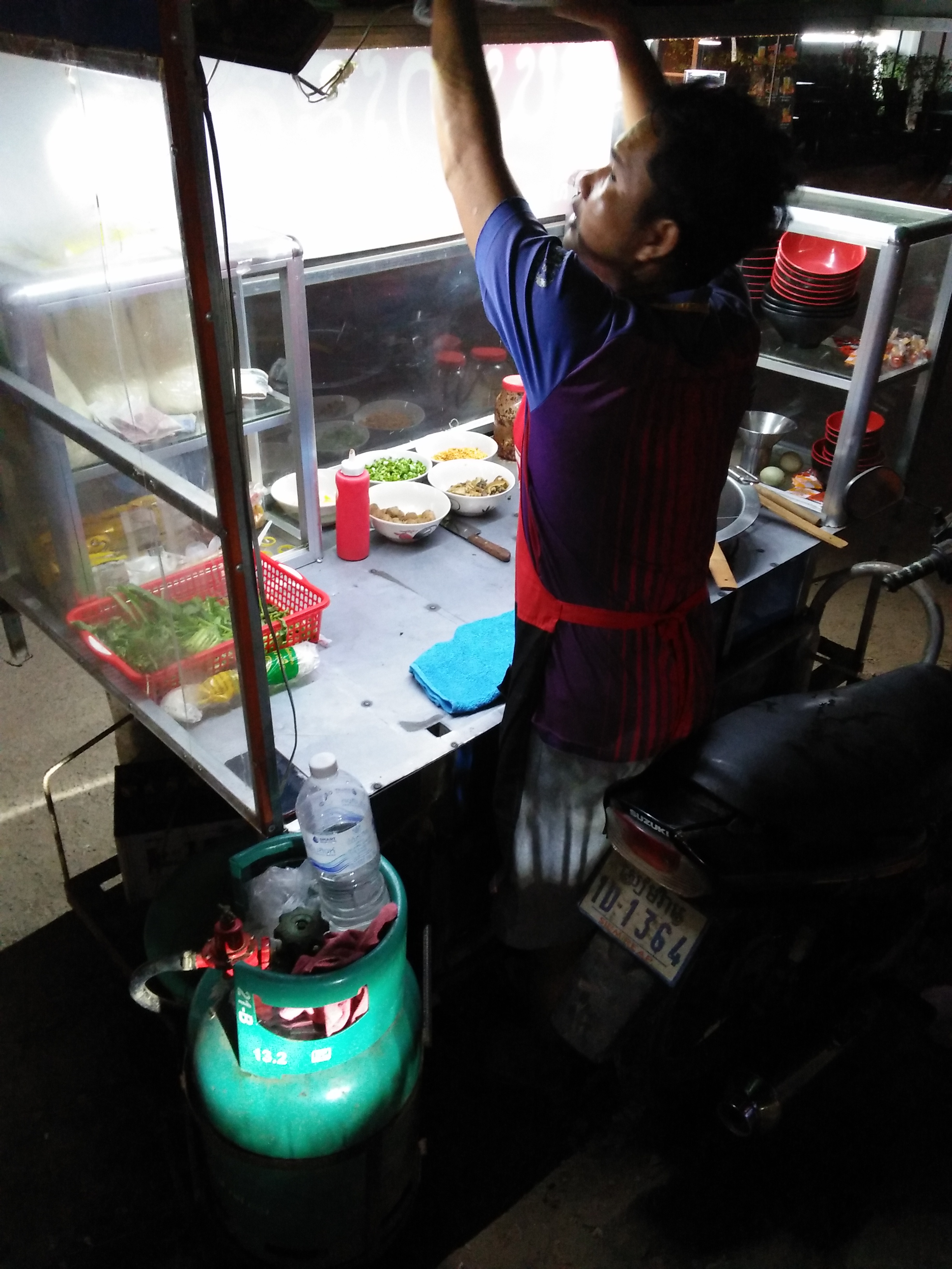Next to the noodle cart were some to small for me to sit on red plastic chairs, where a local was enjoying one of the concoctions this noodle seller apparently was capable of preparing with the ingredients at hand.
