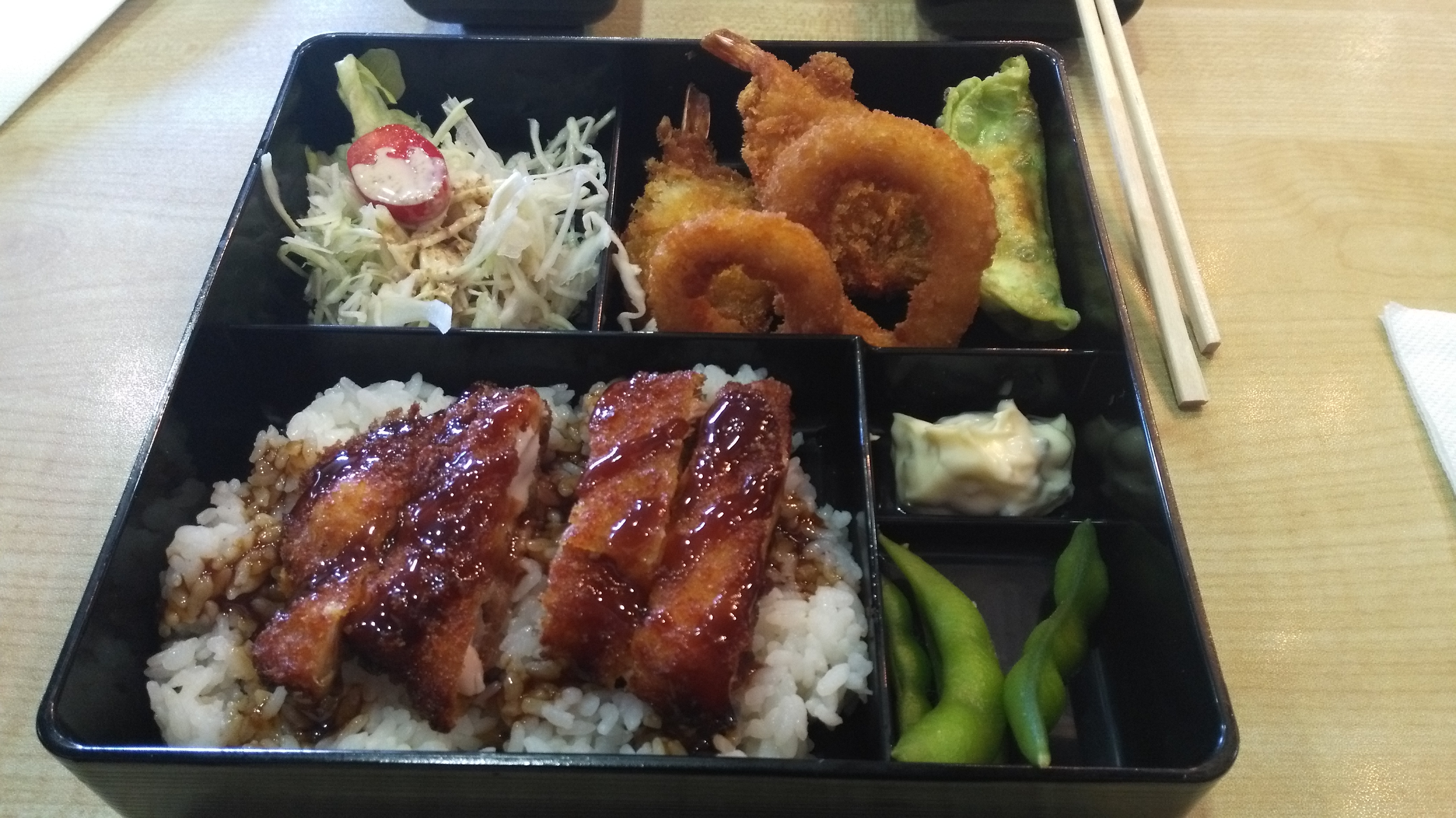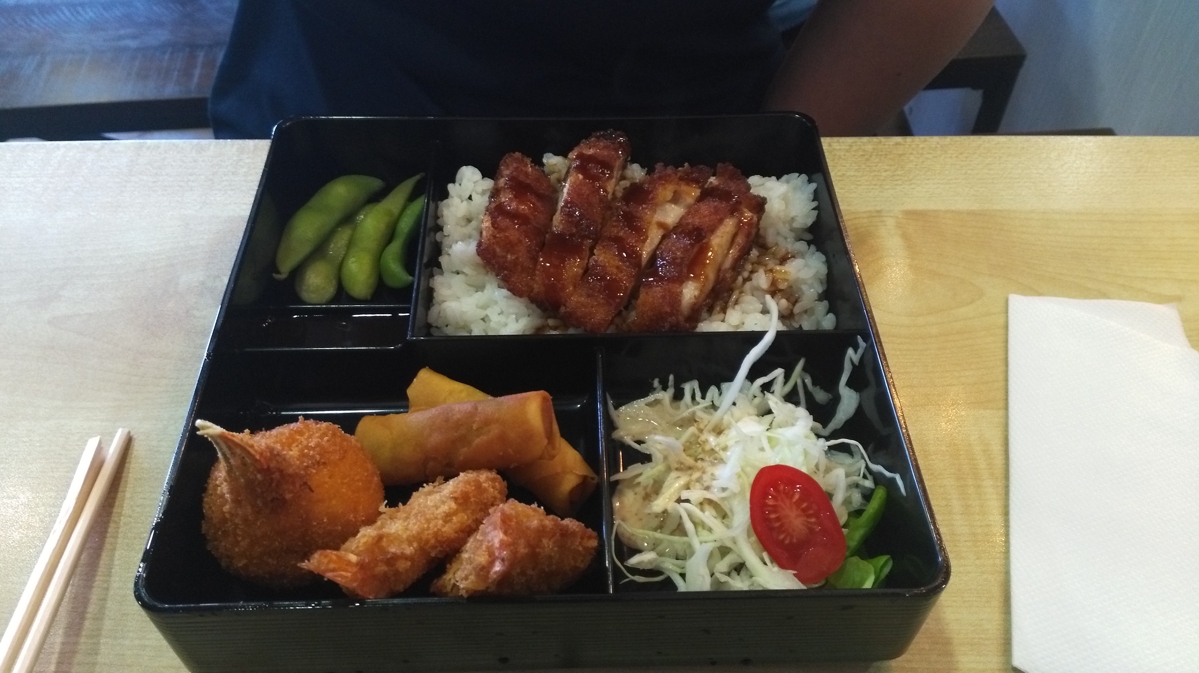 This second Bento set comes with Katsu Chicken, topped with BBQ sauce, and for the 3 sides I chose Onion Rings, Prawns and Vege Gyoza.