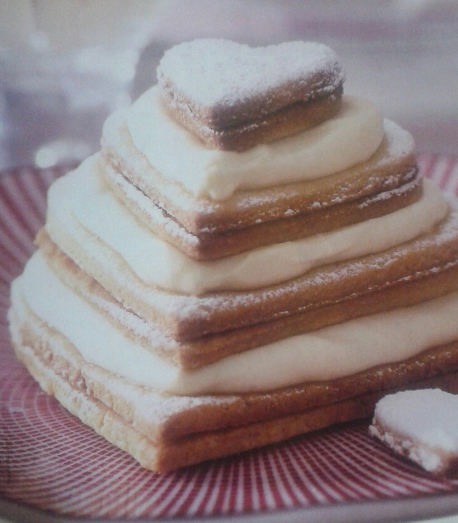 - Bate la crema de leche hasta que se ponga sólida. Cuando los corazones se hayan enfriado, espolvoréales el azúcar en polvo. Une los corazones del mismo tamaño de 2 en 2, fijándolos con un poco de crema de leche. Pasa dos parejas de corazones grandes a cada plato y ve formando el dulce con corazones de tamaños escalonado, como si fuera una torre, intercalando entre cada capa una buena cantidad de crema de vainilla. Termina espolvoreando azúcar.*