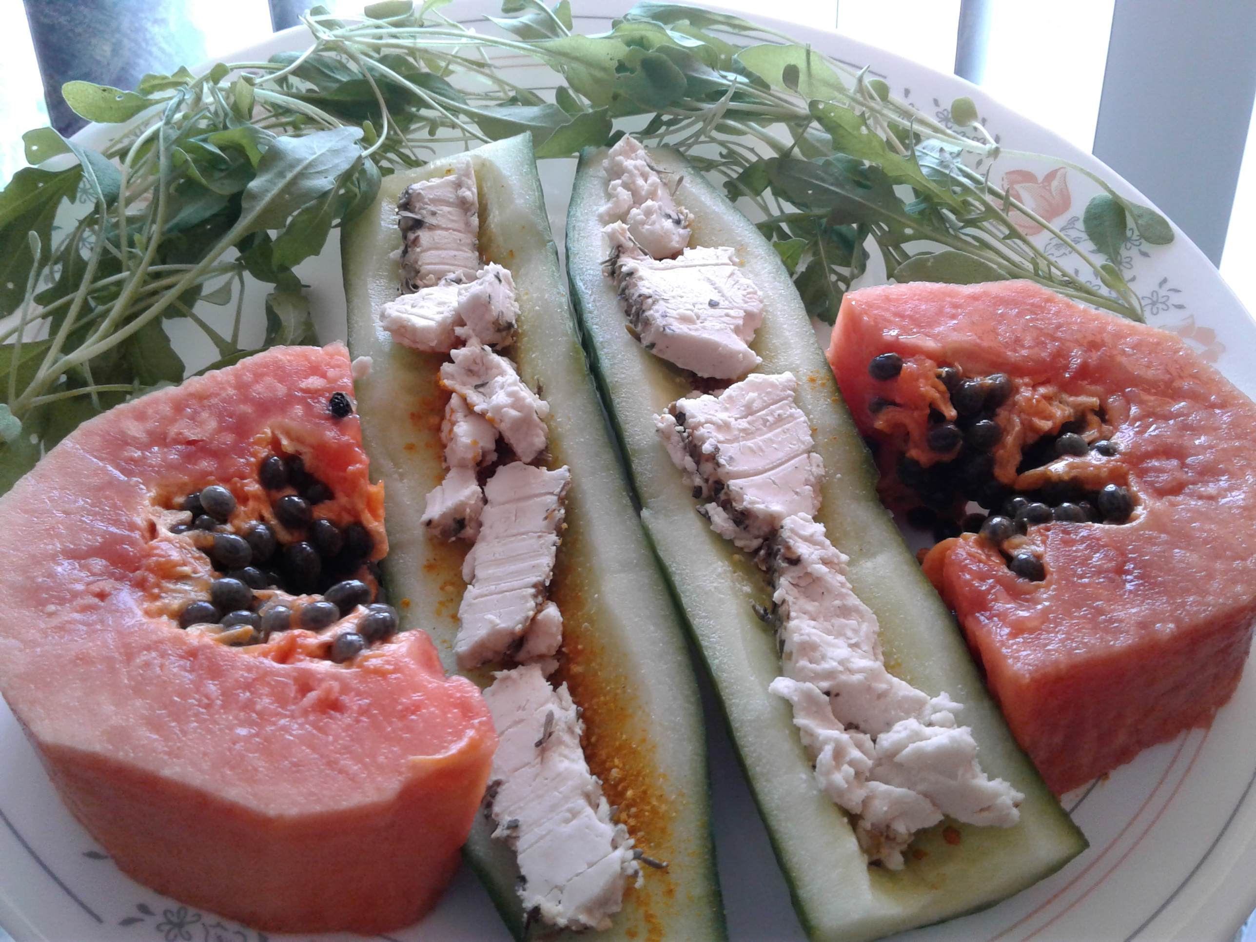 This last one was just a convenient way to enjoy some Cashew Cheese I decided to adventure into whilst at a local Vegan Fair selling all sorts of artisan creations. Note, I rarely eat specialty stuff like this simply because it is unnecessary in the diet, and I don't miss dairy-based cheese. So, to balance out the dehydrating nature of mildly astringent fermented foods I hollowed out an organic Cucumber, sprinkled it with Turmeric powder and layered on the cheese. Some nourishing Papaya was added to the mix along with fresh Wild Arugula because again, I love it and have lots of it. You use whatever greens you like :-)