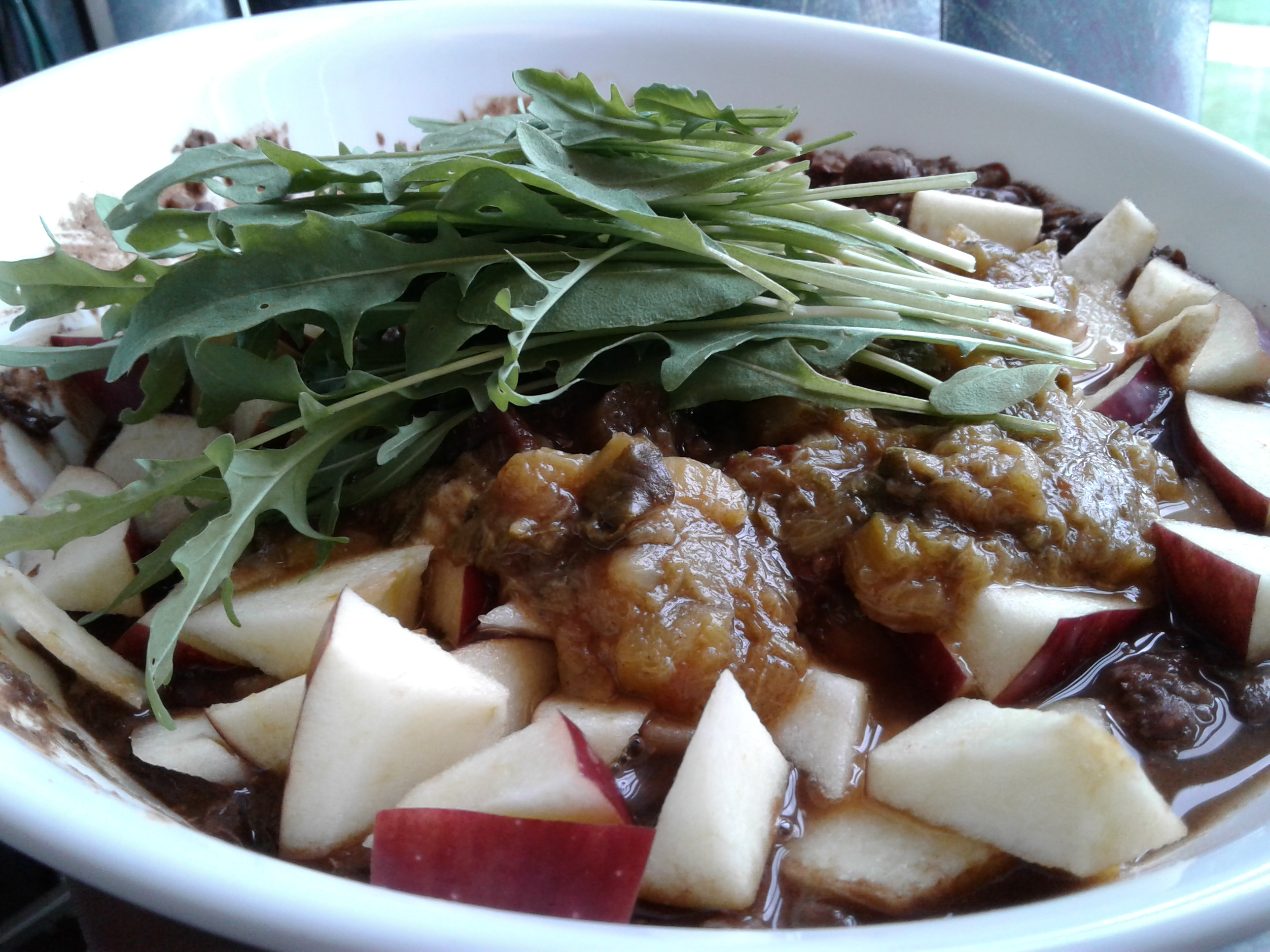This meal is composed of various leftovers. Adzuki Beans simply soaked 24h then boiled, mashed with a fork, with Cacao Powder mixed in plus liquid glycerin Stevia extract to taste. This Rhubarb was freshly harvested from my garden (but can be seasonally purchased) and gently stir-fried with Cinnamon and other spices with mixed in dried Black Currants to sweeten the Rhubarb tartness. The mix is then topped with diced Apples and some wild Arugula from the garden (because I love Arugula on anything).