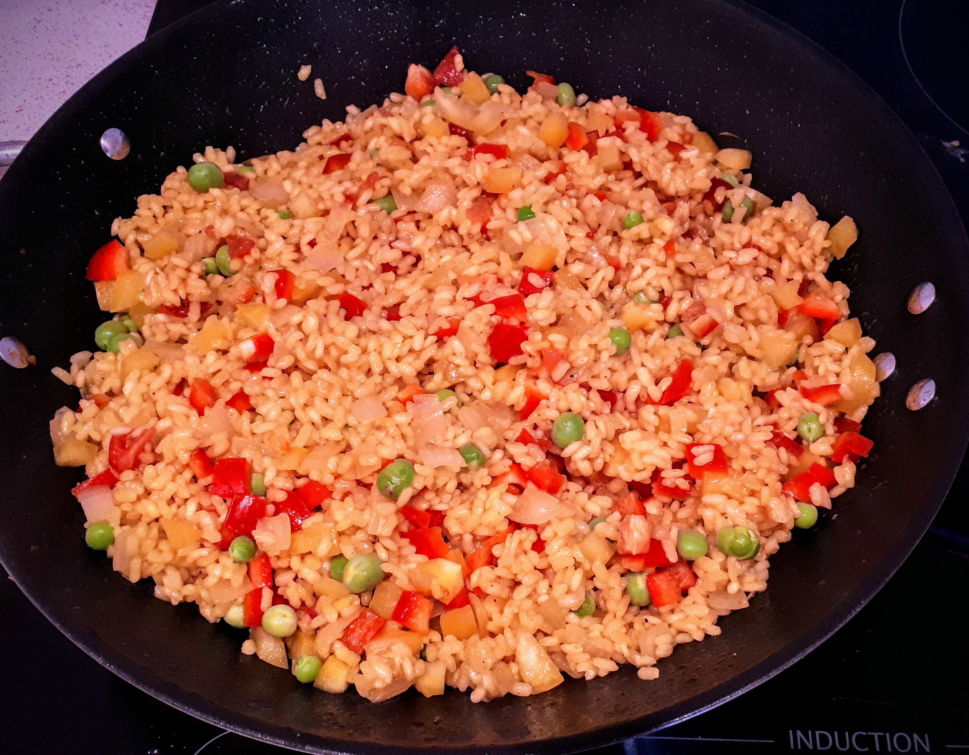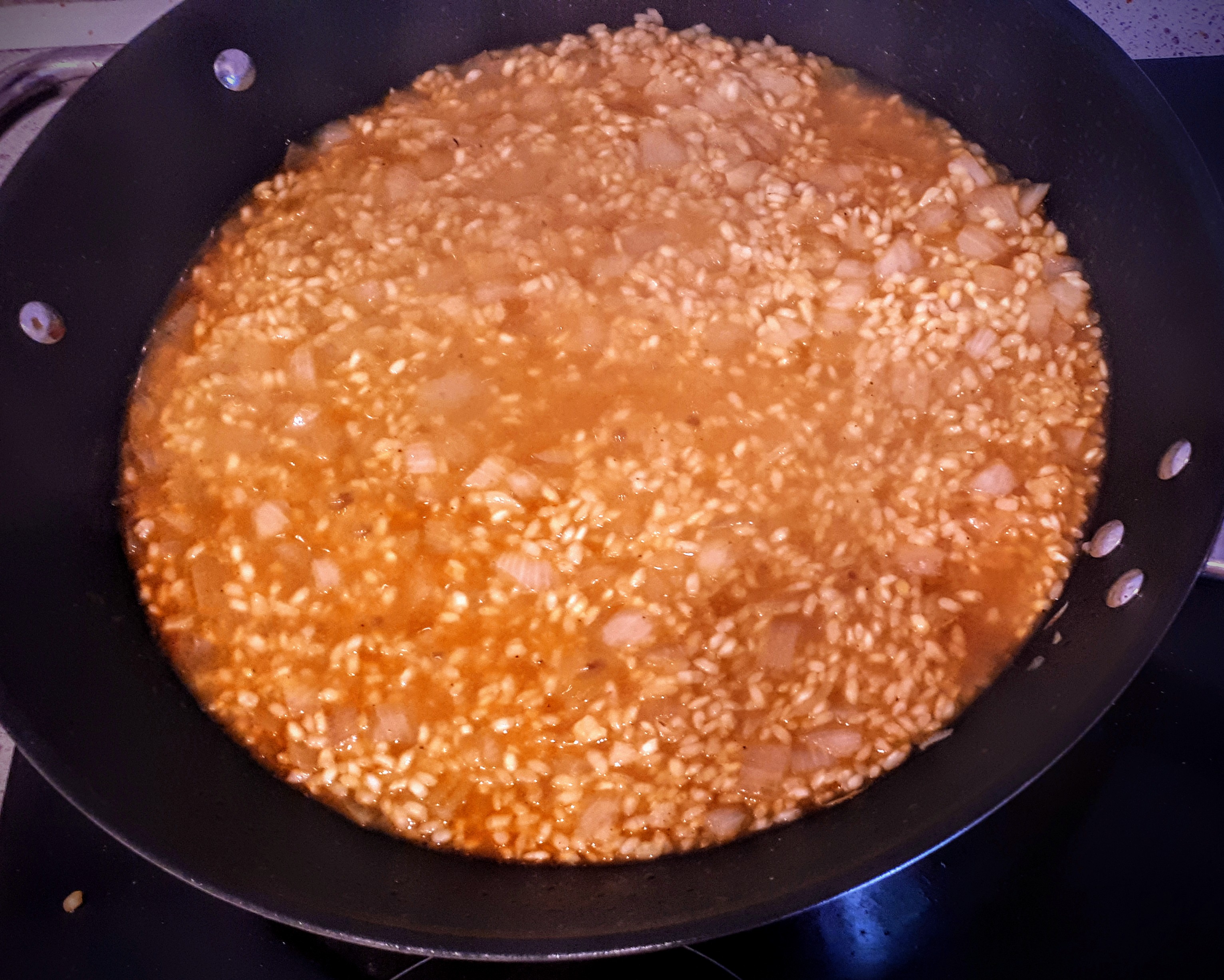 From here you can pause and have a glass of wine while you wait for the rice to absorb the liquid and cook.