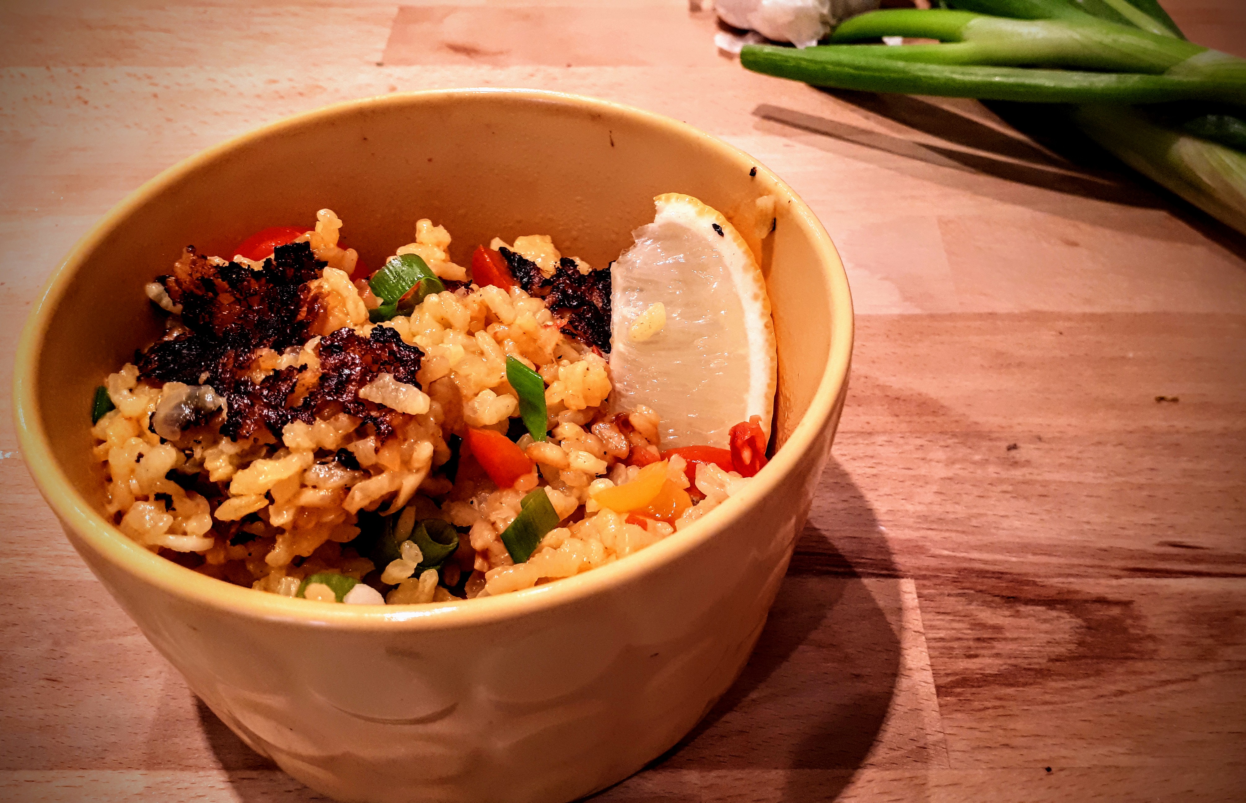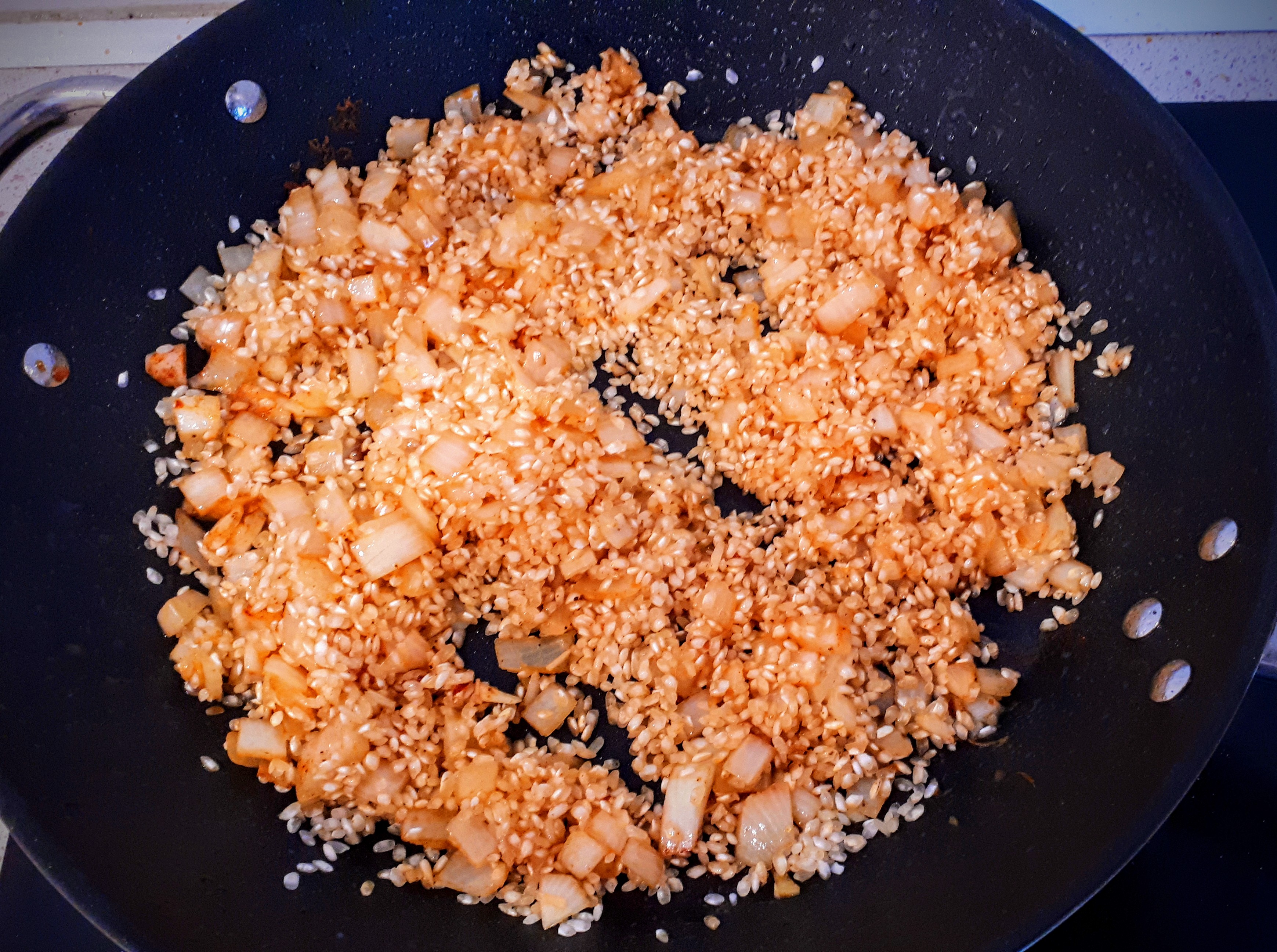 From here I added the rice to the onions and spices and tried to toast them as best I could.