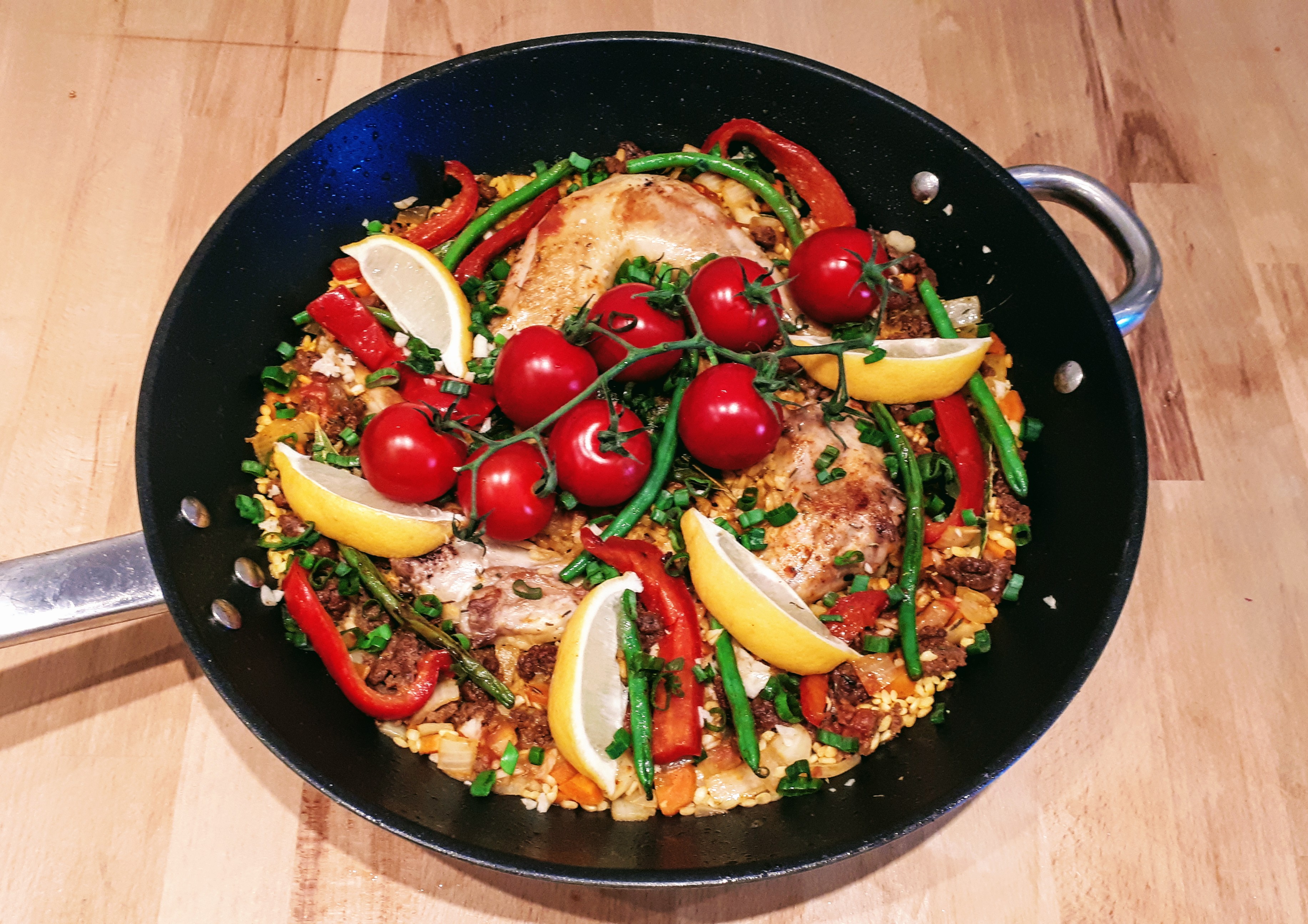 This is not a traditional Paella pan. This is the €19 Ikea non-stick frying pan that I used to cook my Paella. If you're not a purist chef something like this will work as long as all of the rice is covered in liquid when cooking.