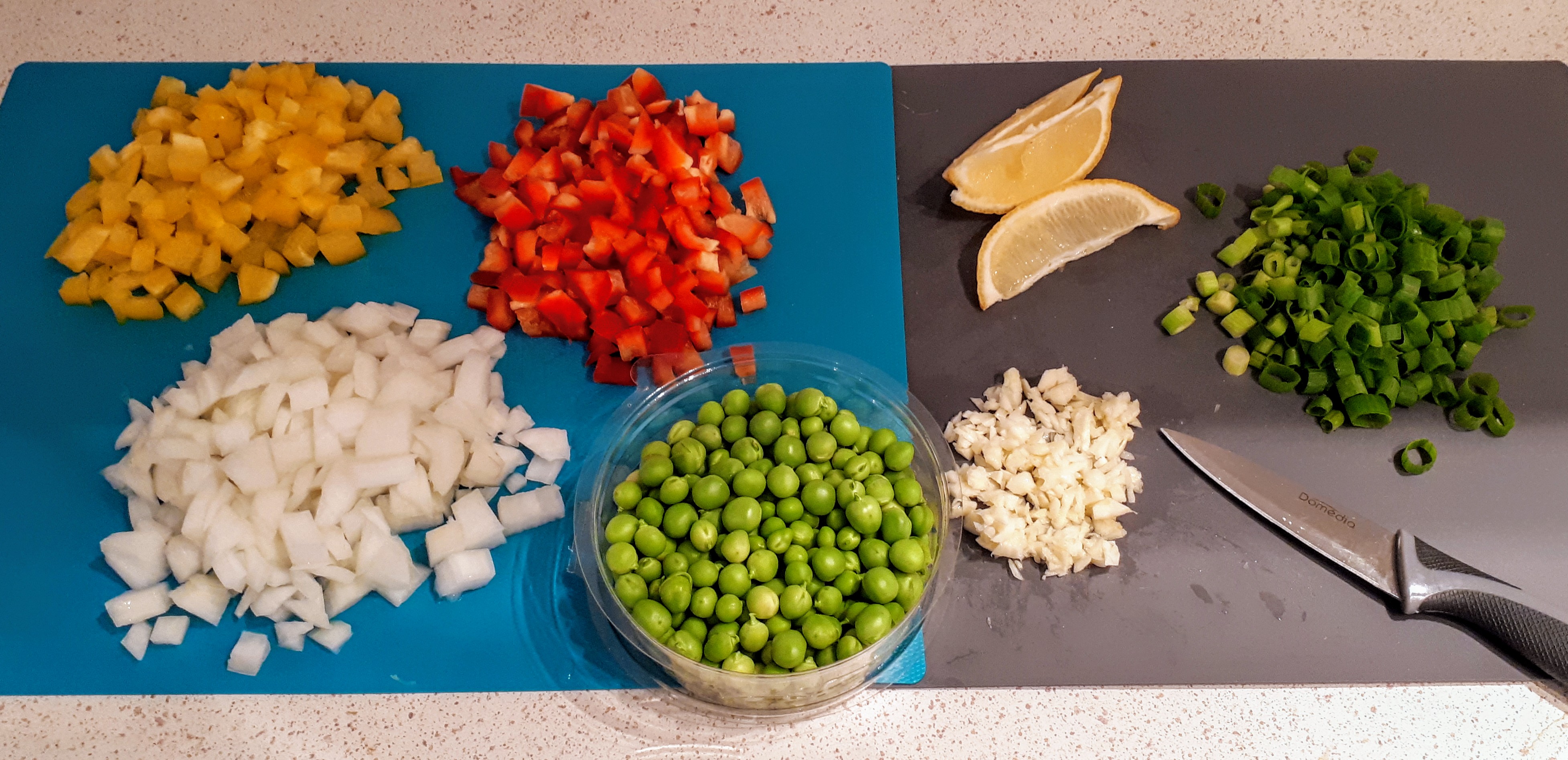 While the chicken was cooking I prepared the vegetables by giving them a chop. I wanted there to be consistency in the dish so I cut everything into an equal size. I basicall just matched the size of the peas.