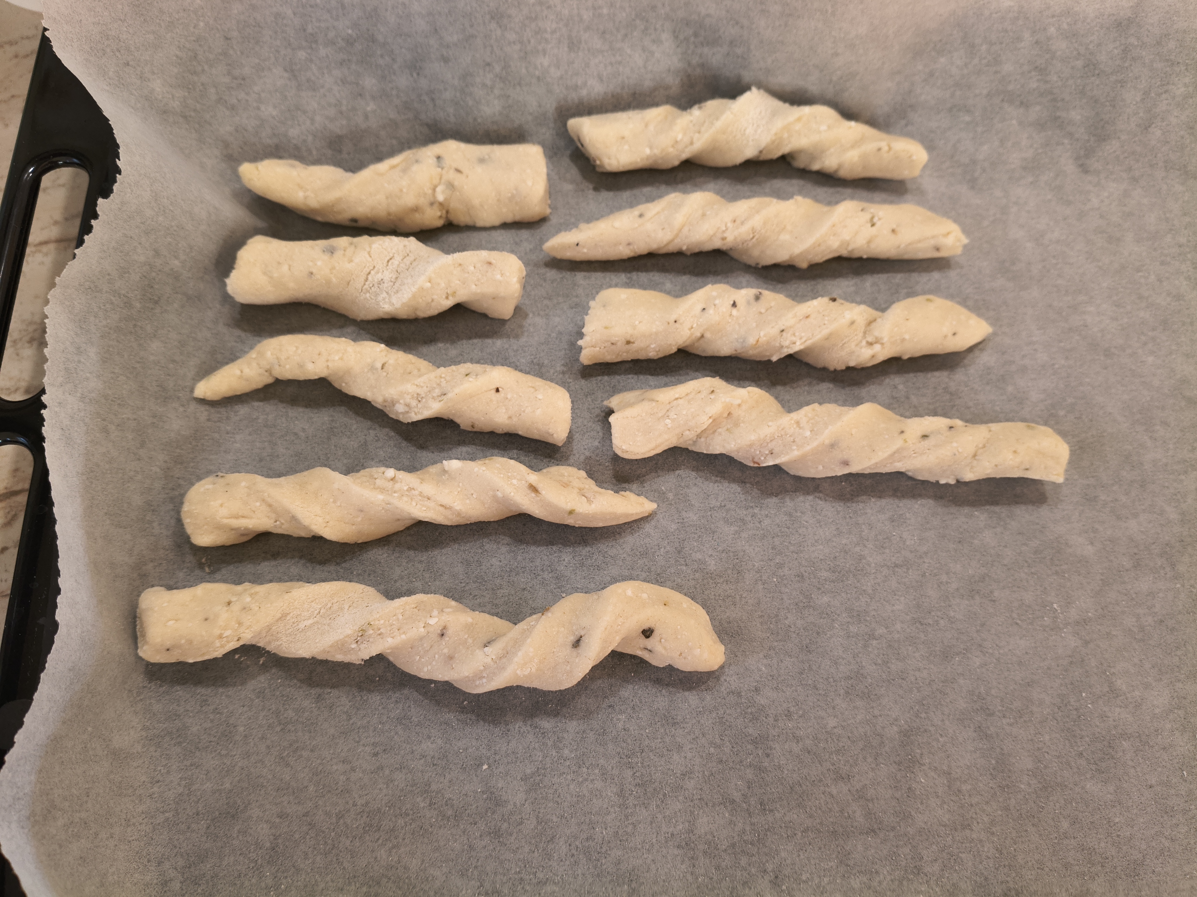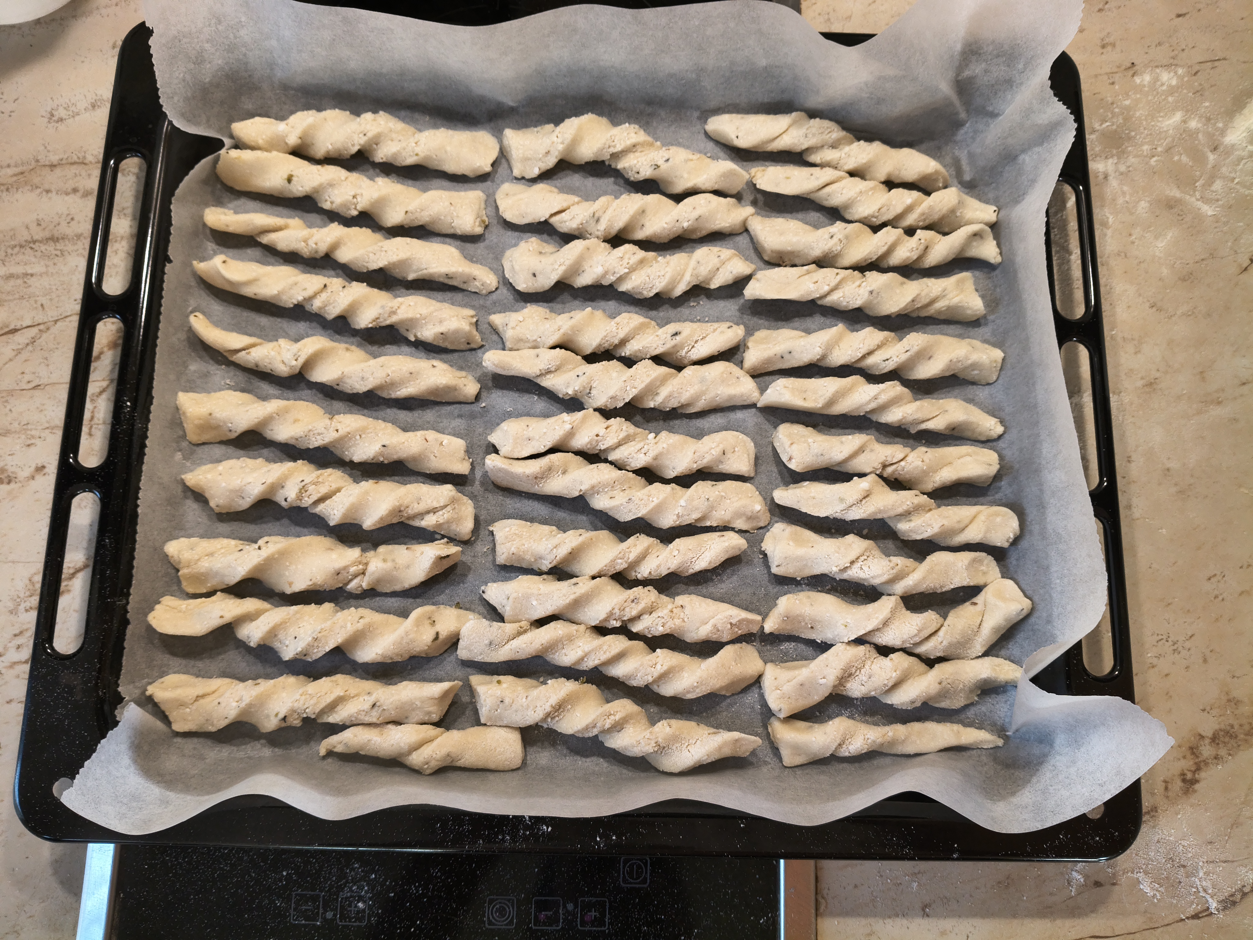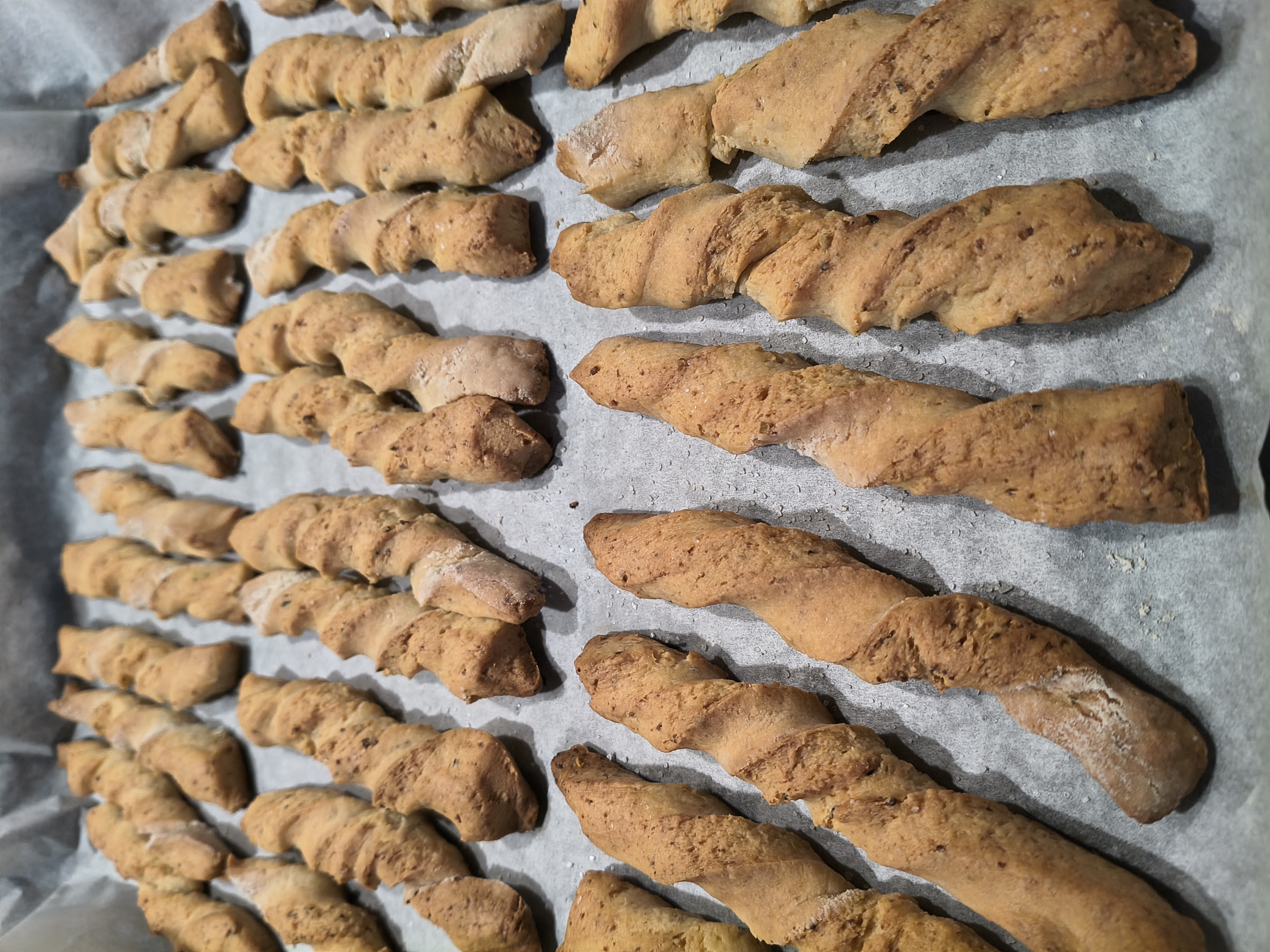 В купа слагам всички продукти и разбърквам с миксер, с бъркалките за тесто. След постигане на хомогенност, изсипвам на плота и започвам месене на ръка. Меся до меко тесто, което не лепне. Разточвам на дебелина около половин сантиметър. Разрязвам на ленти с ширина около сантиметър и дължина около 10 сантиметра. Всяка лента усуквам и поставям в тава, покрита с хартия за печене, като може леко да се натиснат краищата, за да не се саморазвива. Пека в предварително загрята на 180 градуса Целзий за около половин час или желателния от мен загар, до златисто. С тези продукти пълня две тави за печене. Целият процес отнема около час и половина.