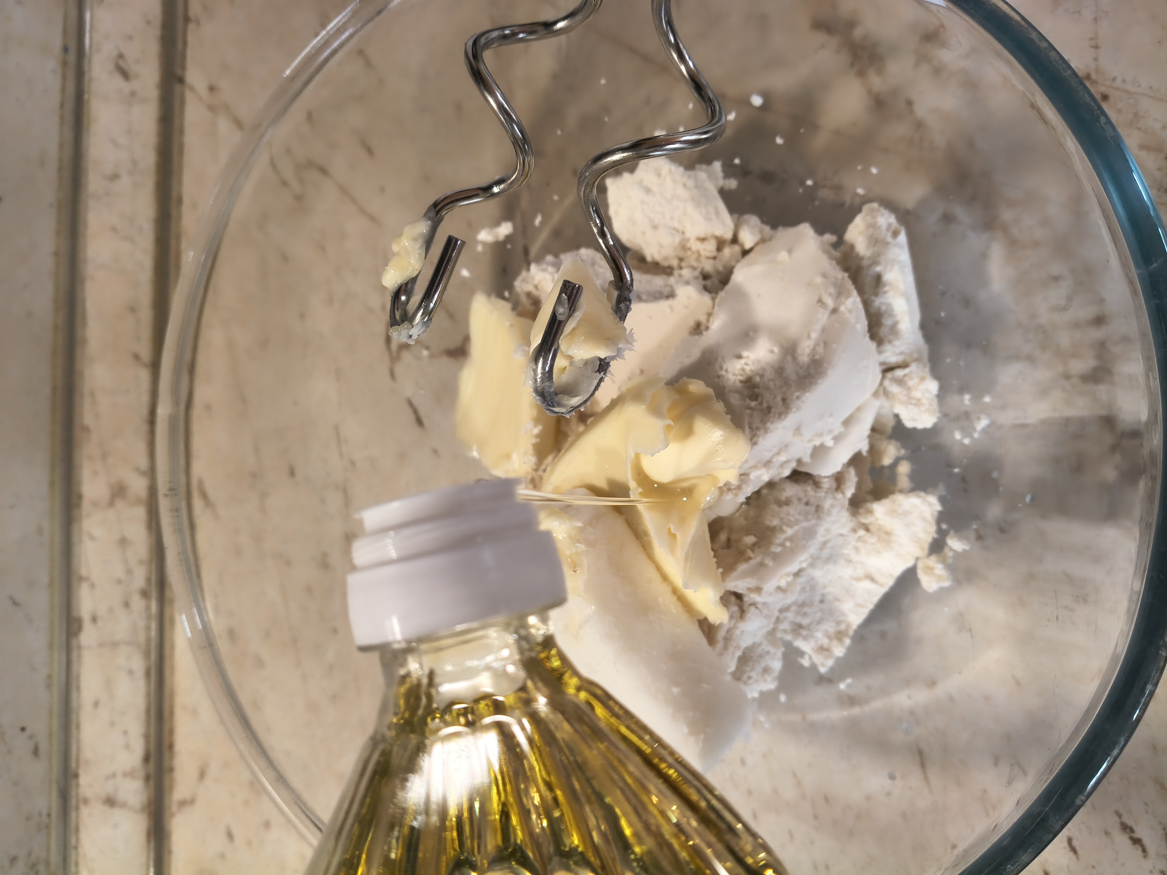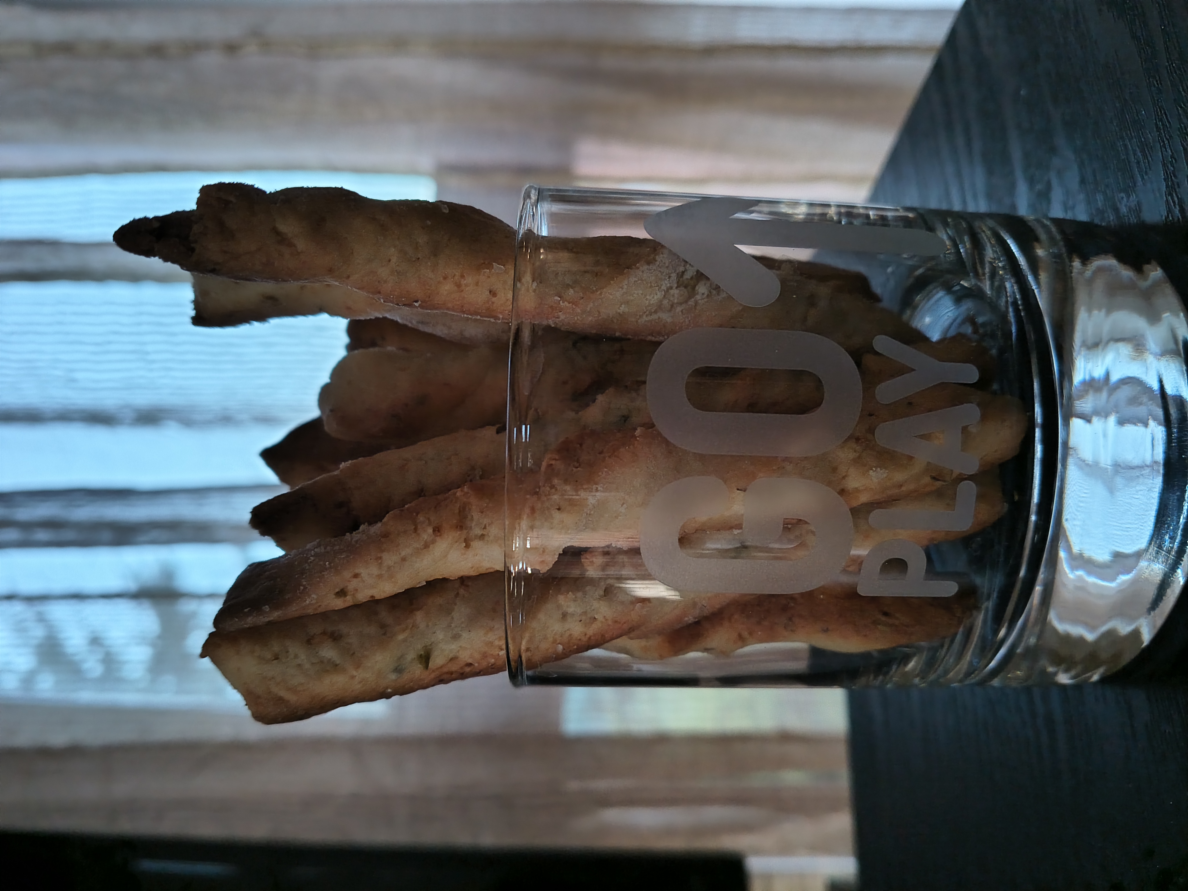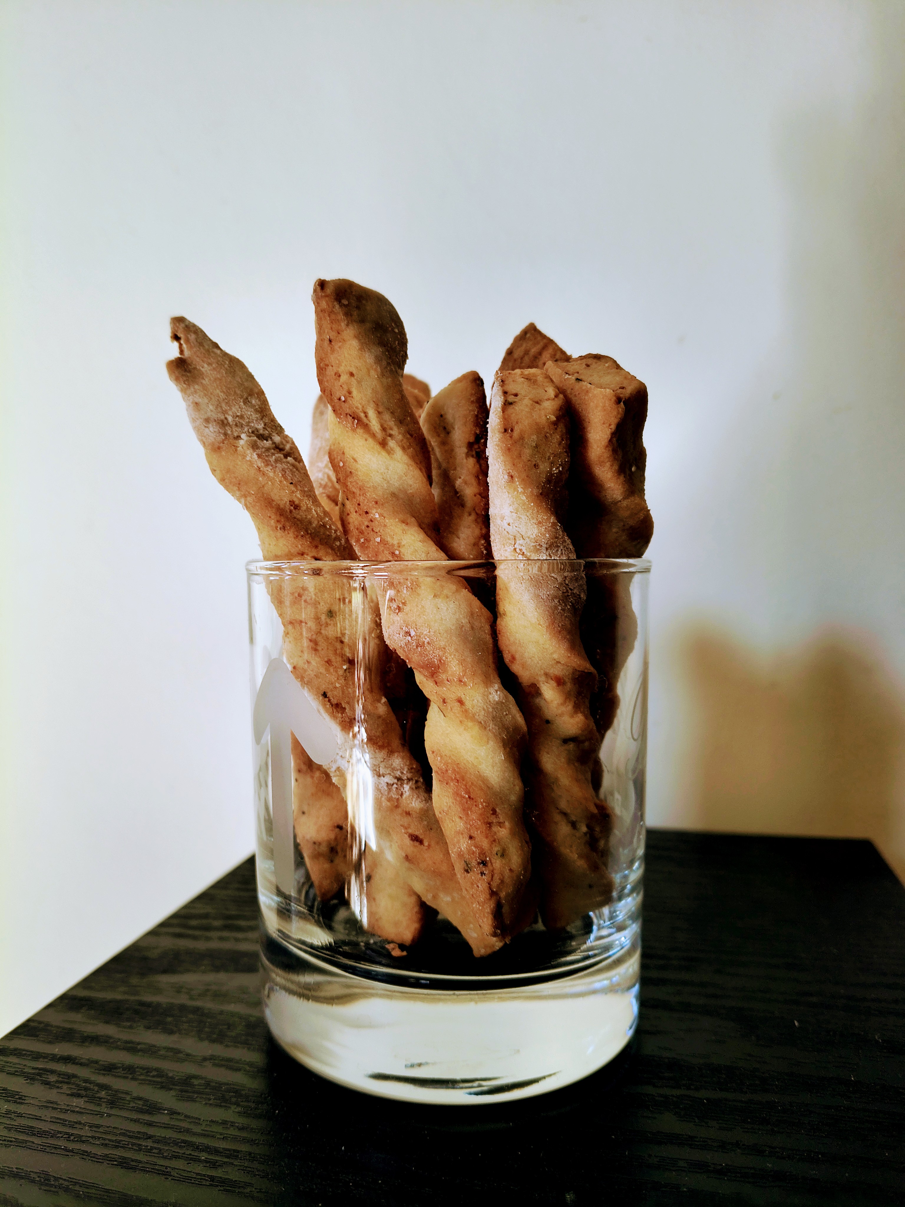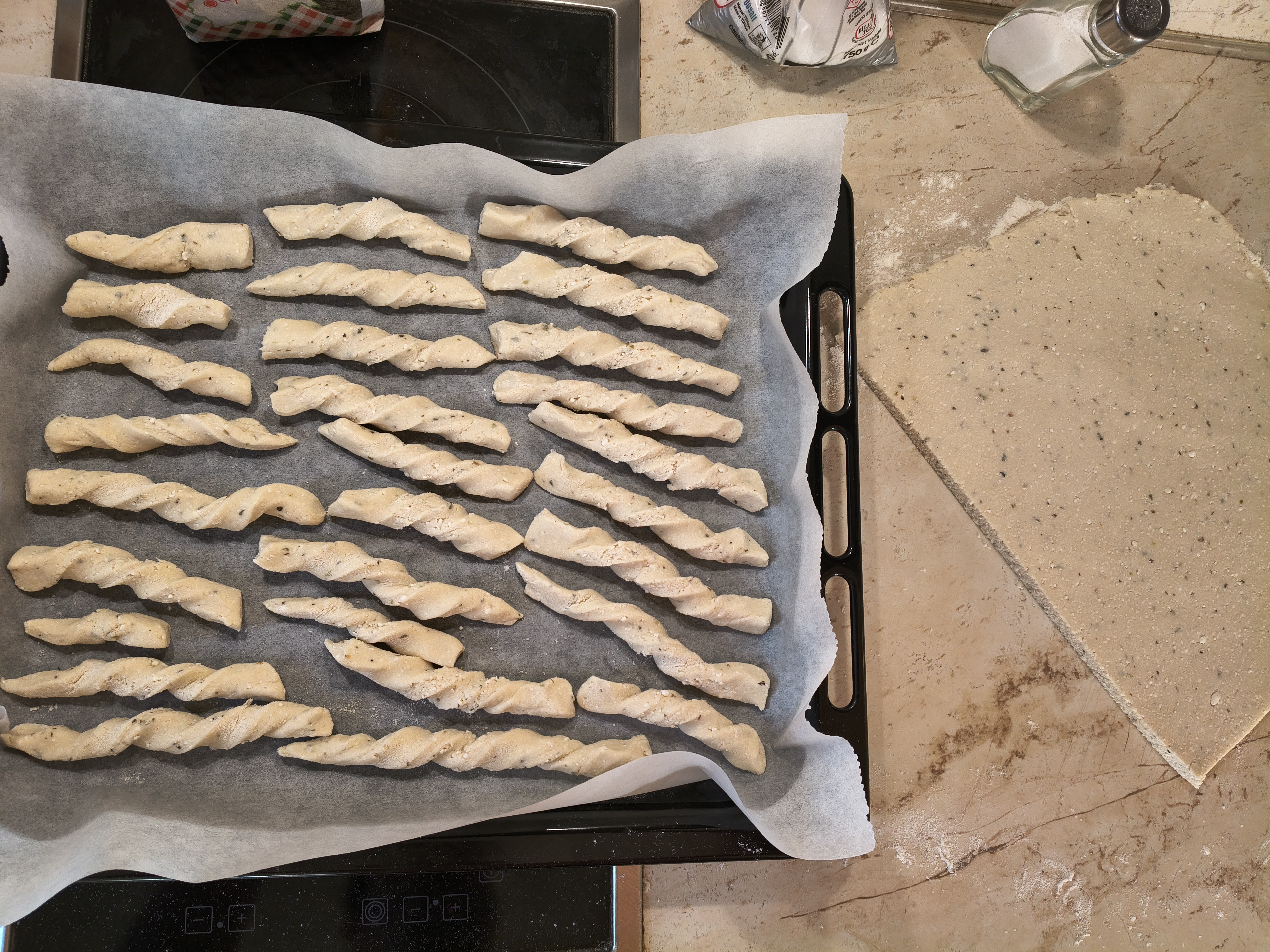 В купа слагам всички продукти и разбърквам с миксер, с бъркалките за тесто. След постигане на хомогенност, изсипвам на плота и започвам месене на ръка. Меся до меко тесто, което не лепне. Разточвам на дебелина около половин сантиметър. Разрязвам на ленти с ширина около сантиметър и дължина около 10 сантиметра. Всяка лента усуквам и поставям в тава, покрита с хартия за печене, като може леко да се натиснат краищата, за да не се саморазвива. Пека в предварително загрята на 180 градуса Целзий за около половин час или желателния от мен загар, до златисто. С тези продукти пълня две тави за печене. Целият процес отнема около час и половина.