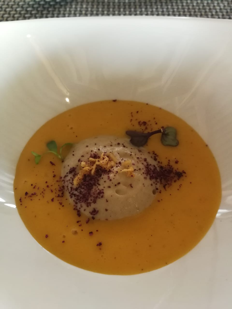 This is the best butternut soup I've ever had the pleasure of eating. Topped with a creamy mushroom puree.
