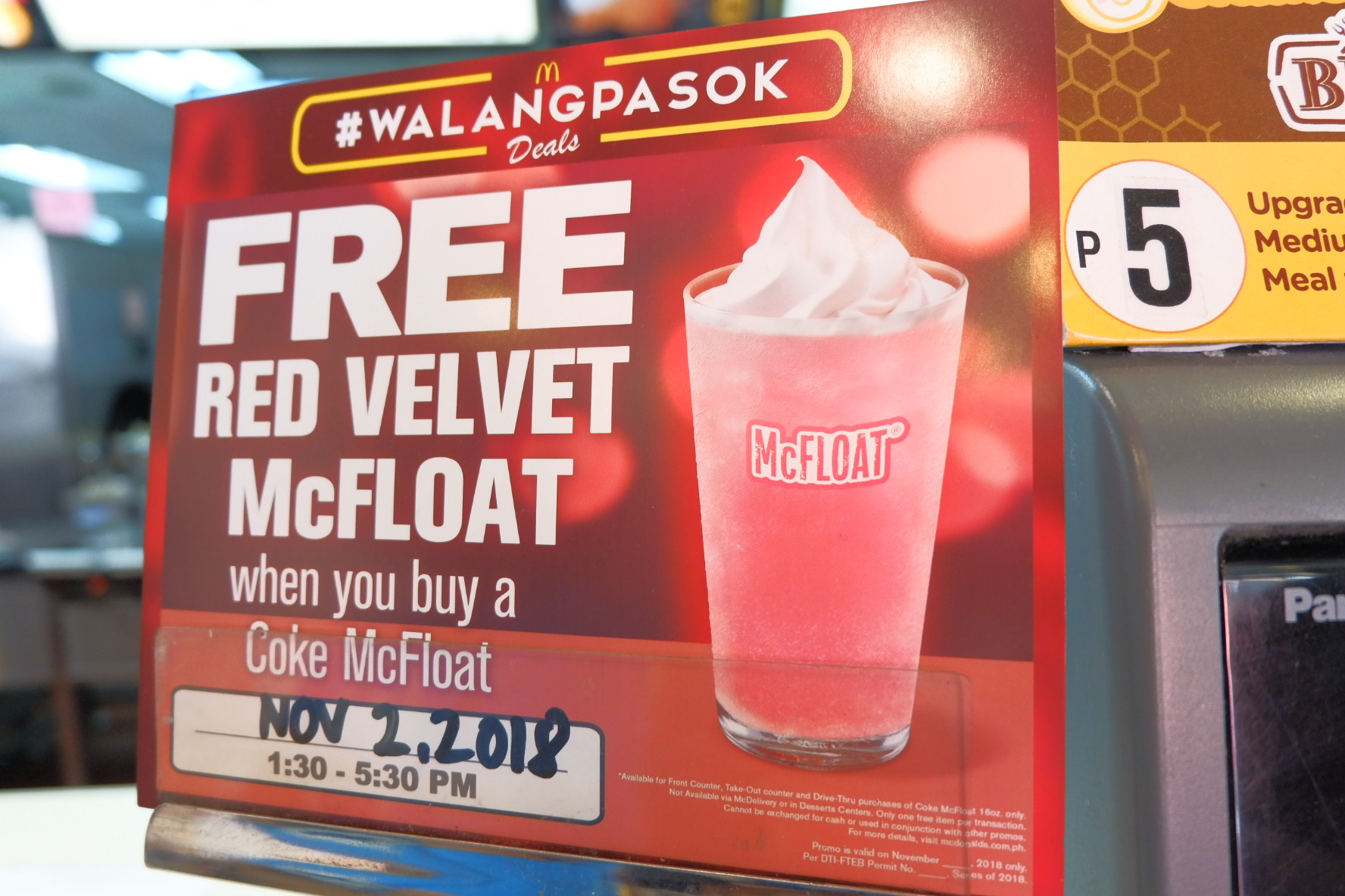 Last Week Nov 2, 2018 Mcdonalds Has a great deals the #WalangPasok Deals (NoClassDeals) Since November 02 has no classes McDonalds offer a great deal When you buy the Coke Mcfloat for only 32 Pesos ($0.60) you will get a FREE Red Velvet McFloat