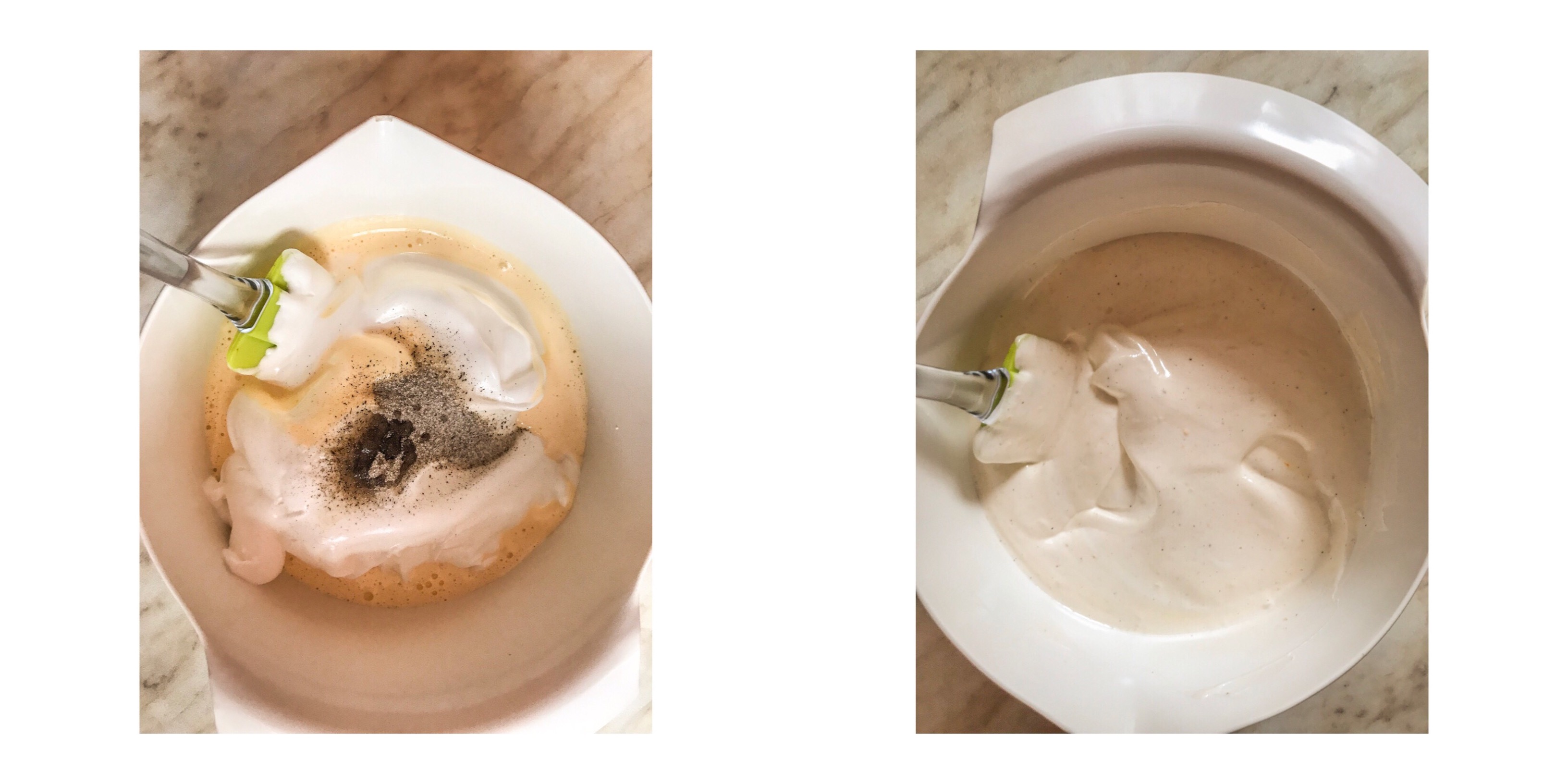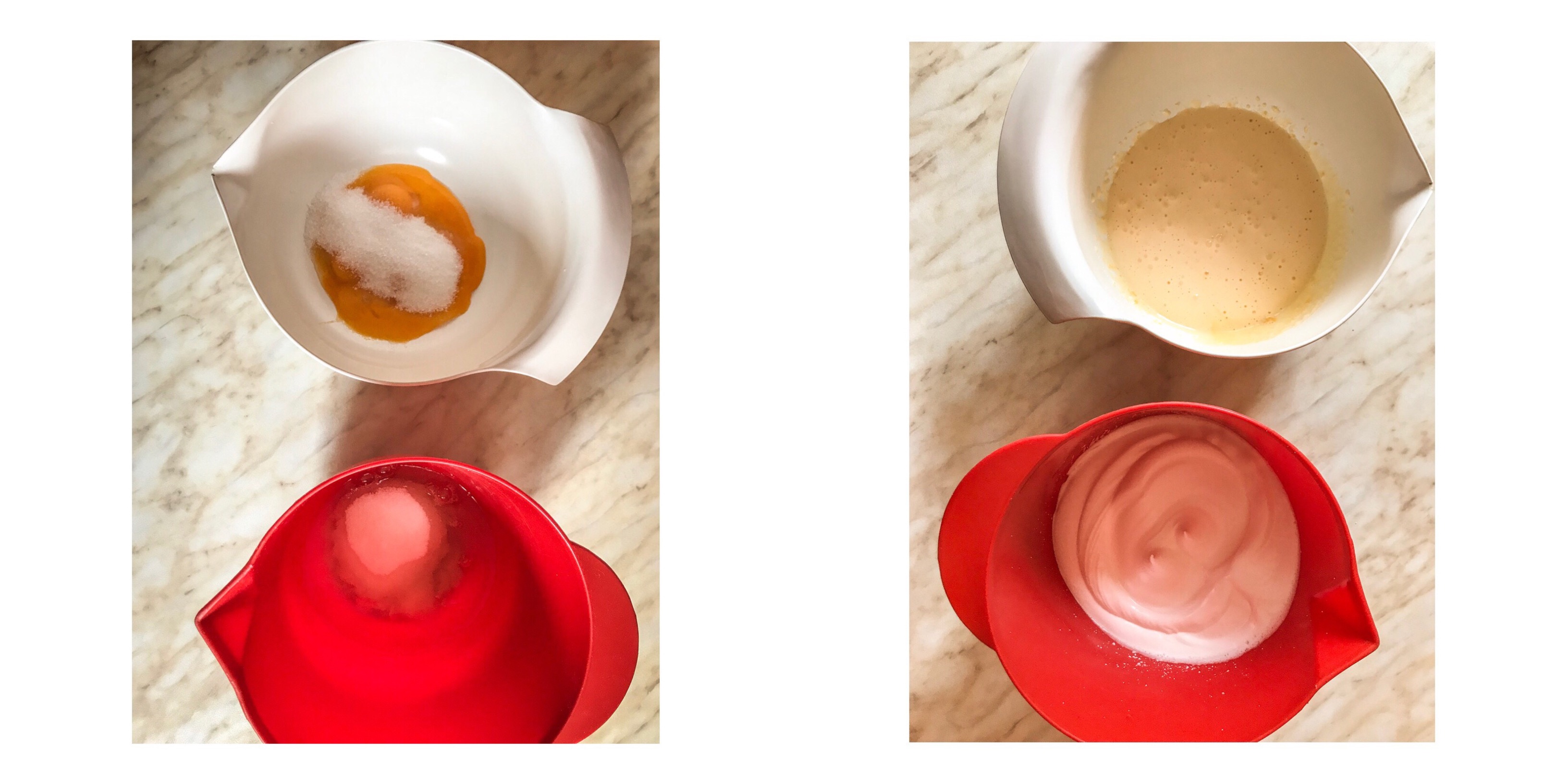 Meanwhile split the yolks from the egg whites in two different bowls and split the sugar into two even parts. You have to stir both quite well so I would recommend using a mixer for that. For the yolks, you should stir until you have a homogeneous yellow mixture, and for the egg whites - you are aiming for a hard white foam. They should look something like this: