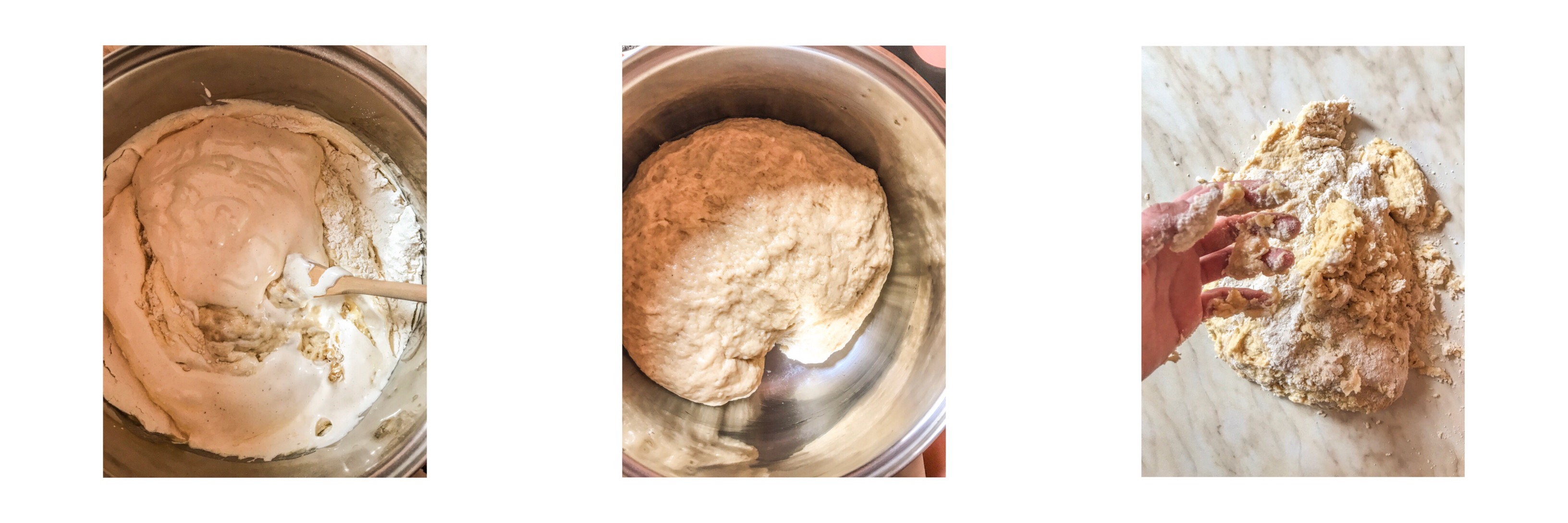 Then pour both the yeast and the other mixture and start kneading it with your both hands. While doing this pour carefully and evenly the rest of the butter. When you are ready, just put in a big bowl to rest for one hour and cover it with a towel.