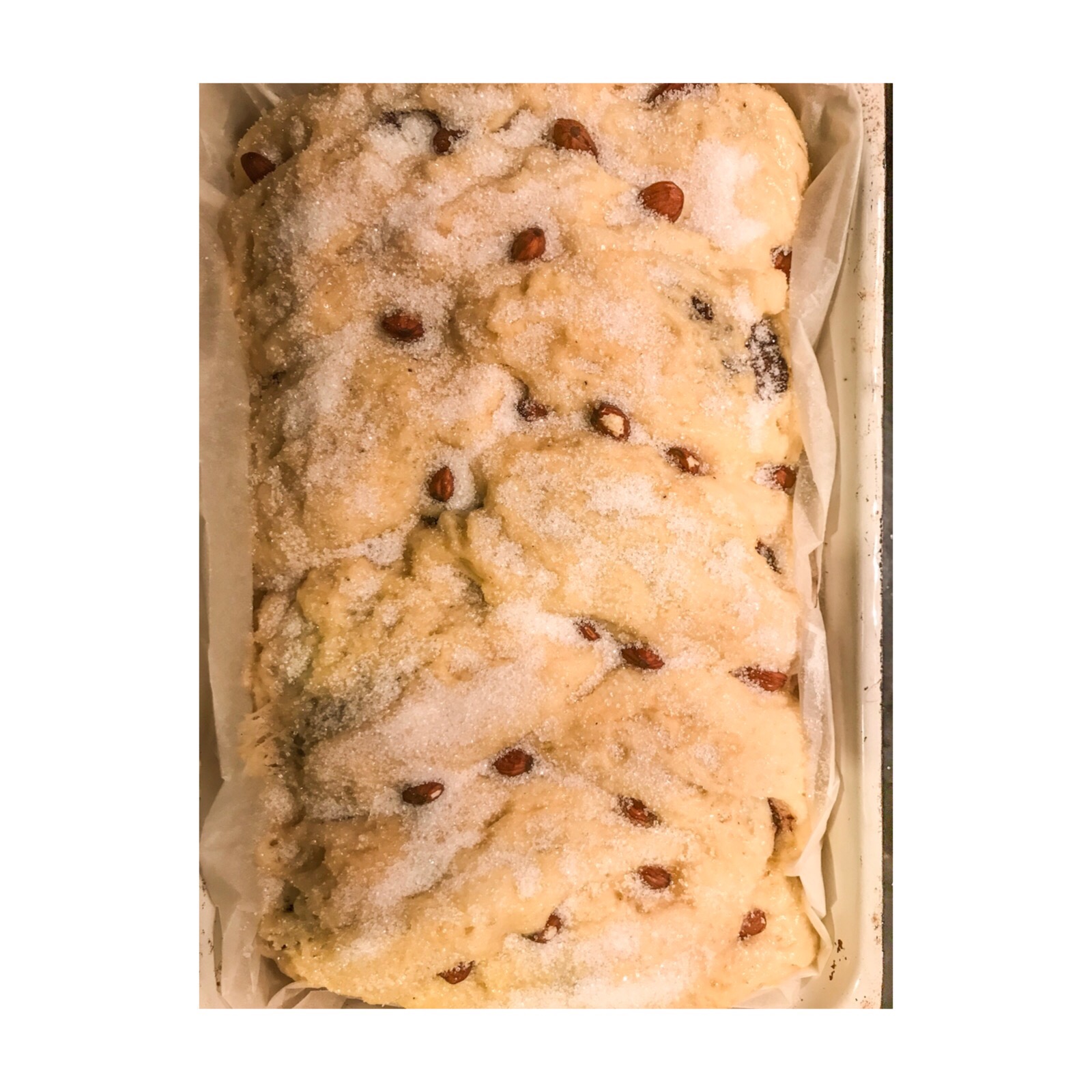 Then just place the almonds all over your “kozunak” and press with your finger on the top of the nuts so it won’t go out while it’s baking. Pour a couple of tablespoons with white sugar on top and leave for one more hour - it will increase its size and become fluffy and airy. After that, you are ready to put it into the oven.