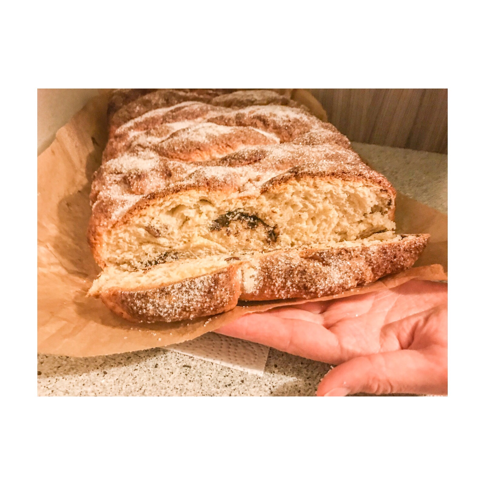 Bake at a medium temperature around 40-50 minutes or until you see a golden crust forming on top. Your “kozunak” will smell crazy delicious and will look like this:
