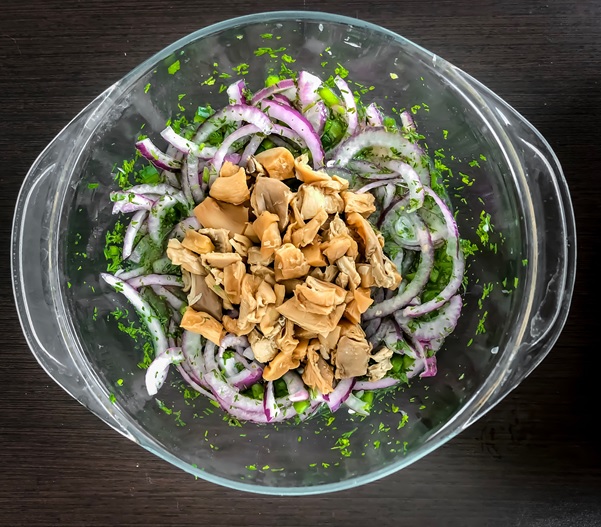 - Remove the mushrooms from the steamer and add them to the ceviche bowl. Incorporate everything.
