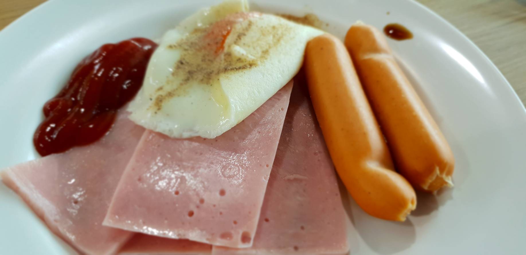 Morning in holiday, I ate breakfast like a picture. There are fried egg, hams and sausages with orange juice.