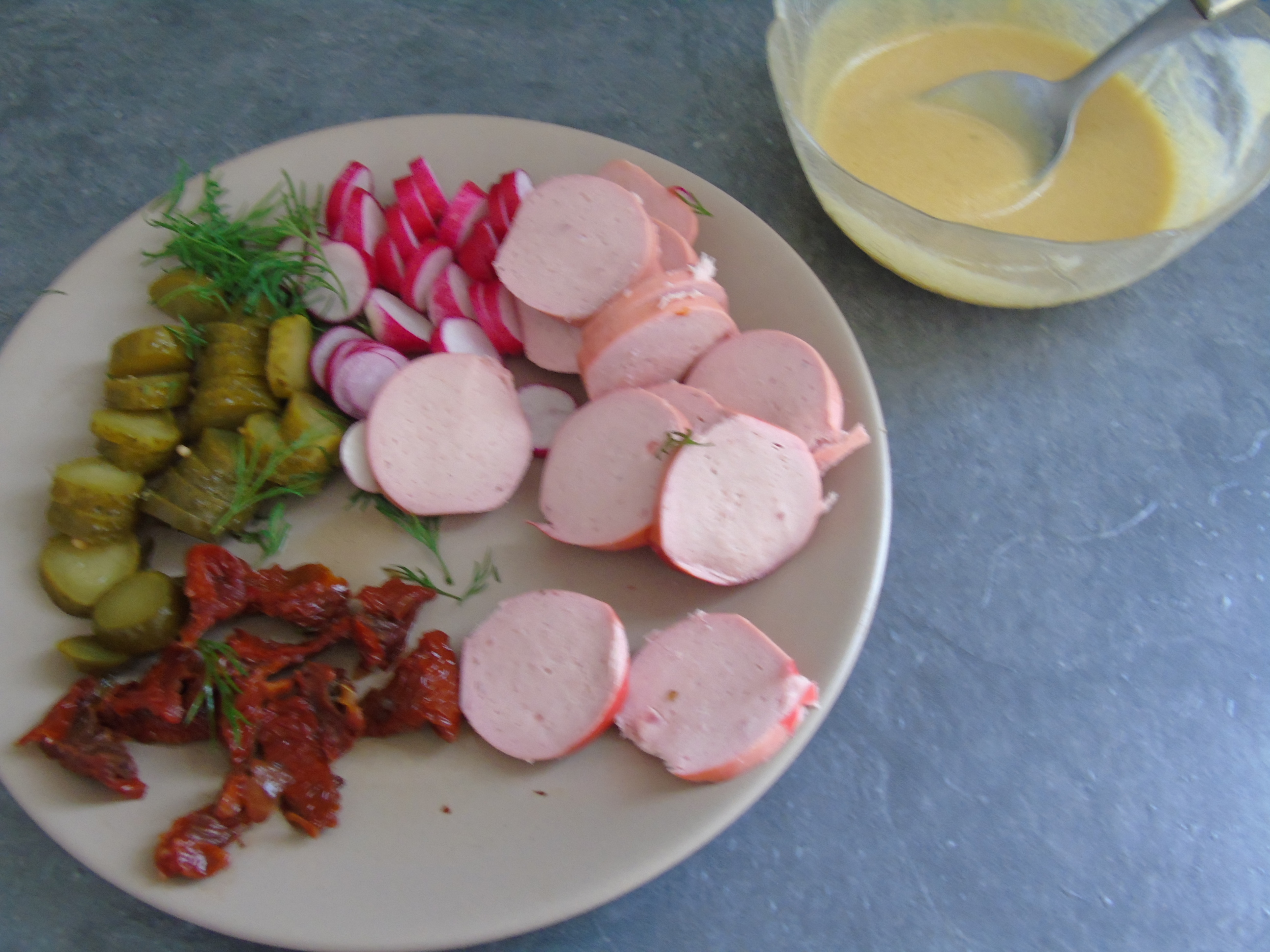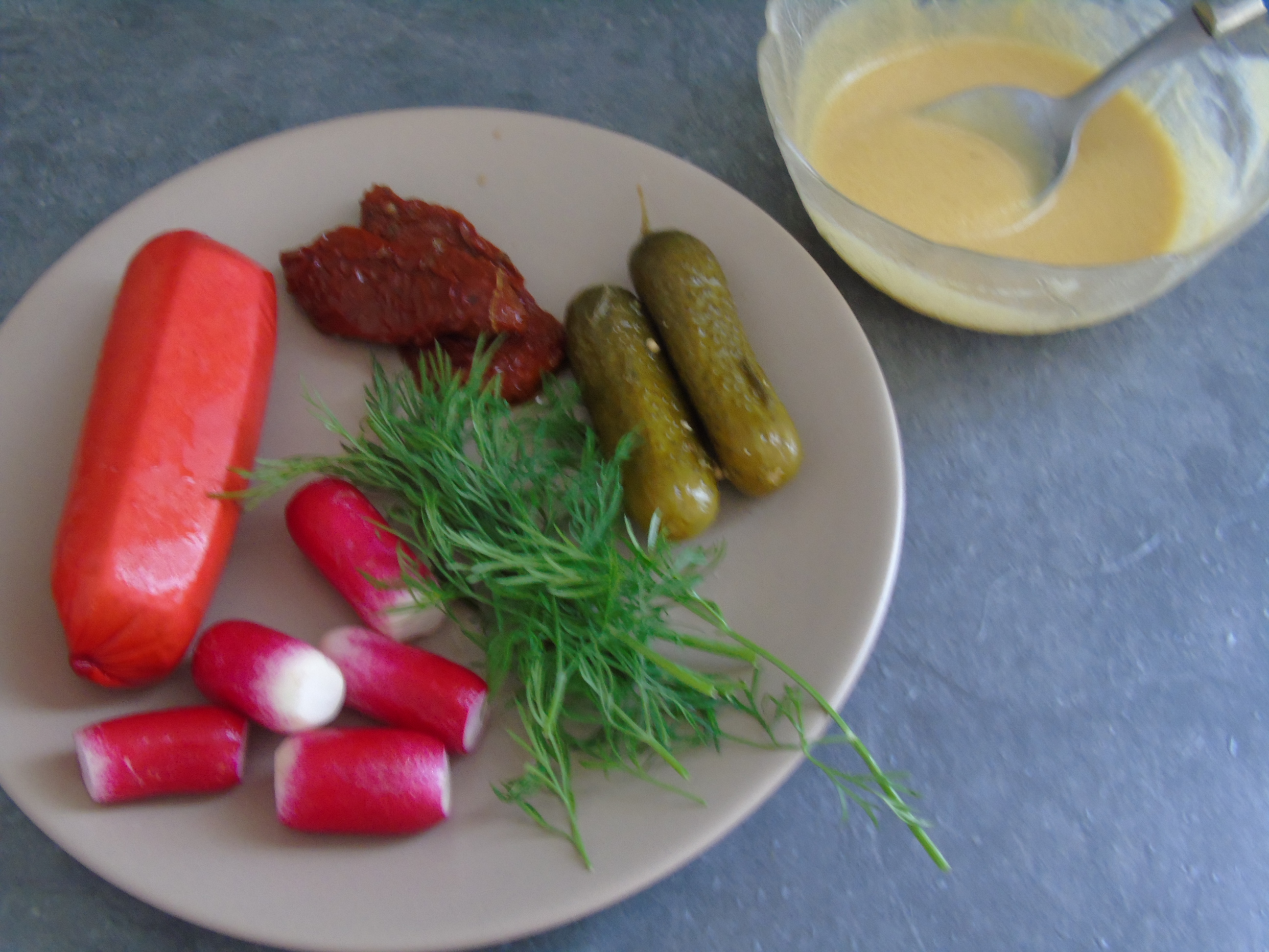 Je rajoute des cornichons, des radis, de l'aneth, des tomates séchées et une bonne sauce vinaigrette un peu épaisse.