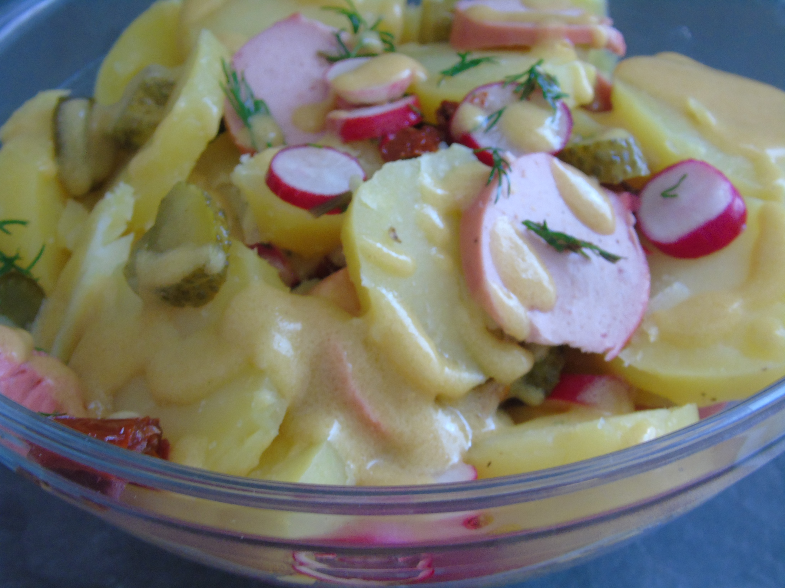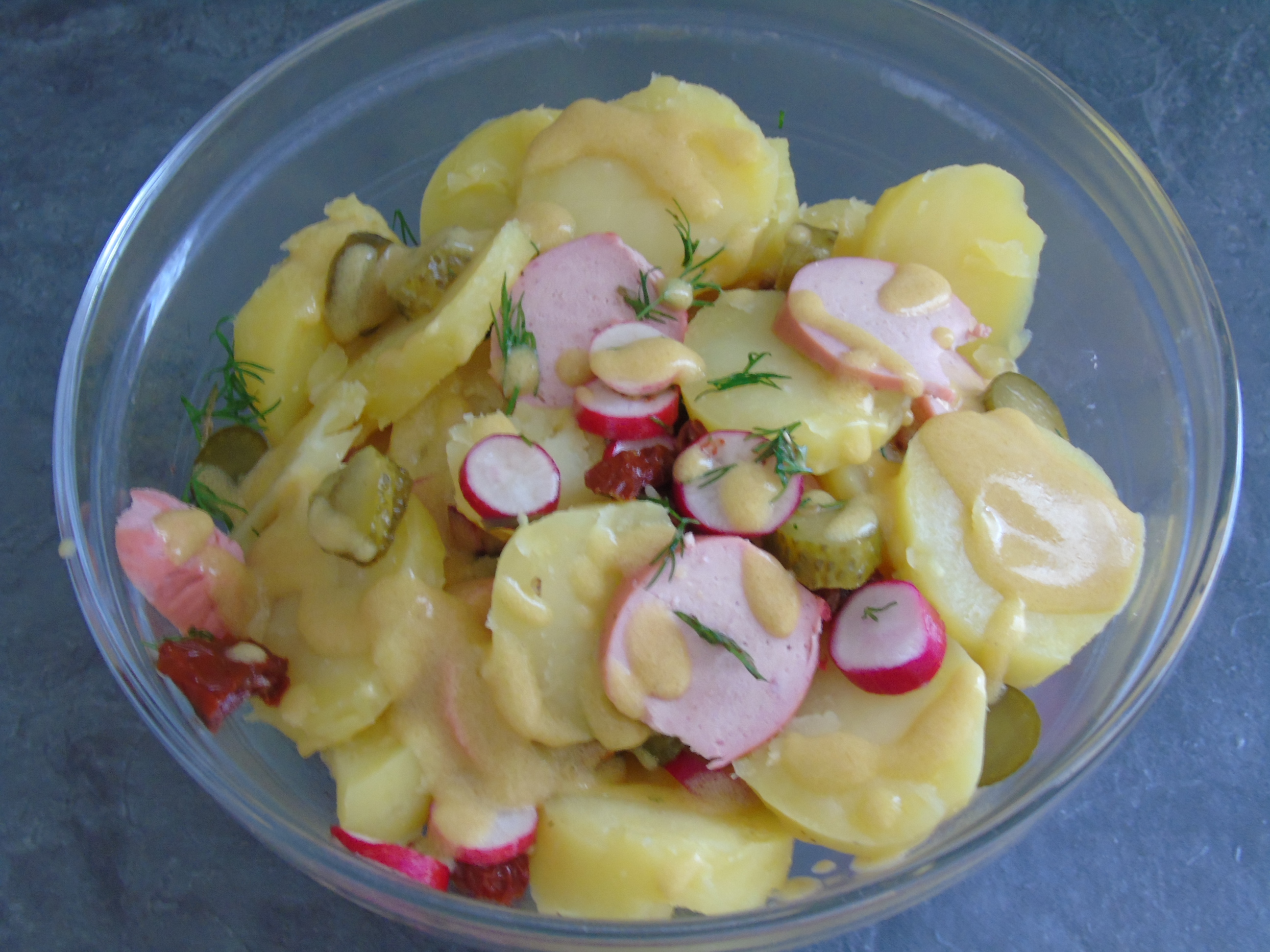 Salut à tous une bonne salade avec du cervelas et des pommes de terre.