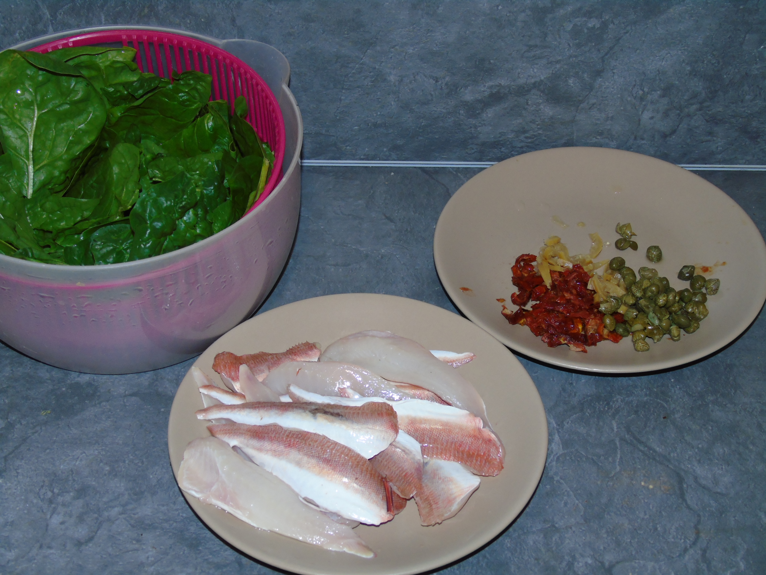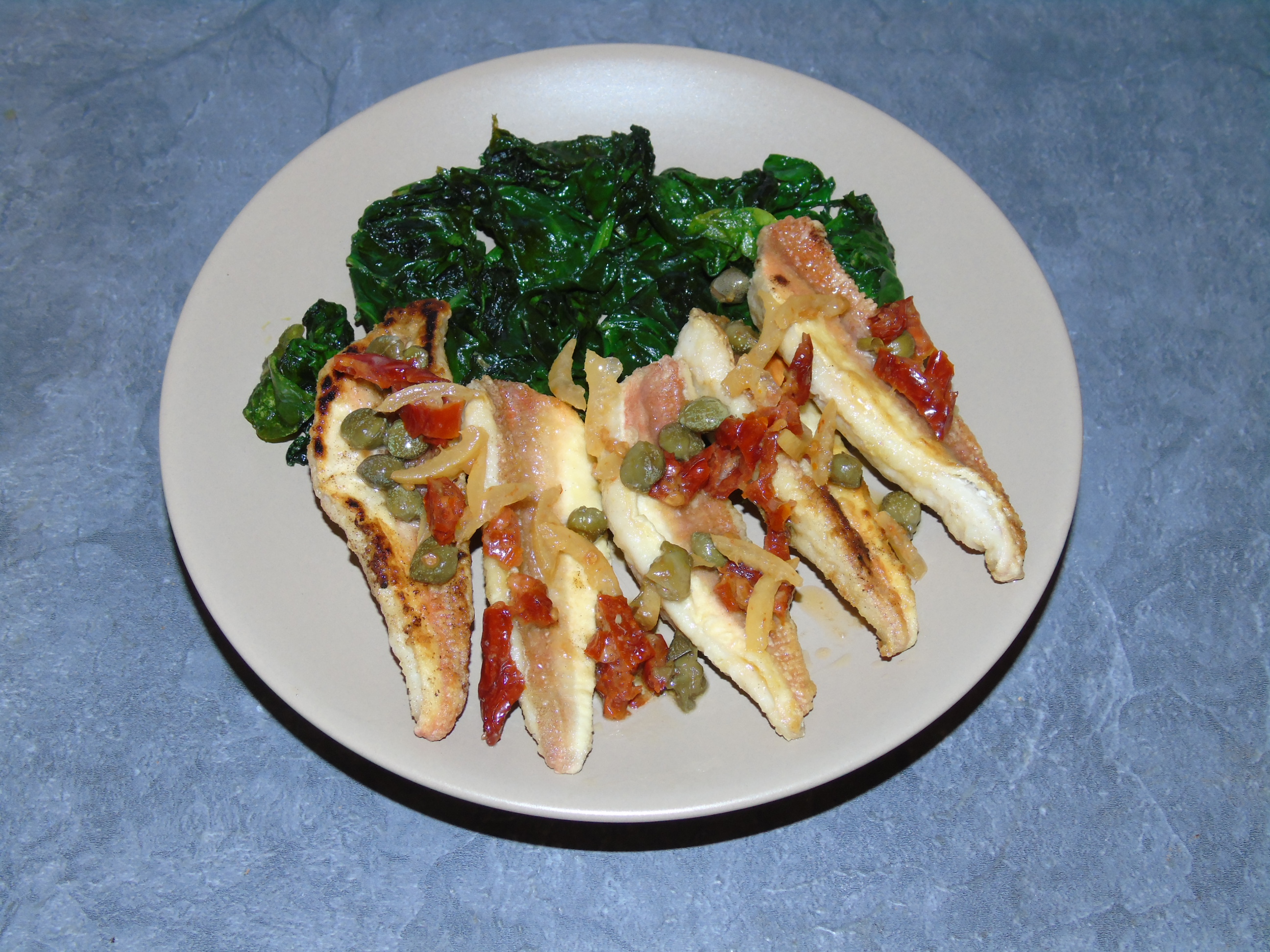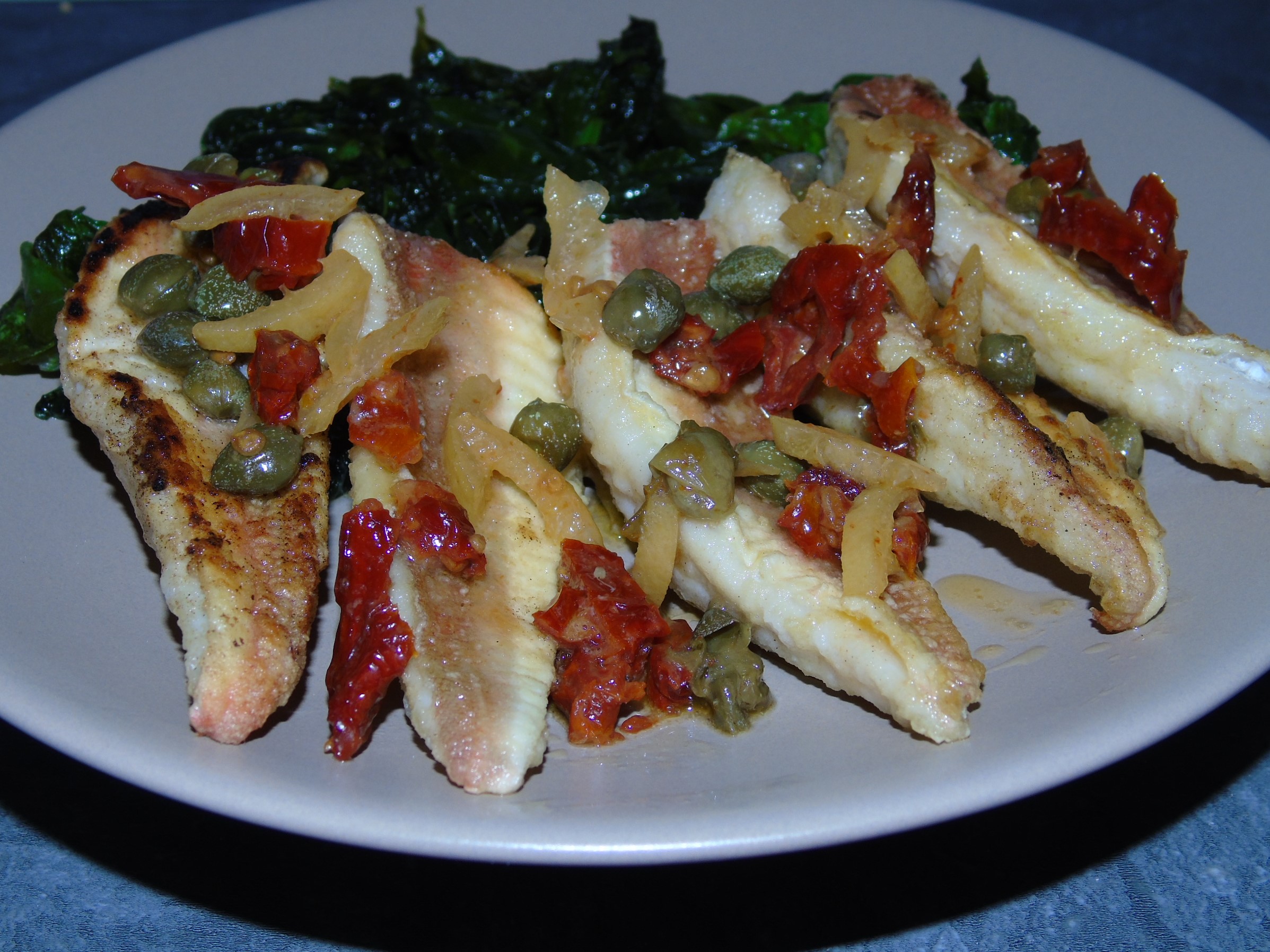 Salut à tous des filets de grondin grillés avec une garniture de câpres, tomates séchées, écorces de citron confit.