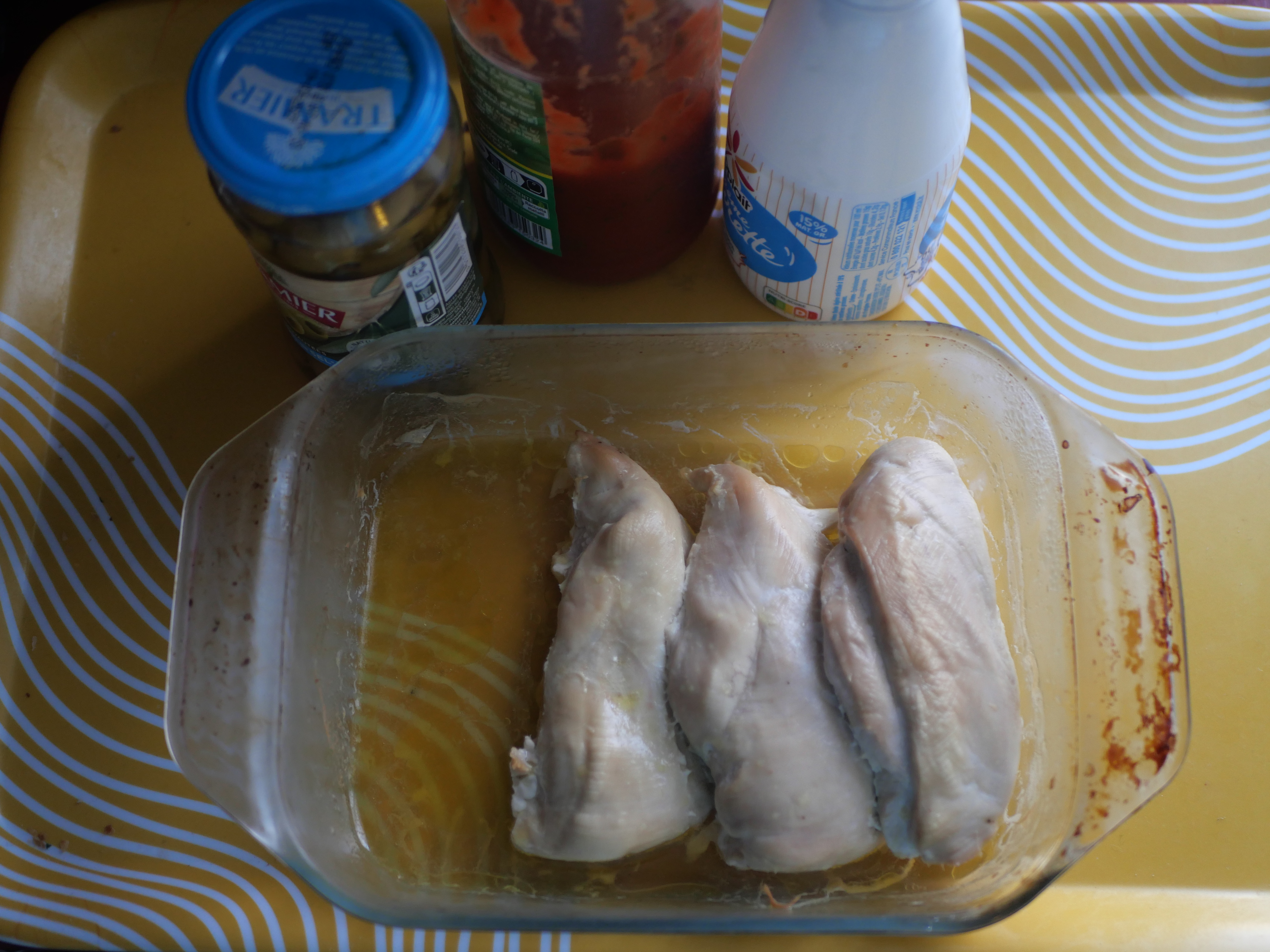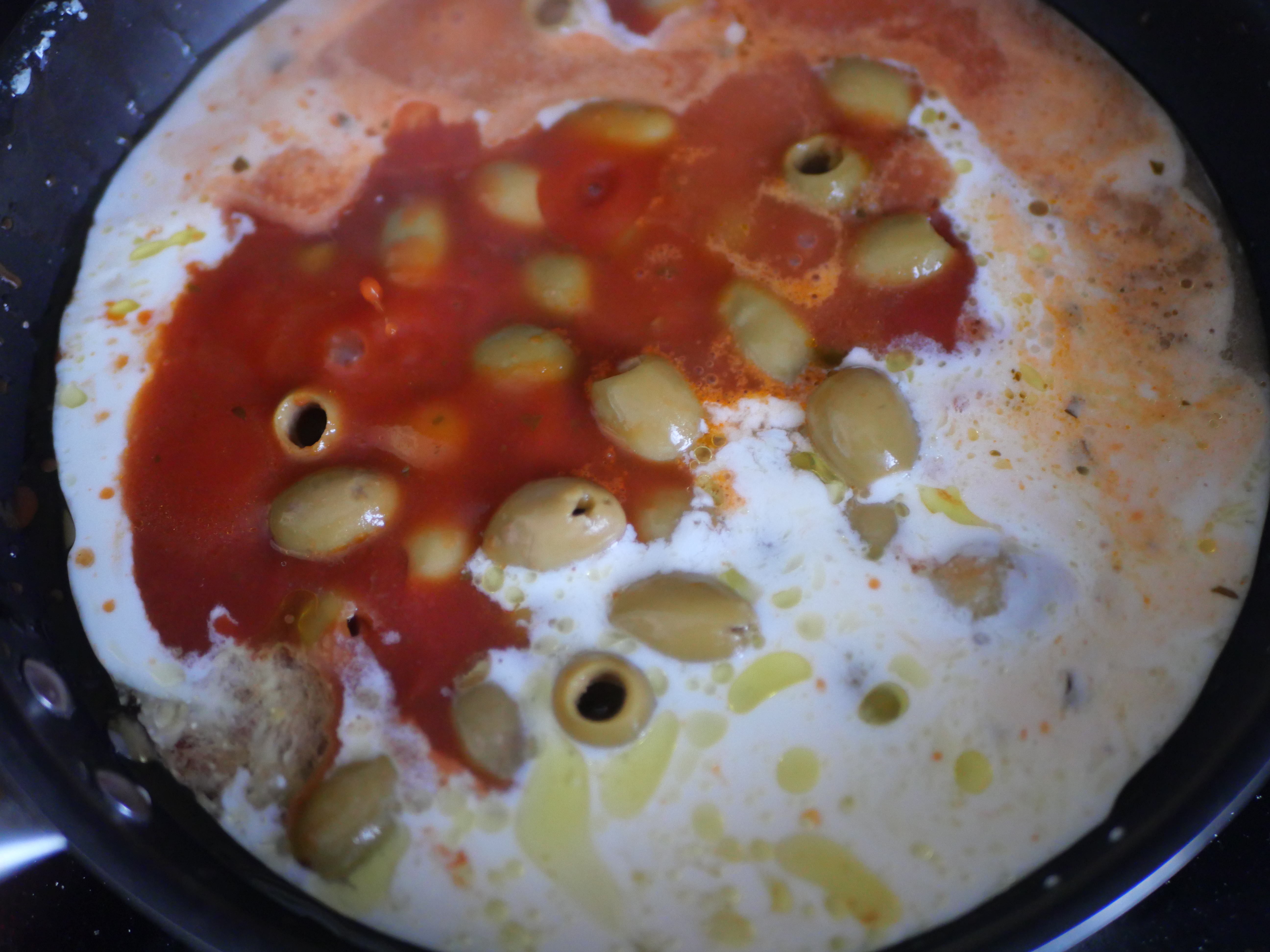 Faire bouillir le coulis de tomate avec la crème fraîche, ajouter les olives et faire réchauffer le poulet dedans pendant ques pâtes cuisent.