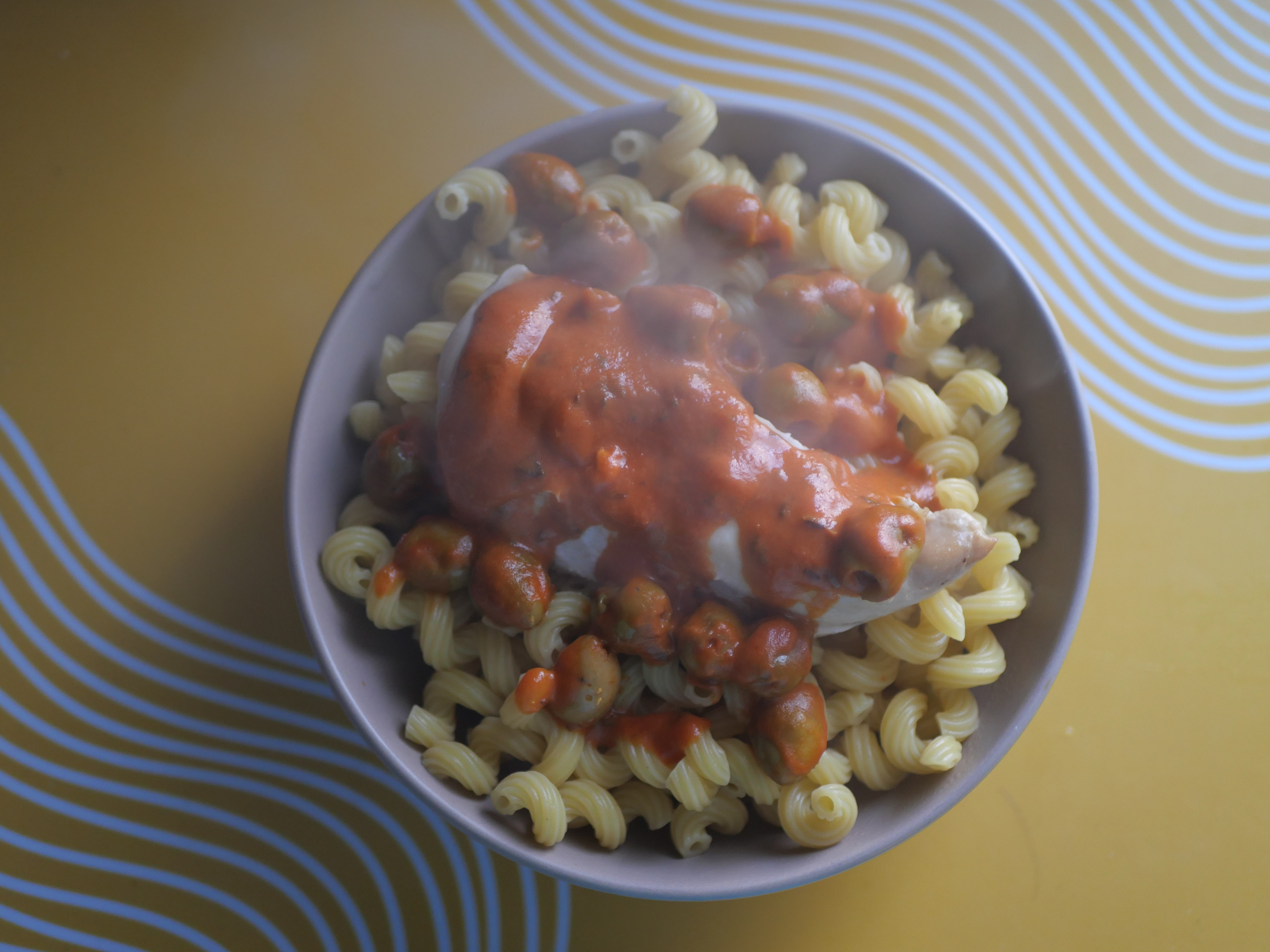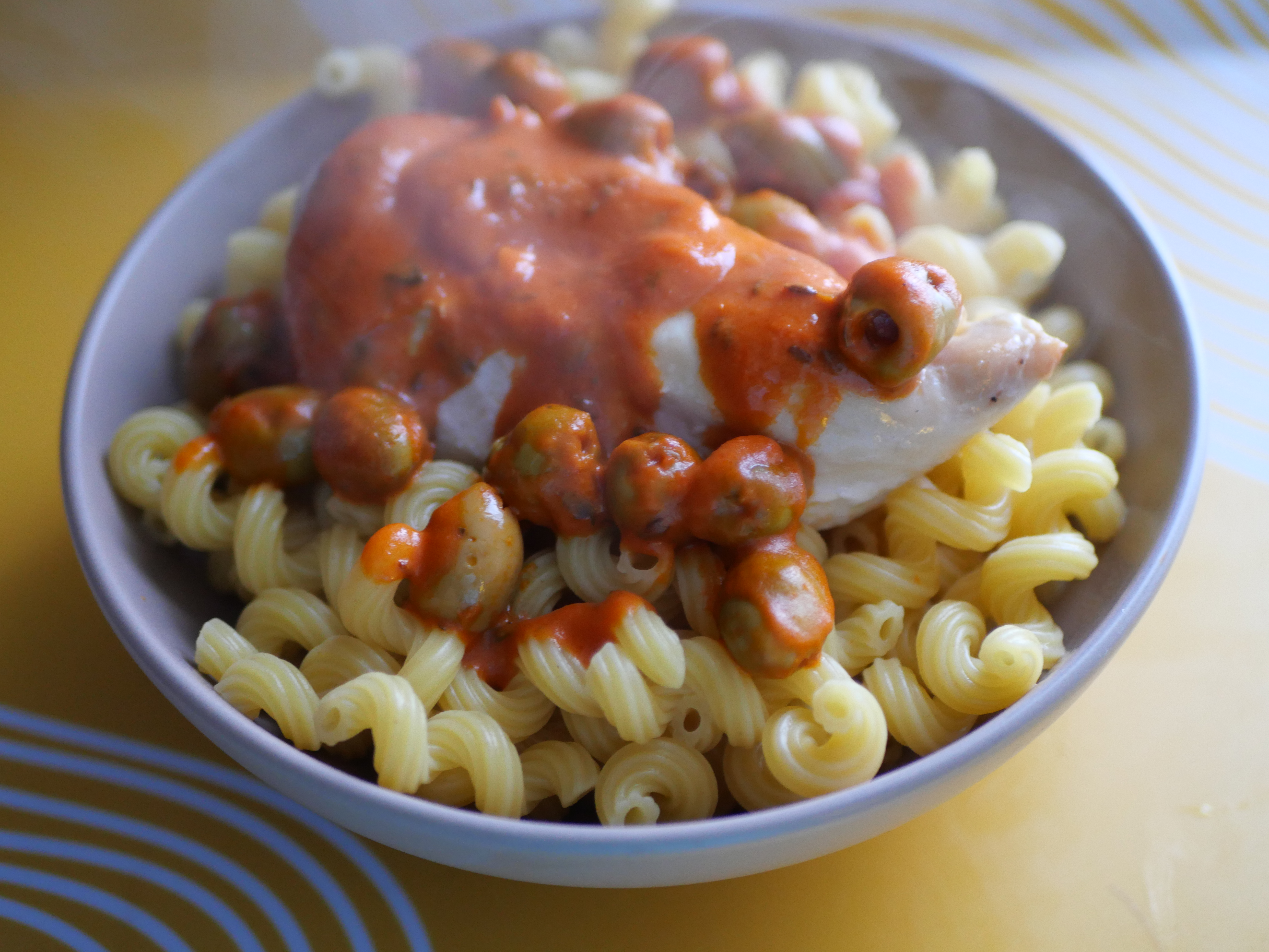 Salut à tous, une assiette de pâtes avec un reste de poulet, de la sauce tomate et des olives.