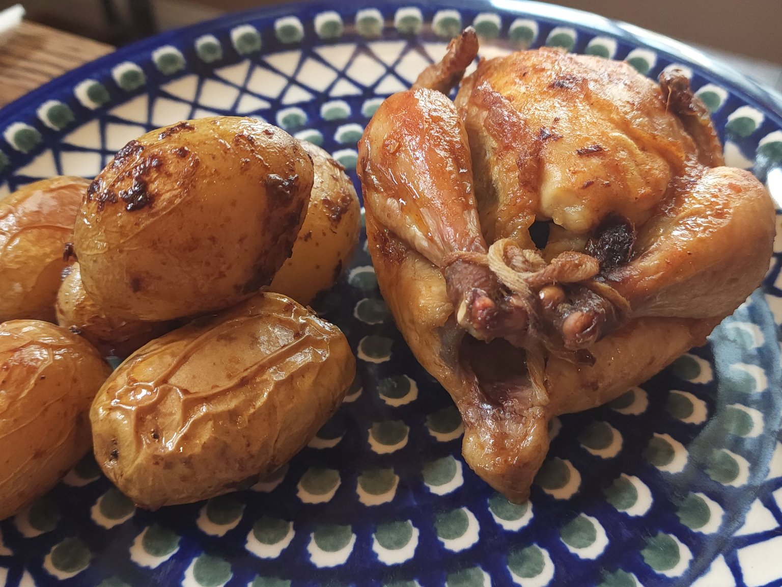 I did not time everything correct, so the chicken ended up sitting in the oven for some extra time, hence the slight shriveling in the pictures, but the drippings coated the potatoes in delicious flavoring, but a lot of it dried out and stuck to the pan. The Cornish hen doesn’t have as much fat content as a regular chicken, hence no drippings.