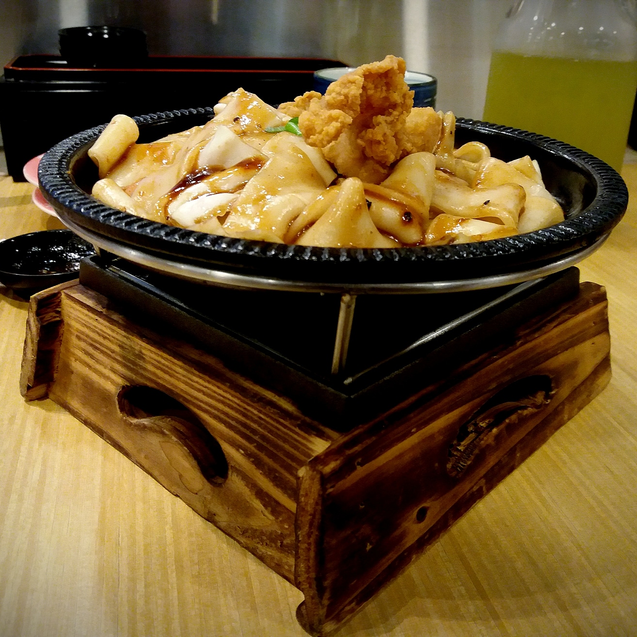 Kalau yang ini, mie goreng. Tekstur mie nya mirip mie tiaw. Lebar-lebar gepeng. Cuma, saya gak nyangka lebarnya sampe sebuku jari begitu. Dan ini disajikan di atas pot panas. Asli, dia akan senantiasa panas sampai akhir.