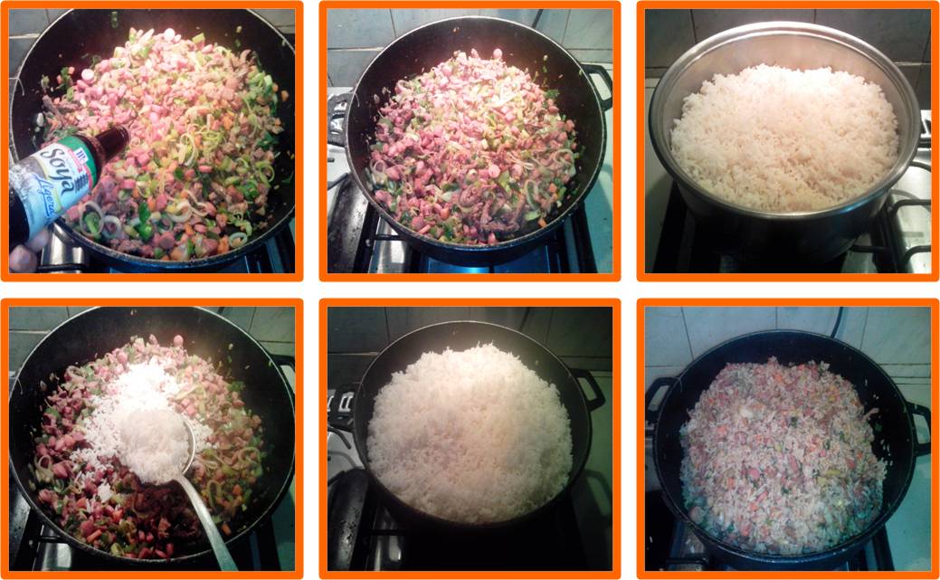 Start to add to our preparation the soy sauce mix with the wooden palette and with the help of a ladle add our ready rice from the previous day little by little, mix frequently with the palettes of about 6 minutes to avoid burning .