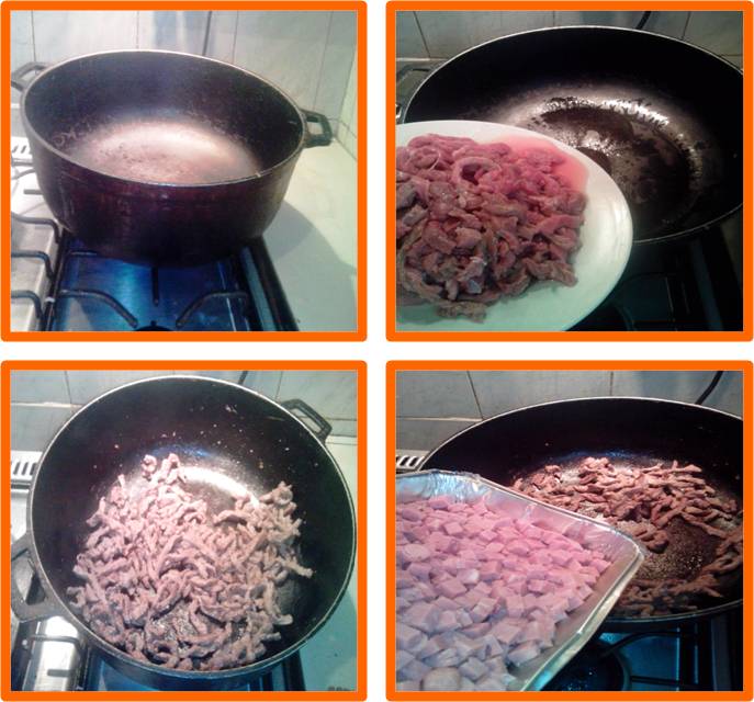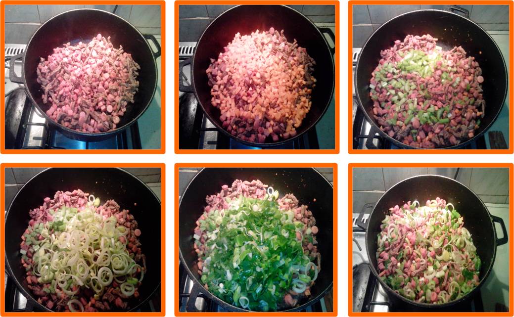Then we will sauté our meats and sausages. One by one in a time of 8 to 10 minutes maximum, add 2 tablespoons of salt and with the help of the wooden spoon move the meats and sausages constantly avoiding so that it does not burn.