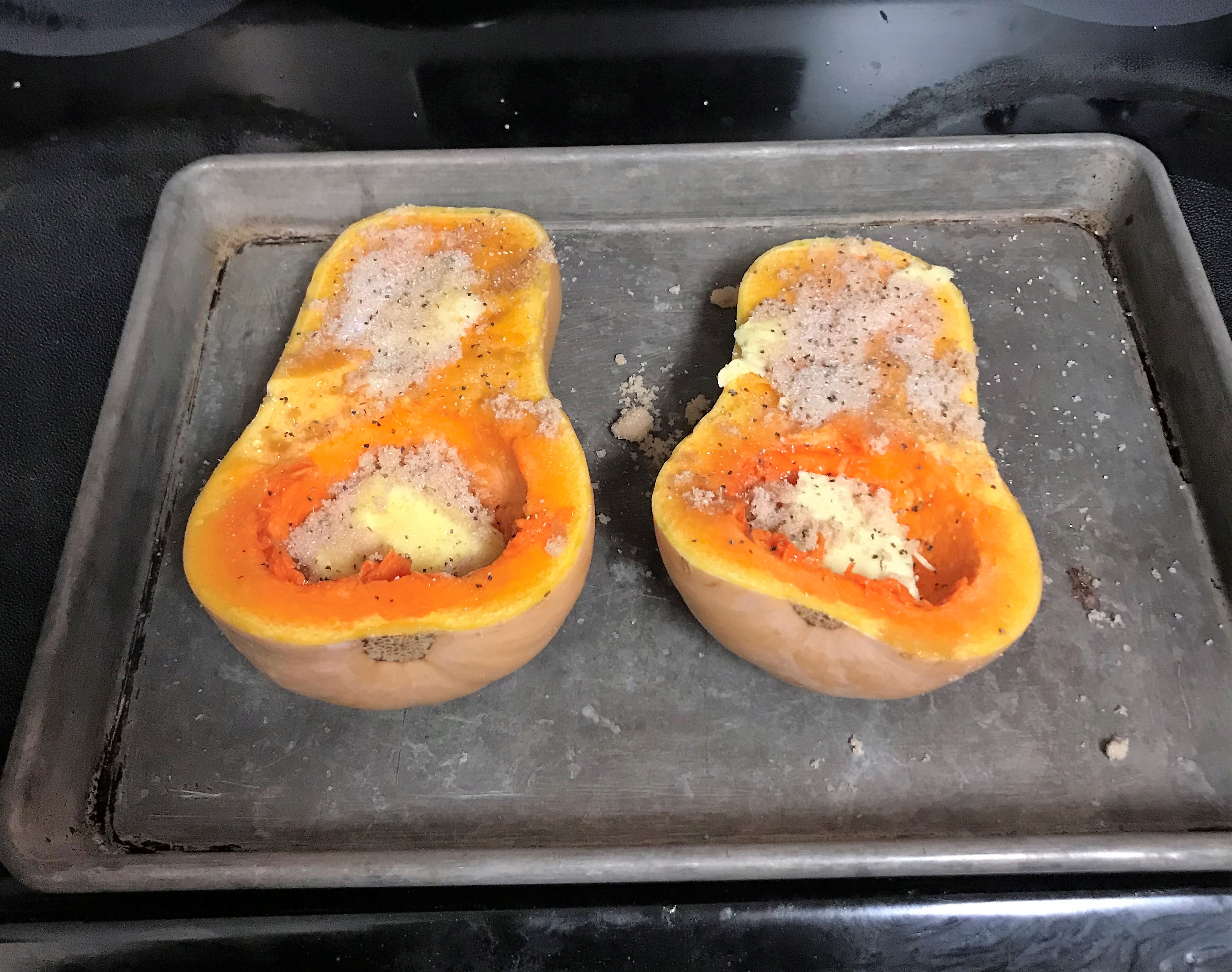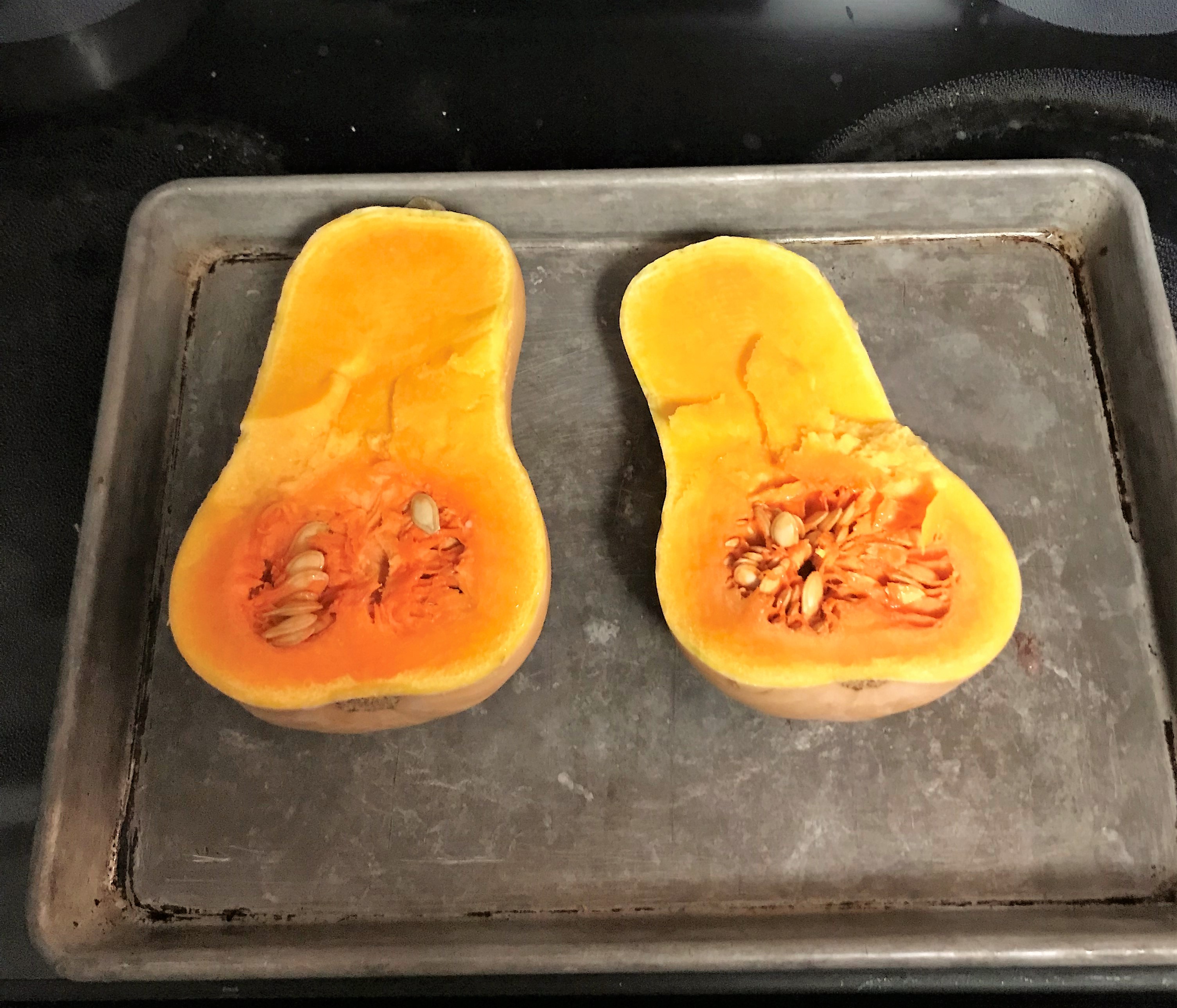 - Cut butternut squash lengthwise *caution butternut squash is difficult to cut, imagine trying to slice a solid pumpkin*