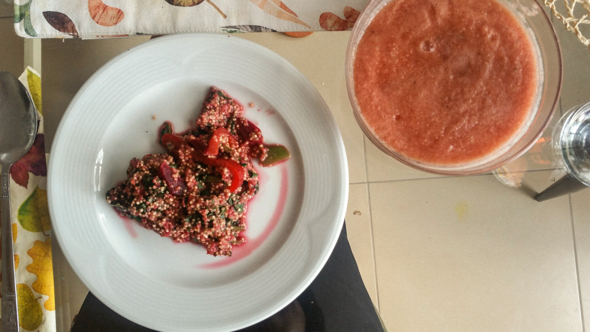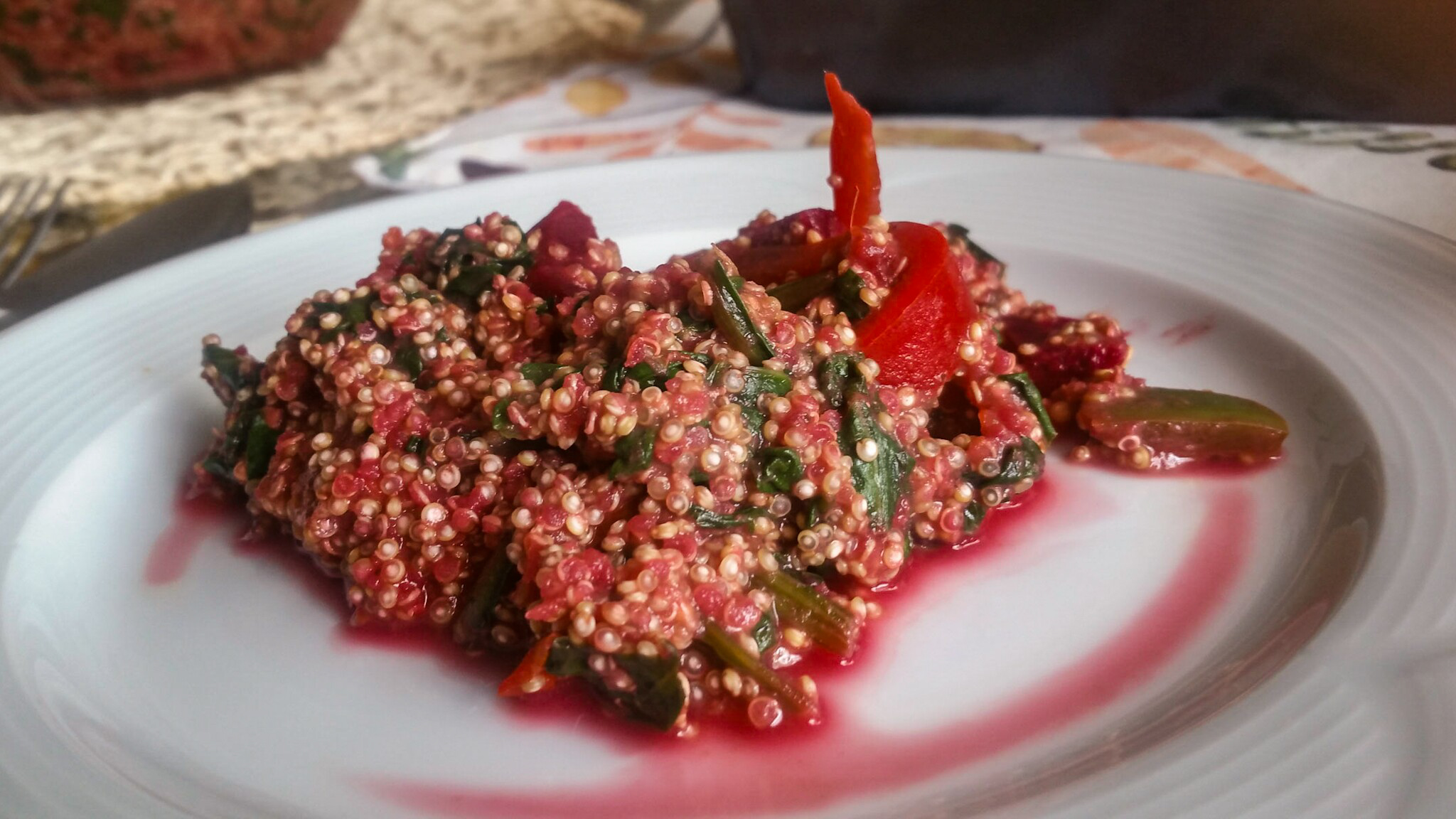And then, the fun part started :) I soaked quinoa in a bowl of water while I was cleaning the spinach and the beatroots. In about 30 minutes, I put the quinoa in a pen with the beatroots by adding black grounded pepper and olive oil. I also have this seasoning of grounded vegetables and salt sea which is used instead of pure salt and make everything more yummmy. After 10 minutes of low heating, I added some spinach and on top of it all, a sliced red pepper.