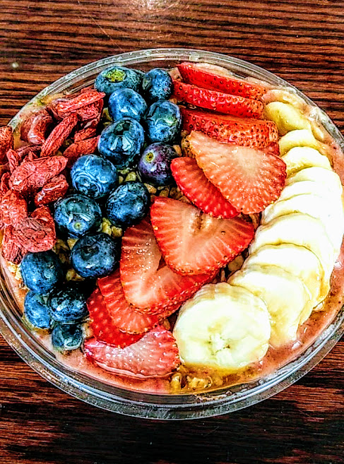 This super delicious acai bowl is made with all organic fruits. It is a combination of acai, frozen banana, frozen strawberries, and orange juice blended together to create the perfect sorbet. It is also topped off with blueberries, sliced strawberries, sliced banana, goji berries, and granola and honey.