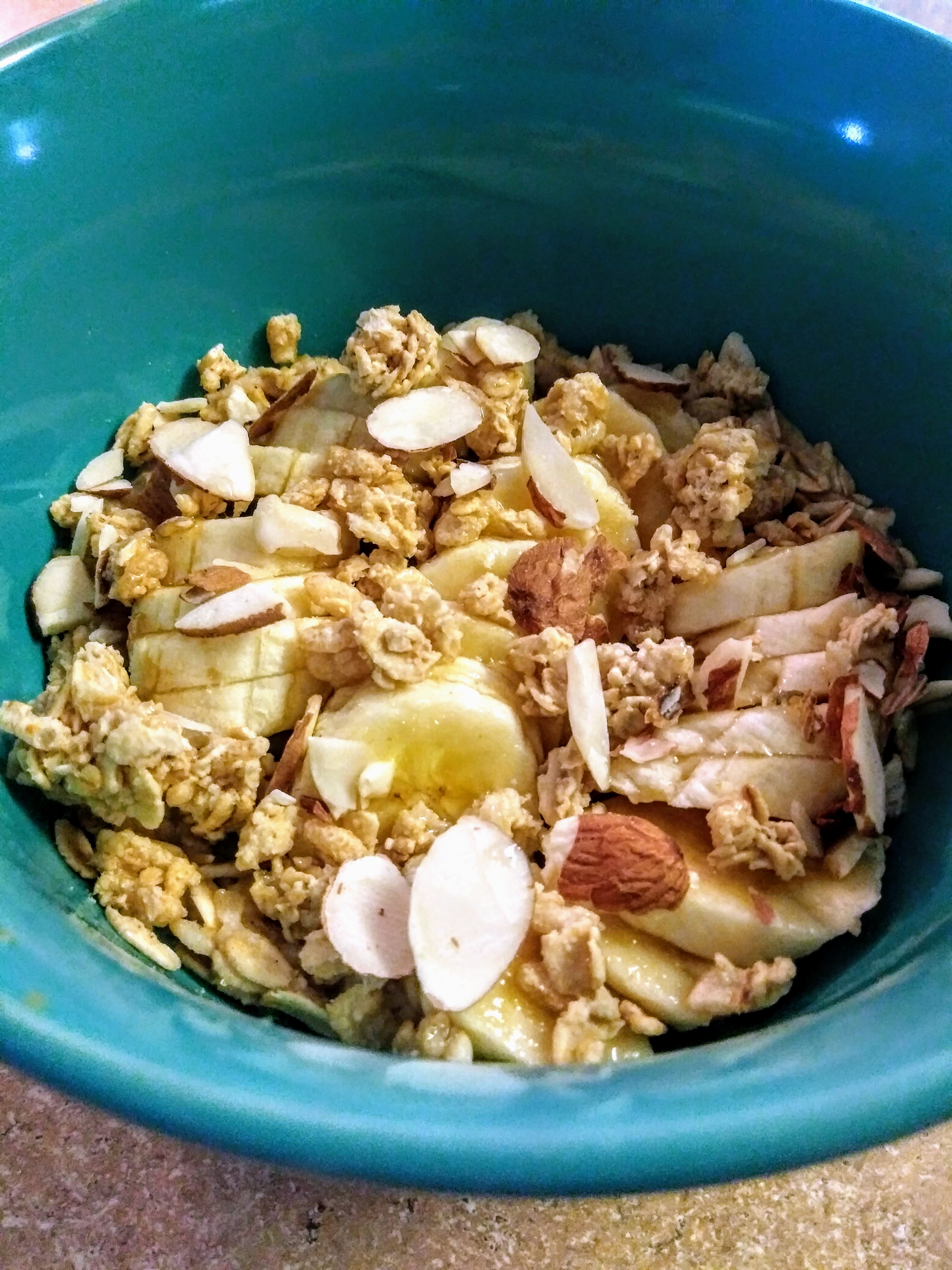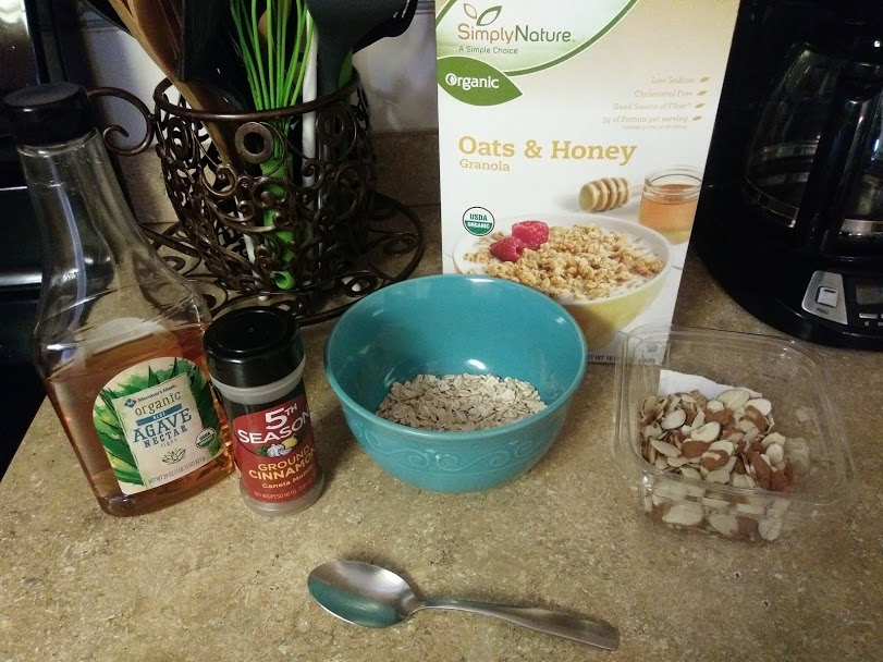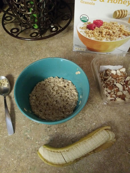 Slice 1 banana and put it in your oatmeal, then top it off with your choice of granola, sliced almonds, and drizzle it with agave nectar (optional).