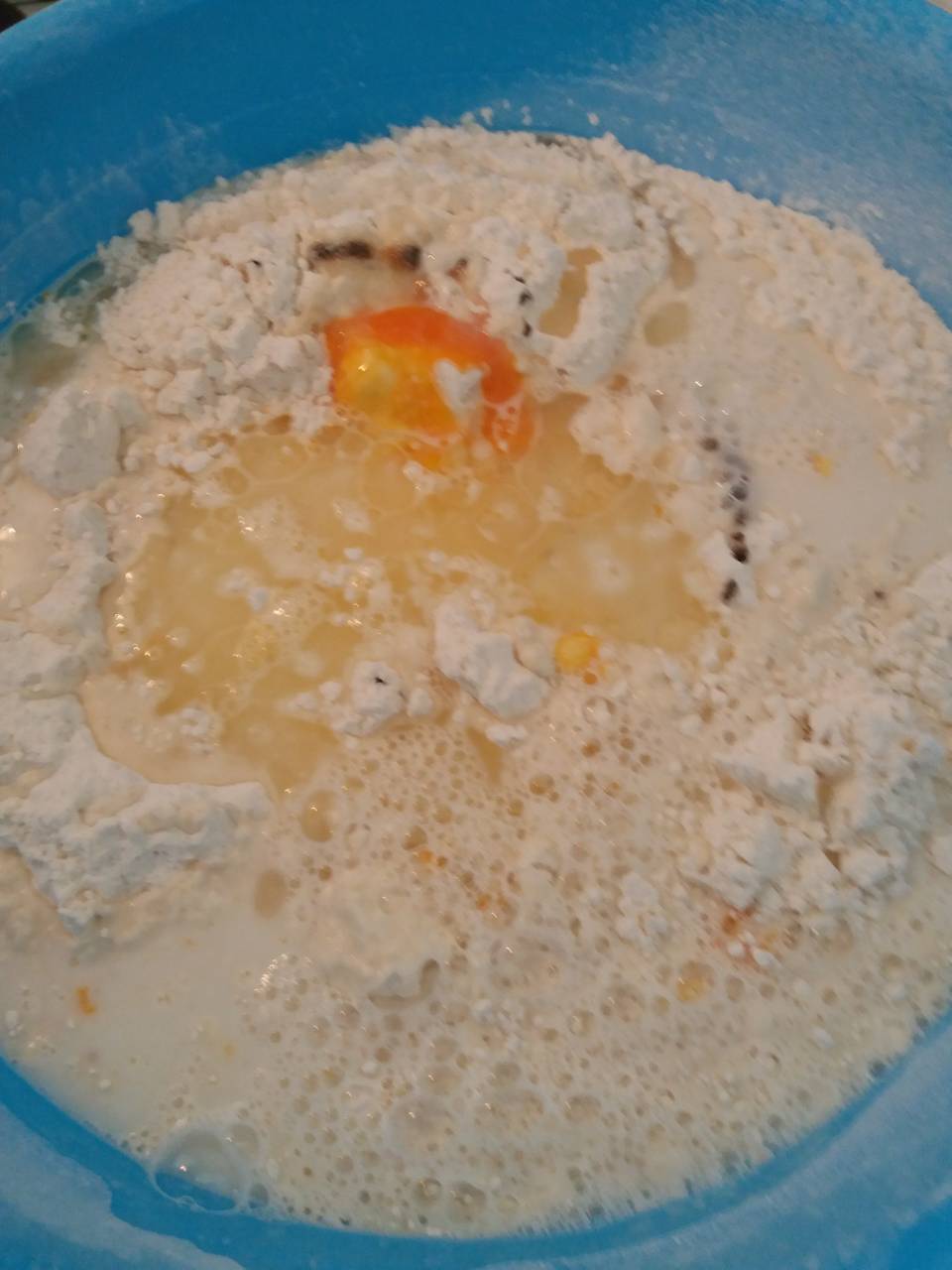 Then add the milk, water and oil and mix again, making a dough.