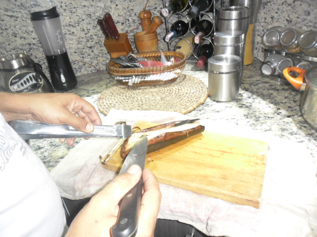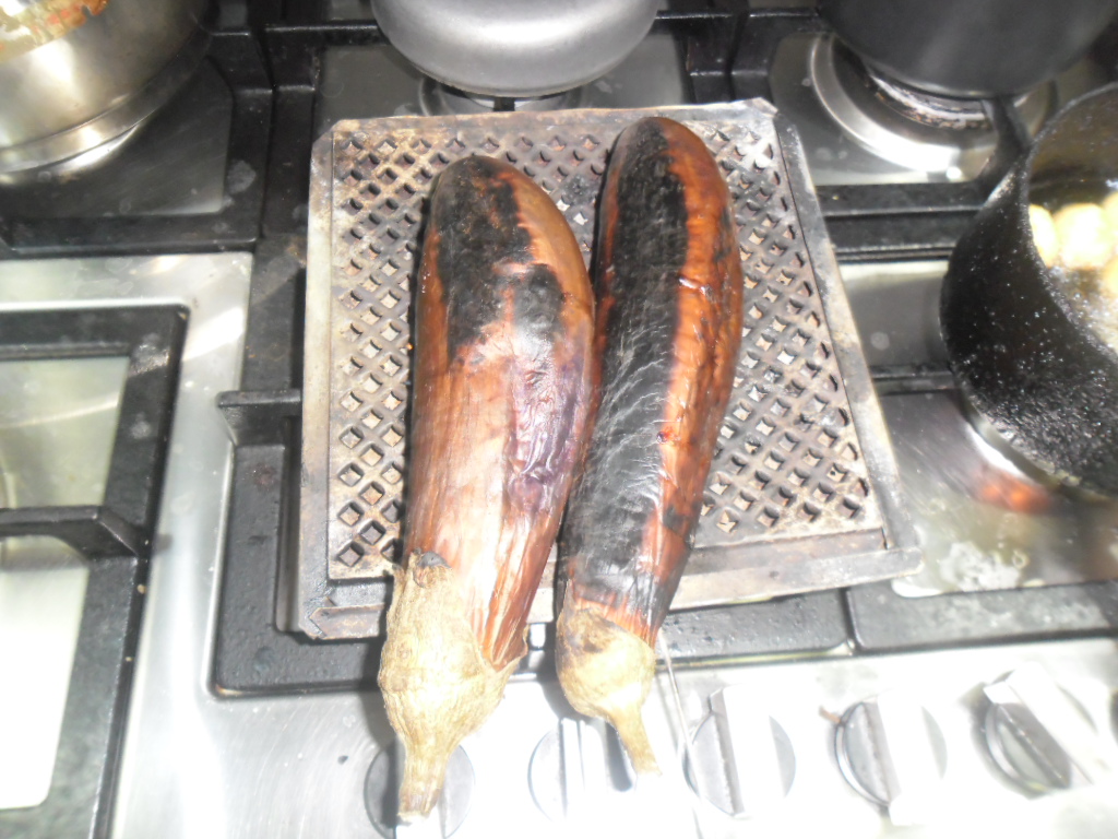 - After the aubergines are well roasted, if not, let them burn completely on the outside, so that they give the smoked flavor, peel the aubergines to remove the burnt shell.