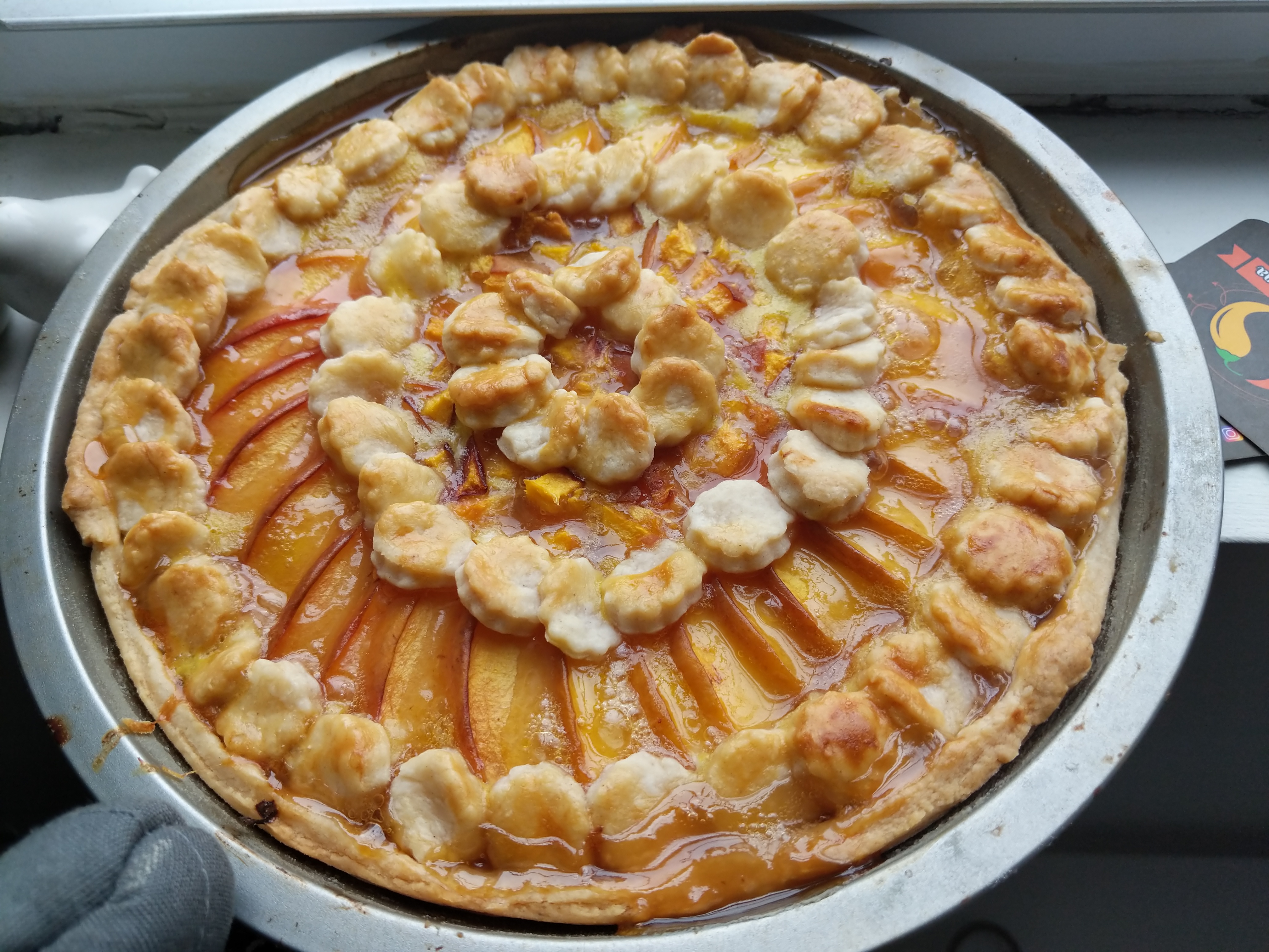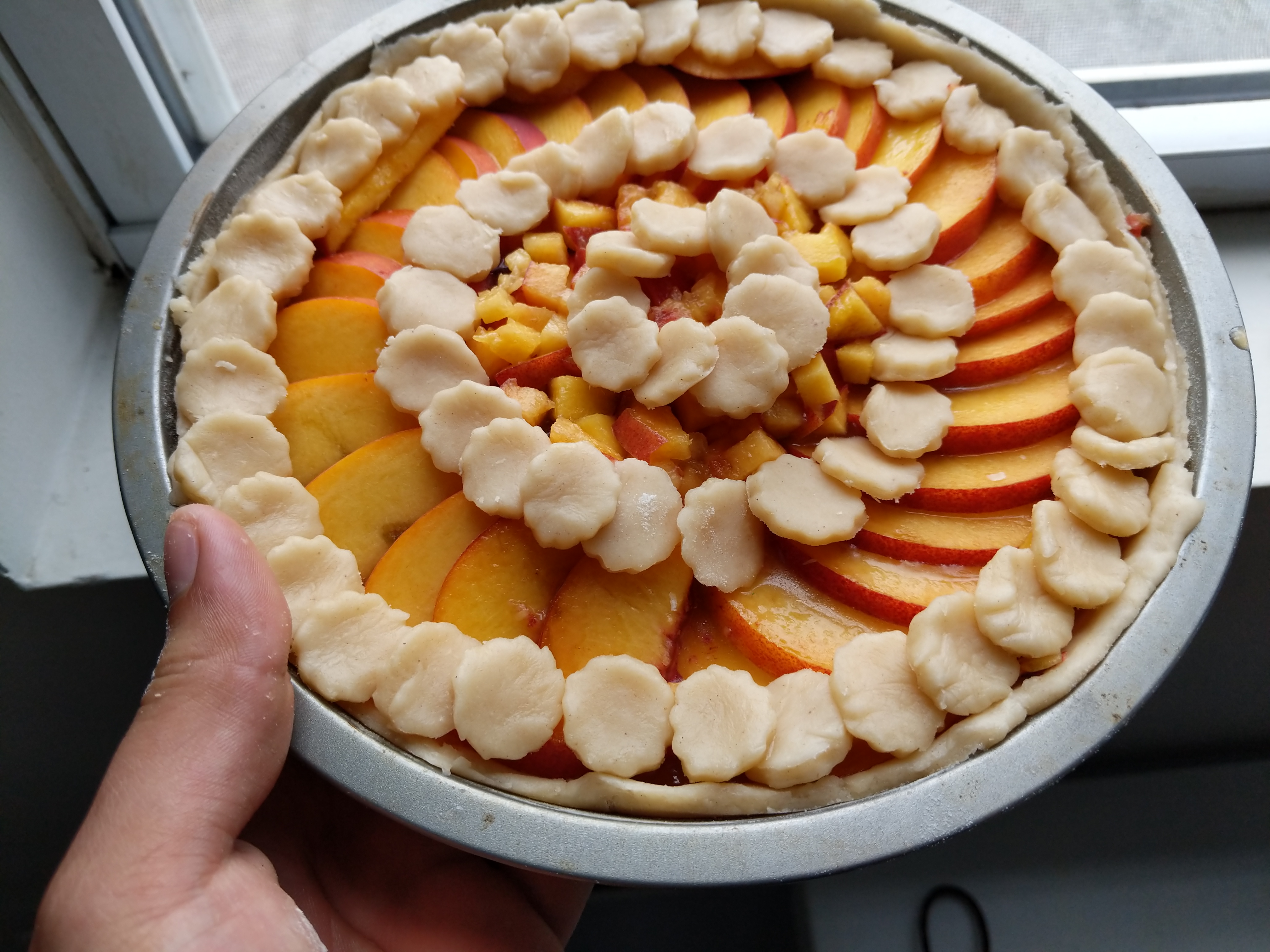 - Roll your dough and put it in your baking pan , bake your dough for at least 10 min at 350F/180C , one its done it might be still be raw but this we will bake it again so do not worry , after this stuff you dough , you can stile your dough as you want, I saved some peaches to give my pie a nice look.