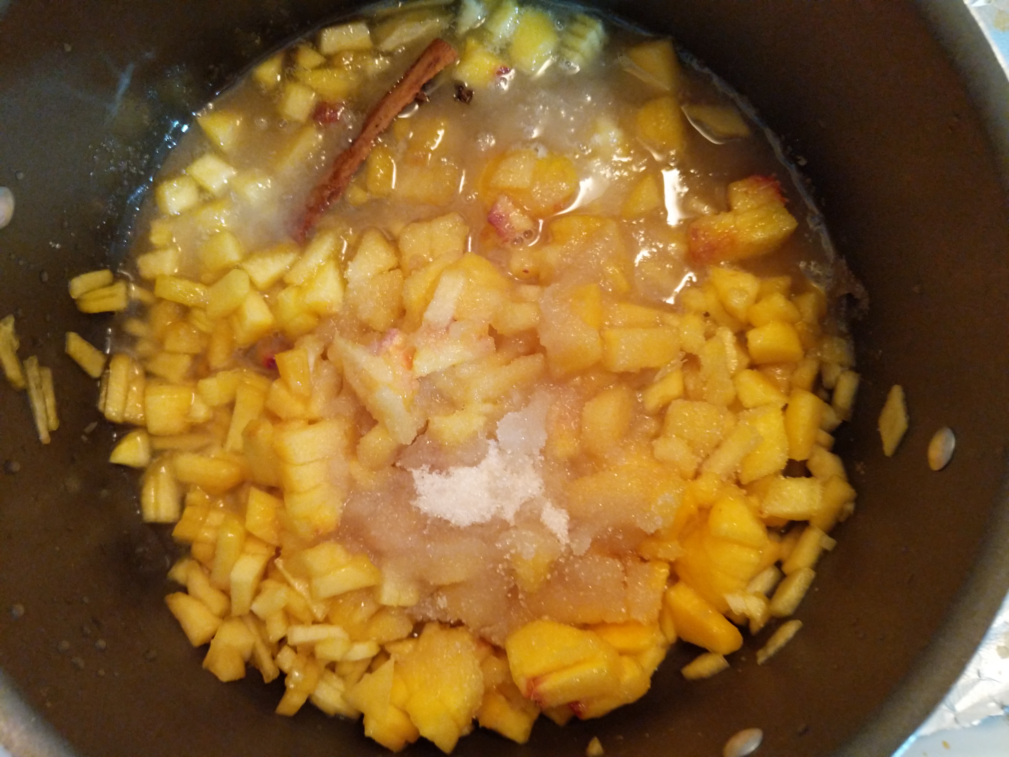 - For the stuffing , in a pot add butter , sugar , cinnamon , cloves , peach , salt and let it cook , for at least 15 min in low/medium heat , once its cooked remove cinnamon and cloves then dissolve the cornstarch in the lime juice and add it to the stuffing let it get to a boil and turn it off.