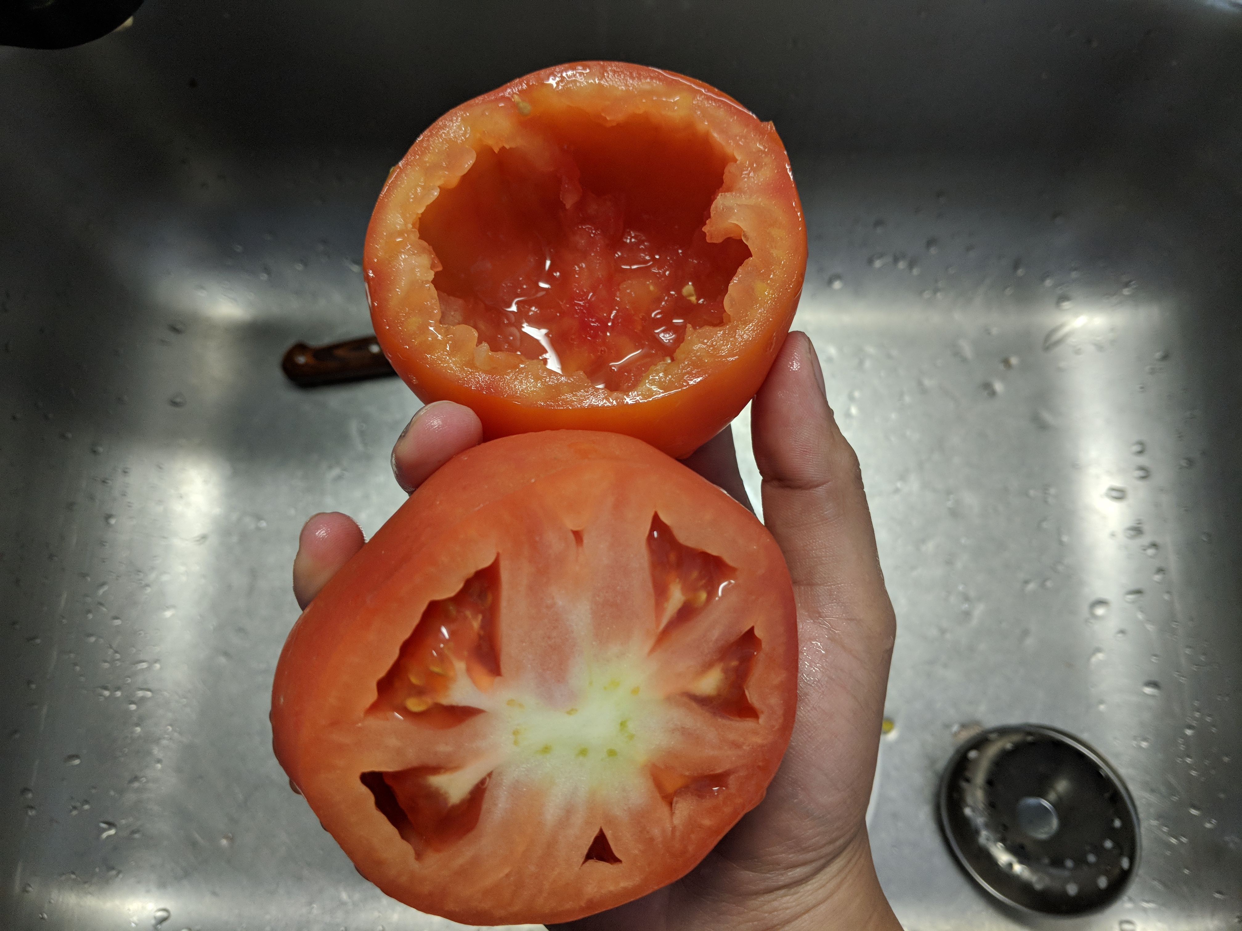 - Cut the top of the tomatoes , then the inside of the tomato with the spoon or small knife , then add a pinch of salt and tablespoon of oil