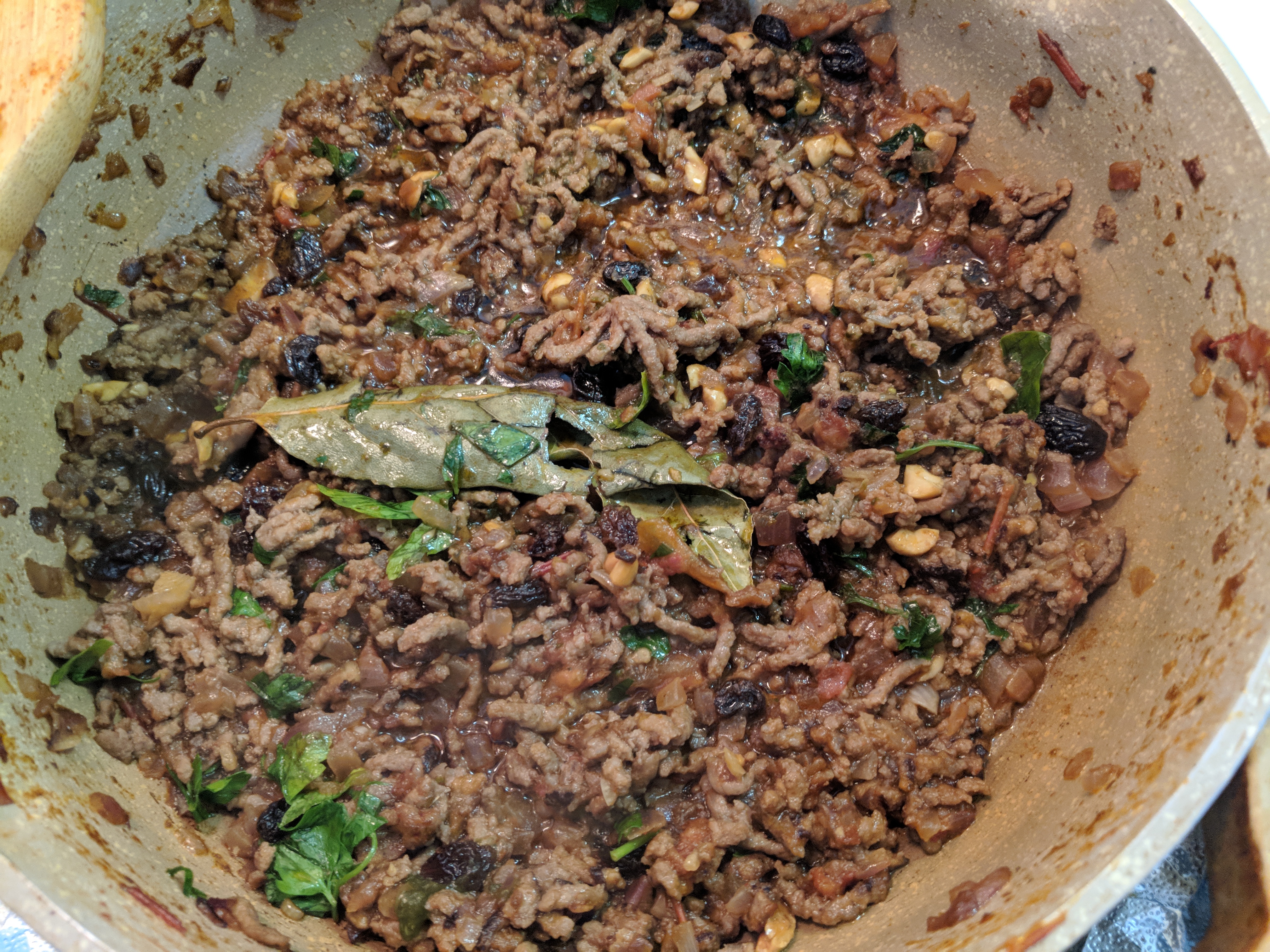 - In a pot add 2 tablespoons of oil , add meat , cook for 5 min or so and reserve, in the same pot add onions, garlic , tomato, ají panca , huacatay paste, bay leaf and let it cook for another 5 min or so. once its cooked add milk , cheese , peanuts , Kalamata olives , eggs , salt and pepper stir and stuff your tomatoes.