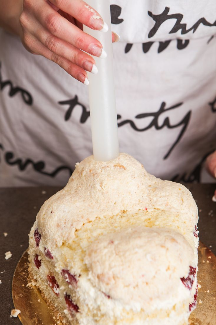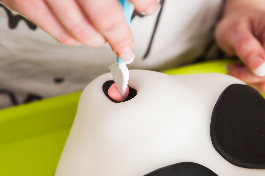 4 ) Shape panda with a sharp knife from the base. You want to achieve a little "oval triangle" so that the underside of the cake will be a chin.