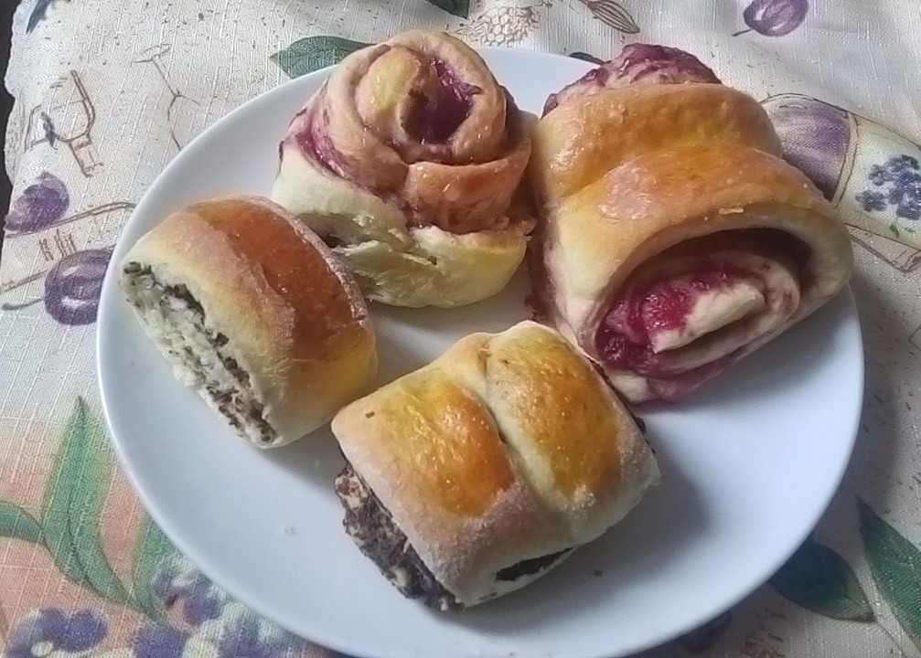 Welcome. Today I made my own sweet yeast rolls with poppy seed mass, strawberry jam and cherry jam. I recommend they came out very delicious. If you want a recipe, write in the comments and I will add it to the next post.