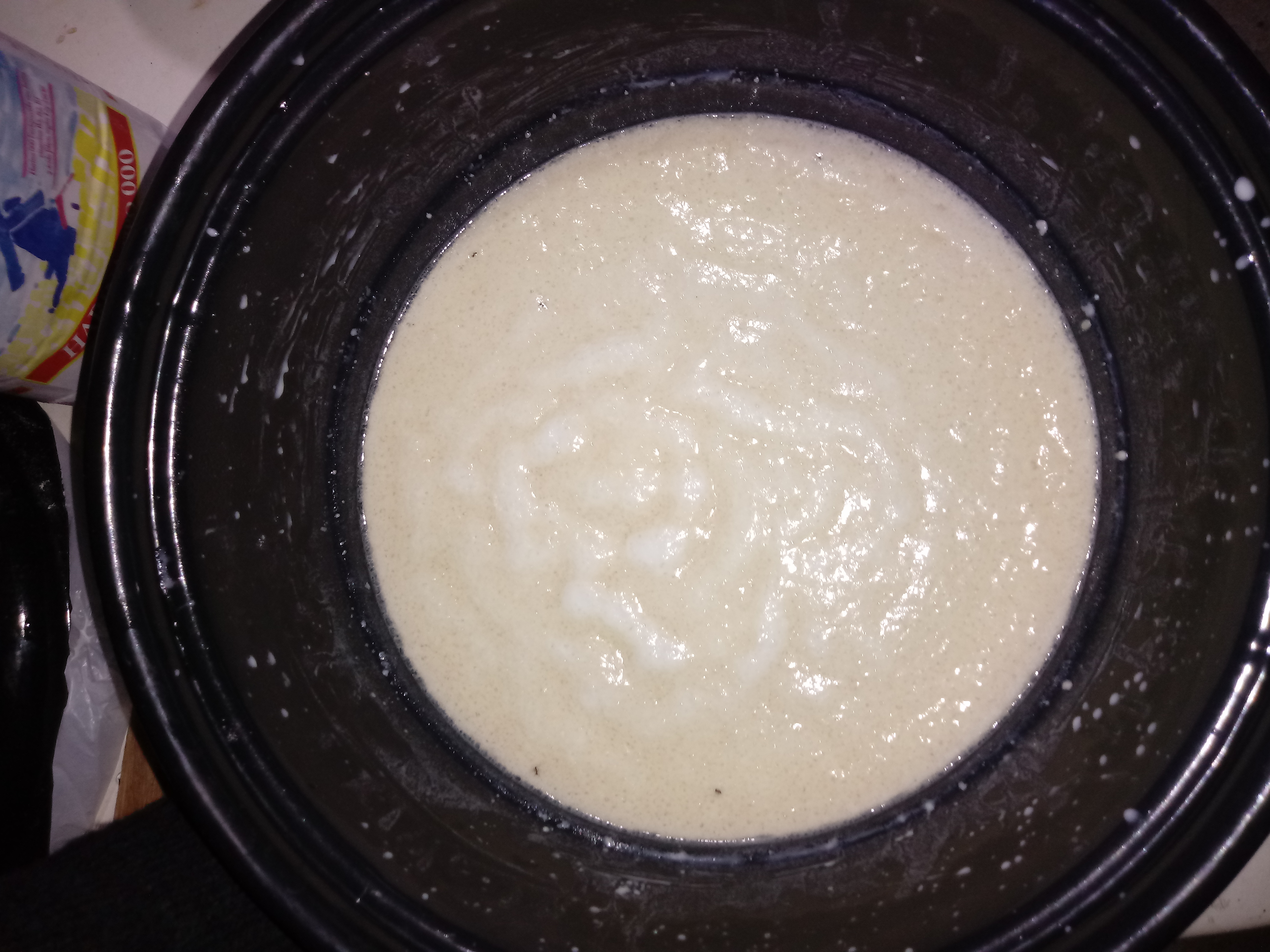 2.- En un bol, echar el agua tibia, la levadura, el aceite y 5 cucharadas de harina. Mezcla bien y cuando esté todo bien integrado, tapa con un paño y deja reposar a temperatura ambiente hasta que la mezcla este espumosa.